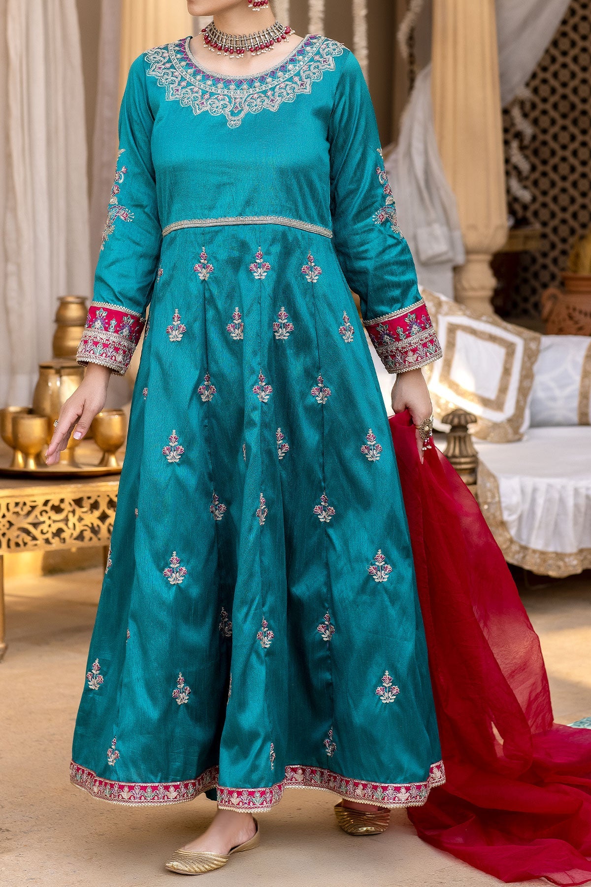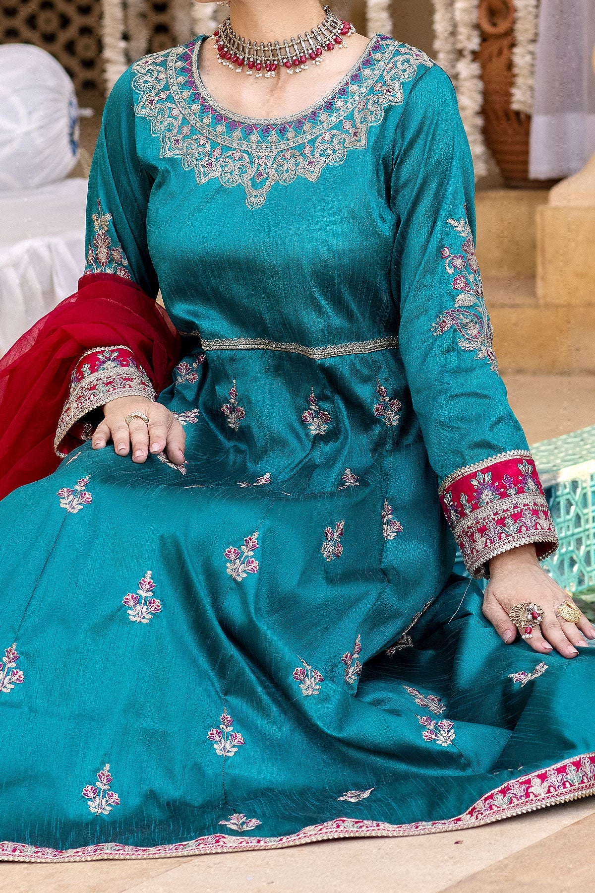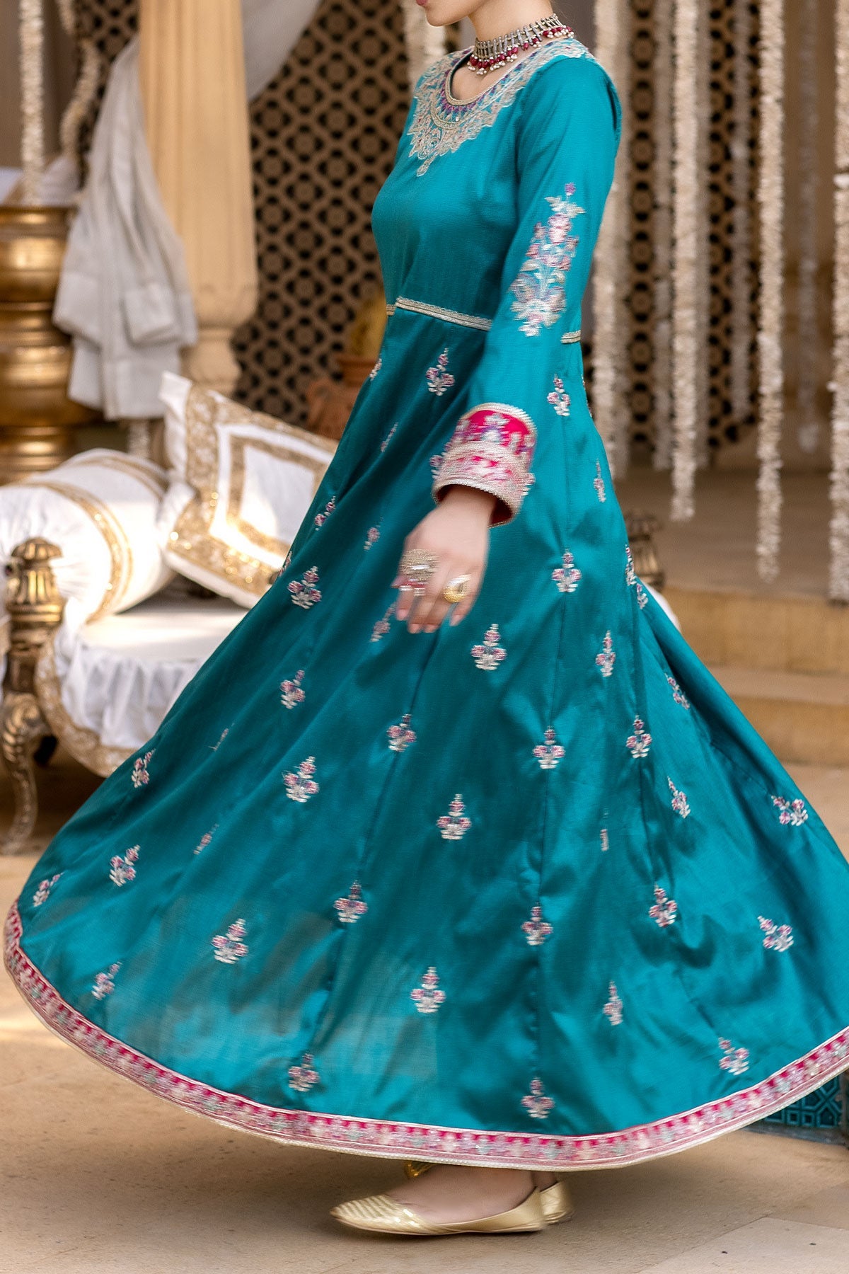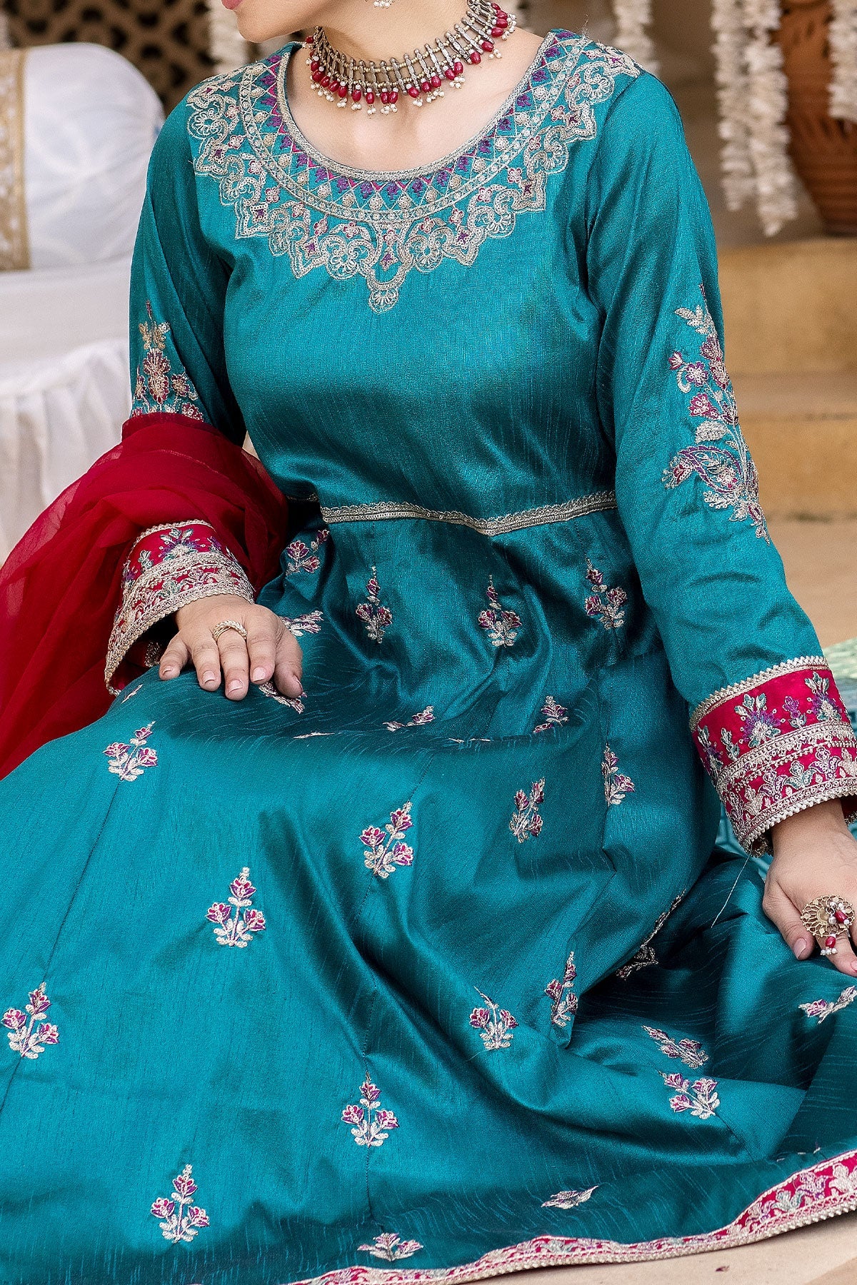 Look dazzling in Eid collection Anarkali frock! Crafted carefully with Indian raw silk, this look is finished with a contrast organza dupatta for a majestic appeal. Get ready to stun in this stylish dress!