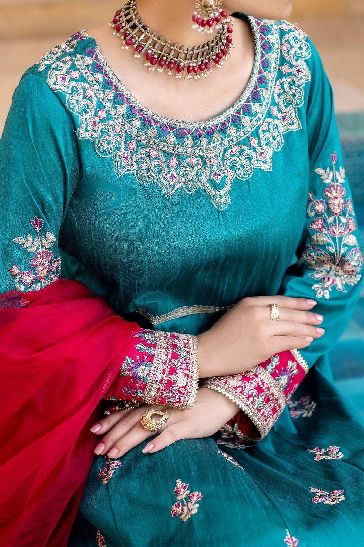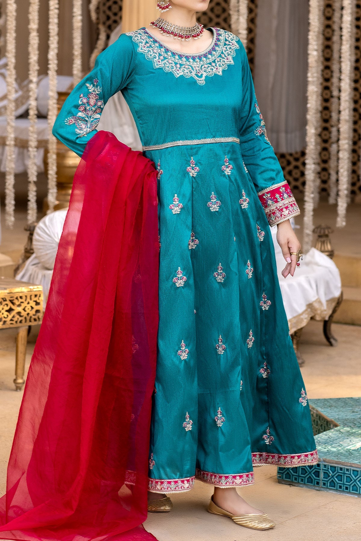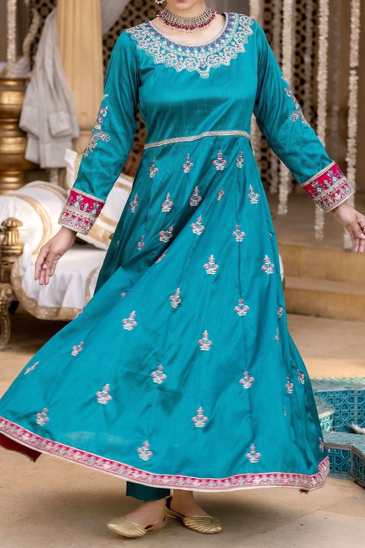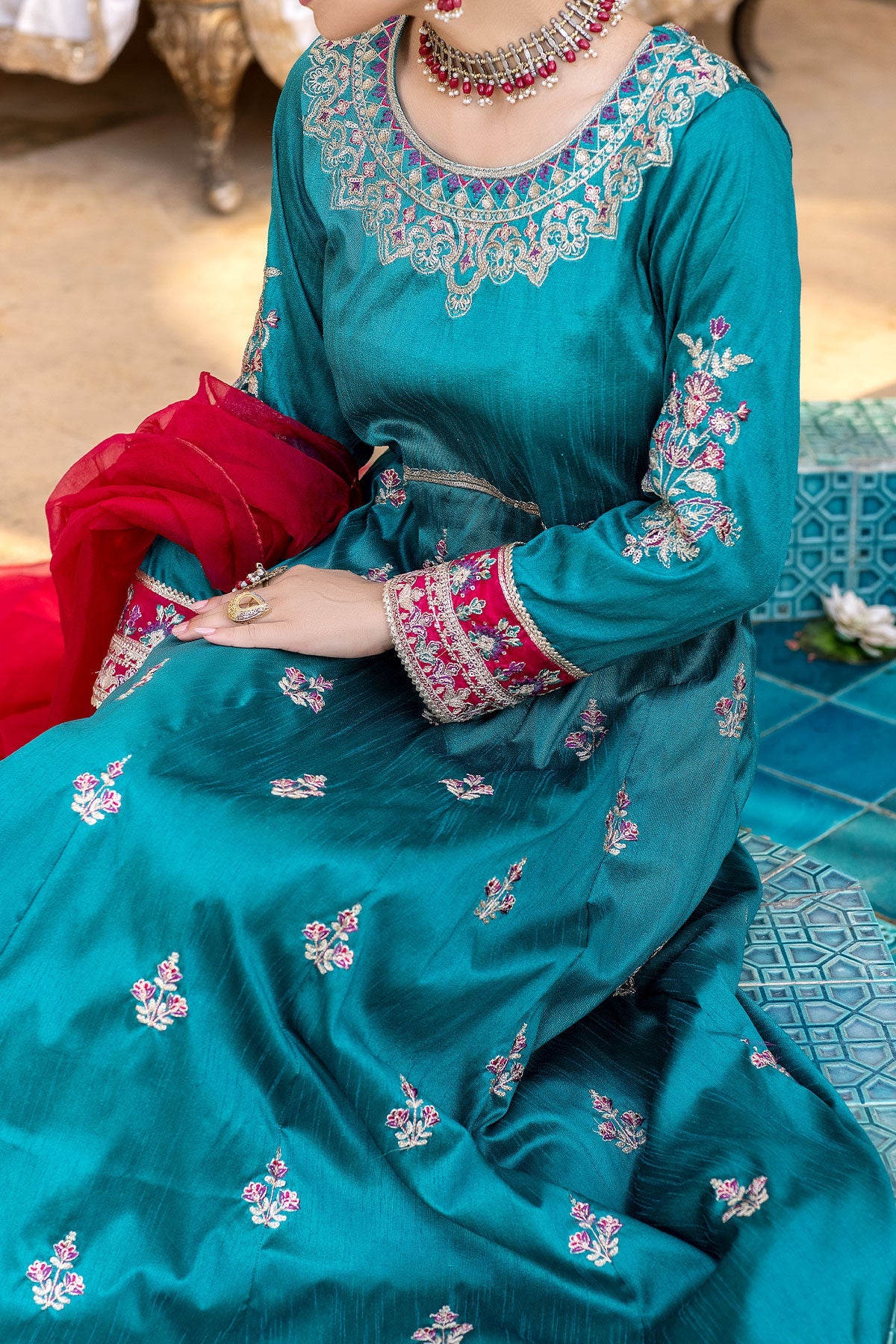 Look dazzling in Eid collection Anarkali frock! Crafted carefully with Indian raw silk, this look is finished with a contrast organza dupatta for a majestic appeal. Get ready to stun in this stylish dress!