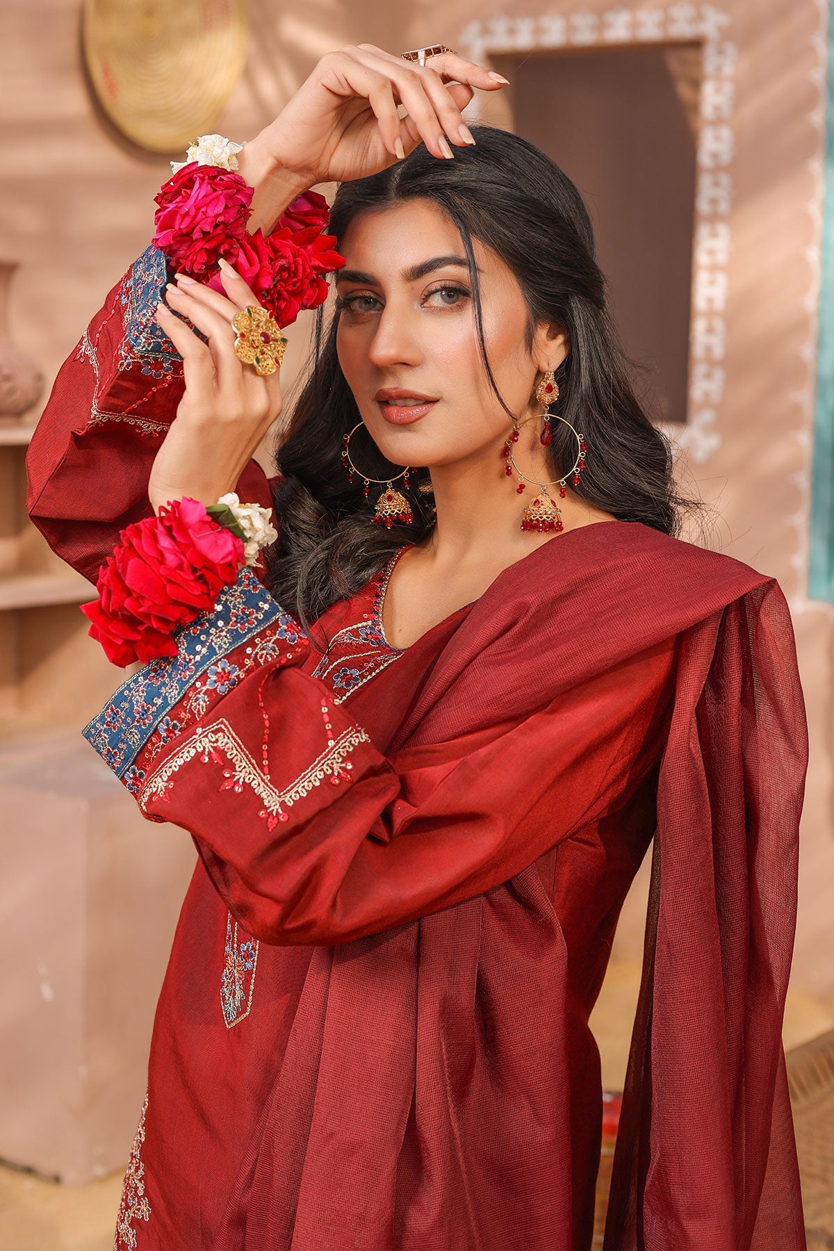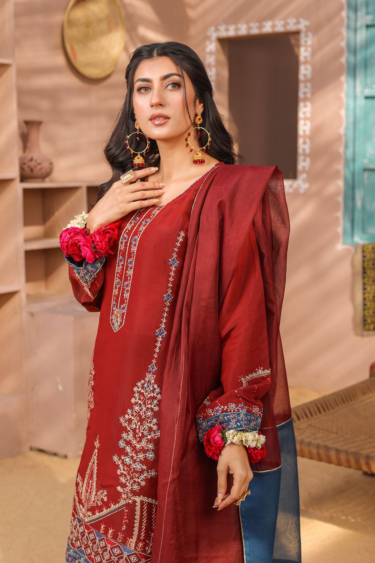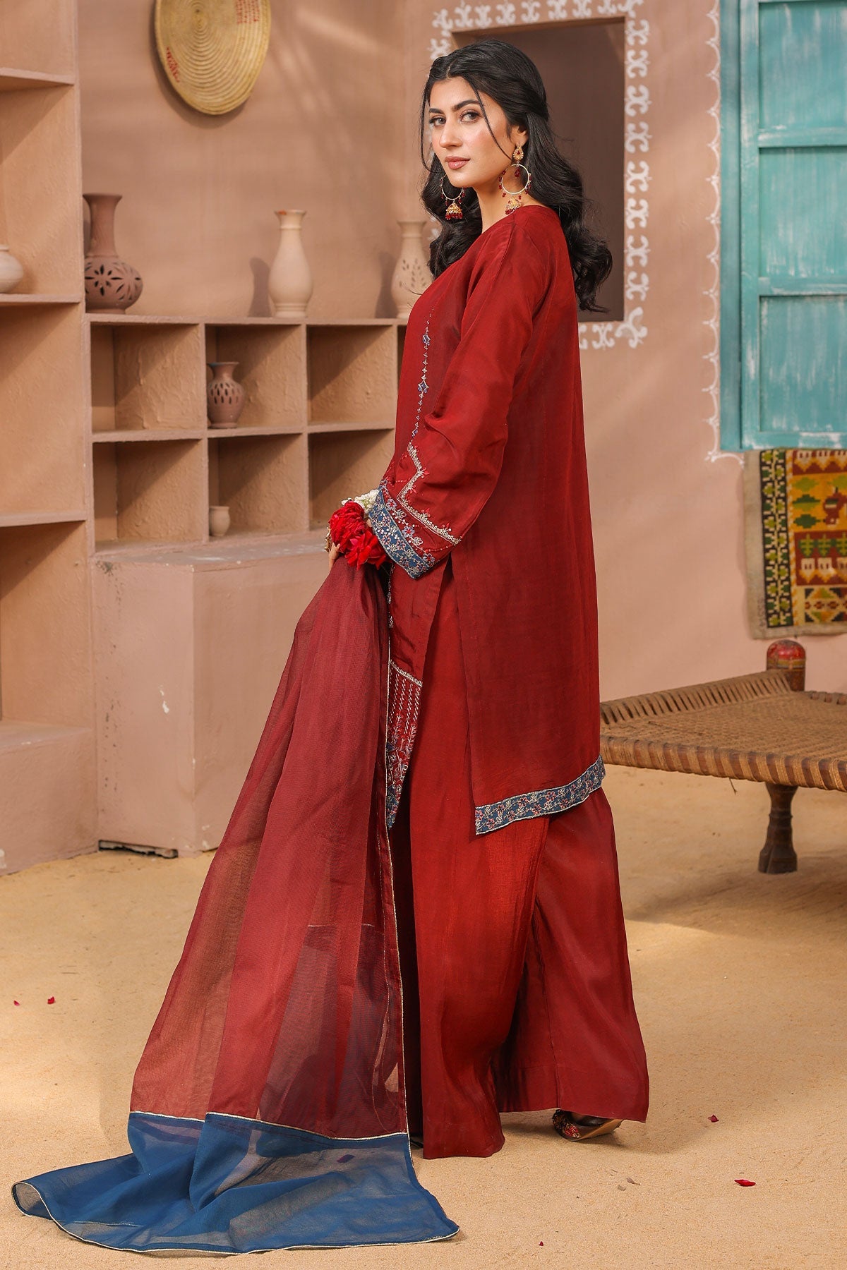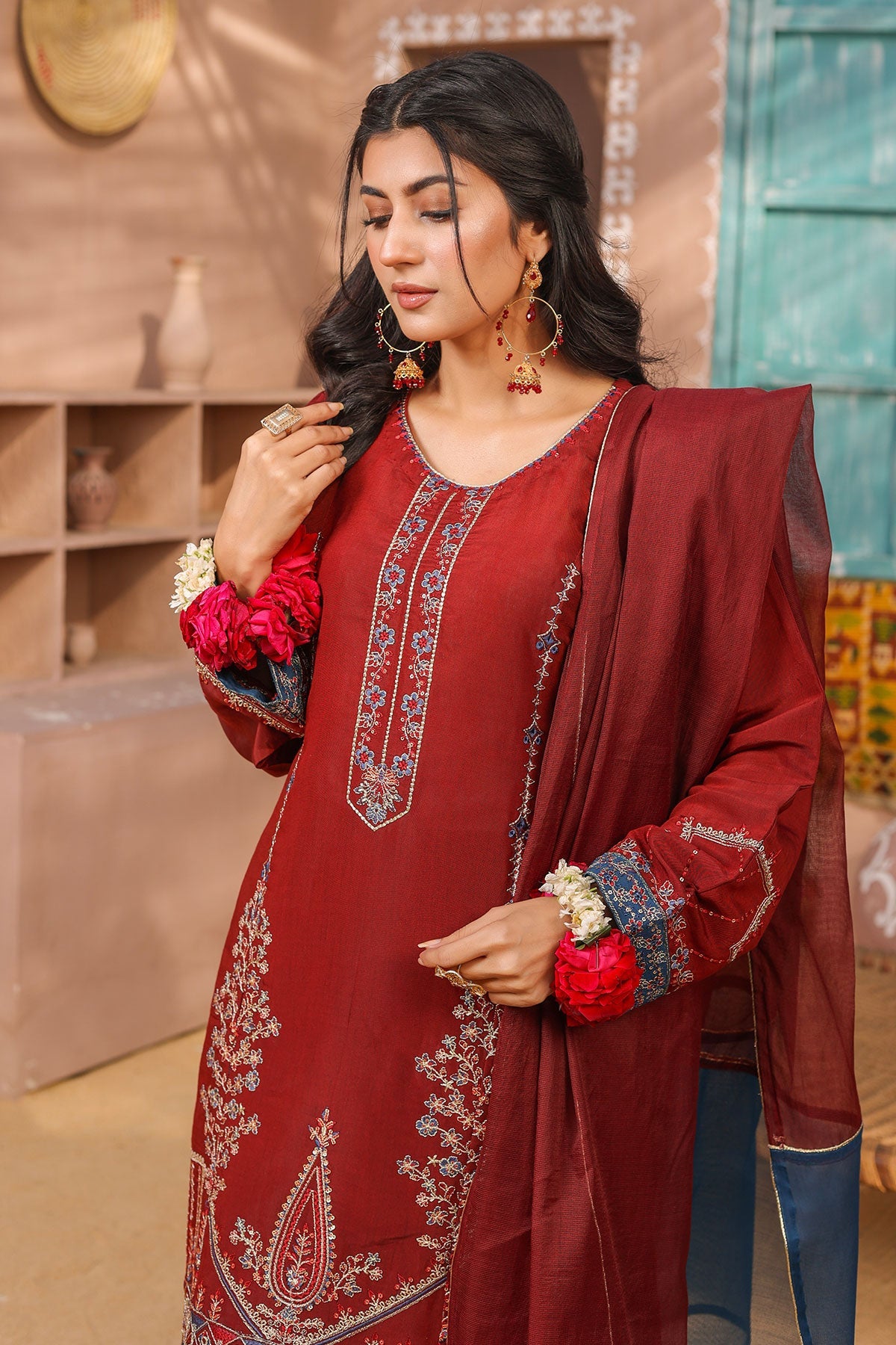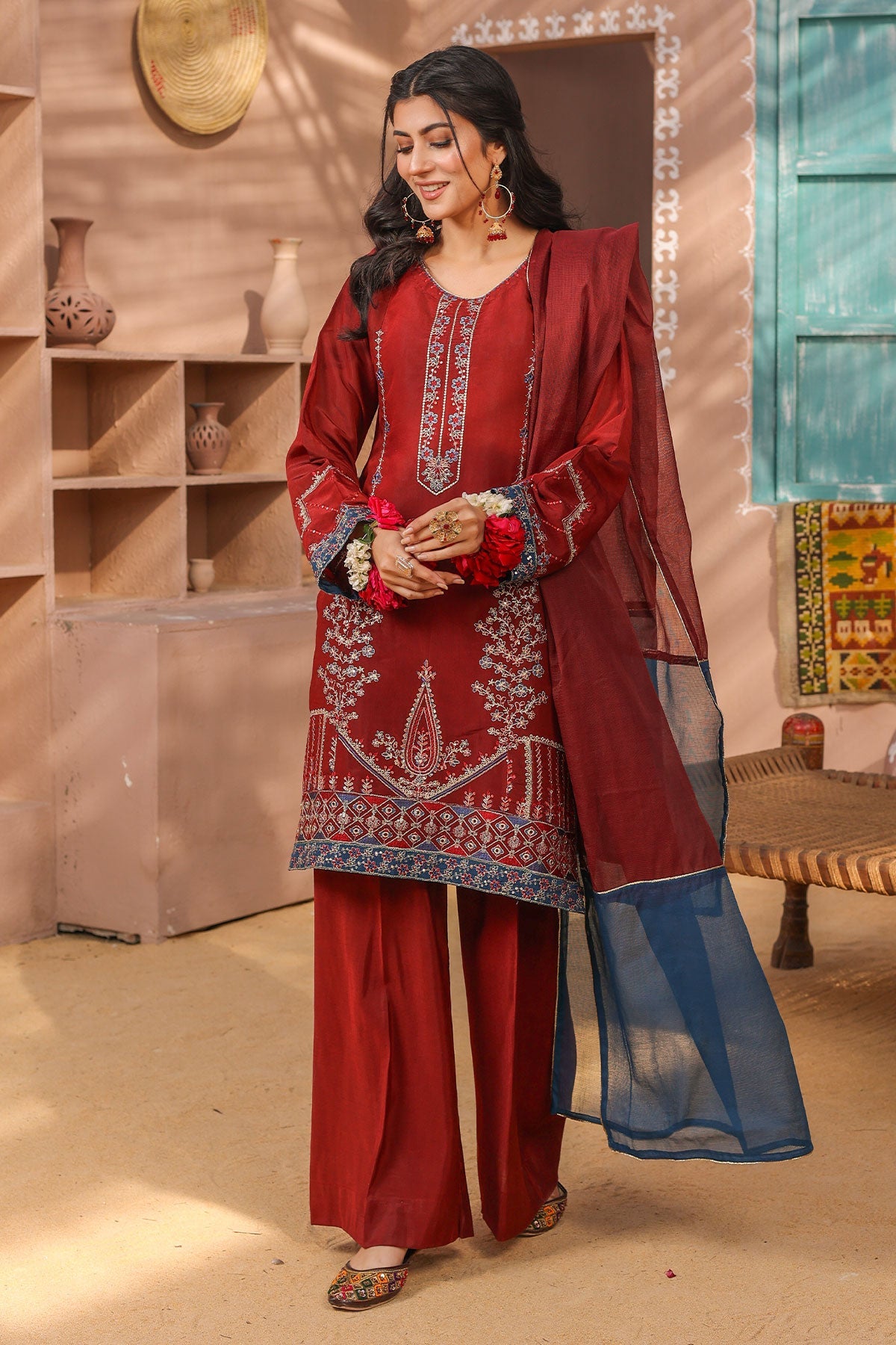 Stunning features eye-catching embroidered details on both the front and sleeves of the viscose fabric. The back is elegantly plain with a delicate embroidered lace, while the trouser and dupatta complete the look with graceful simplicity.