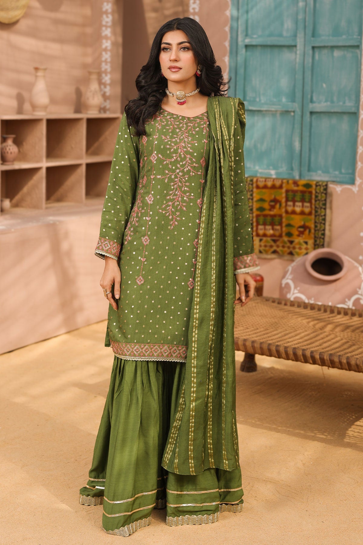 Elevate your style with the RNF-11 outfit. The embroidered front and sleeves on cotton katan add a touch of elegance to this piece, while the plain back and viscose plain garara provide comfort. Complete the look with the diamond line plain dupatta finished with goti lace.