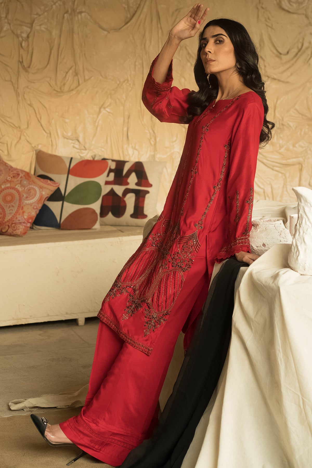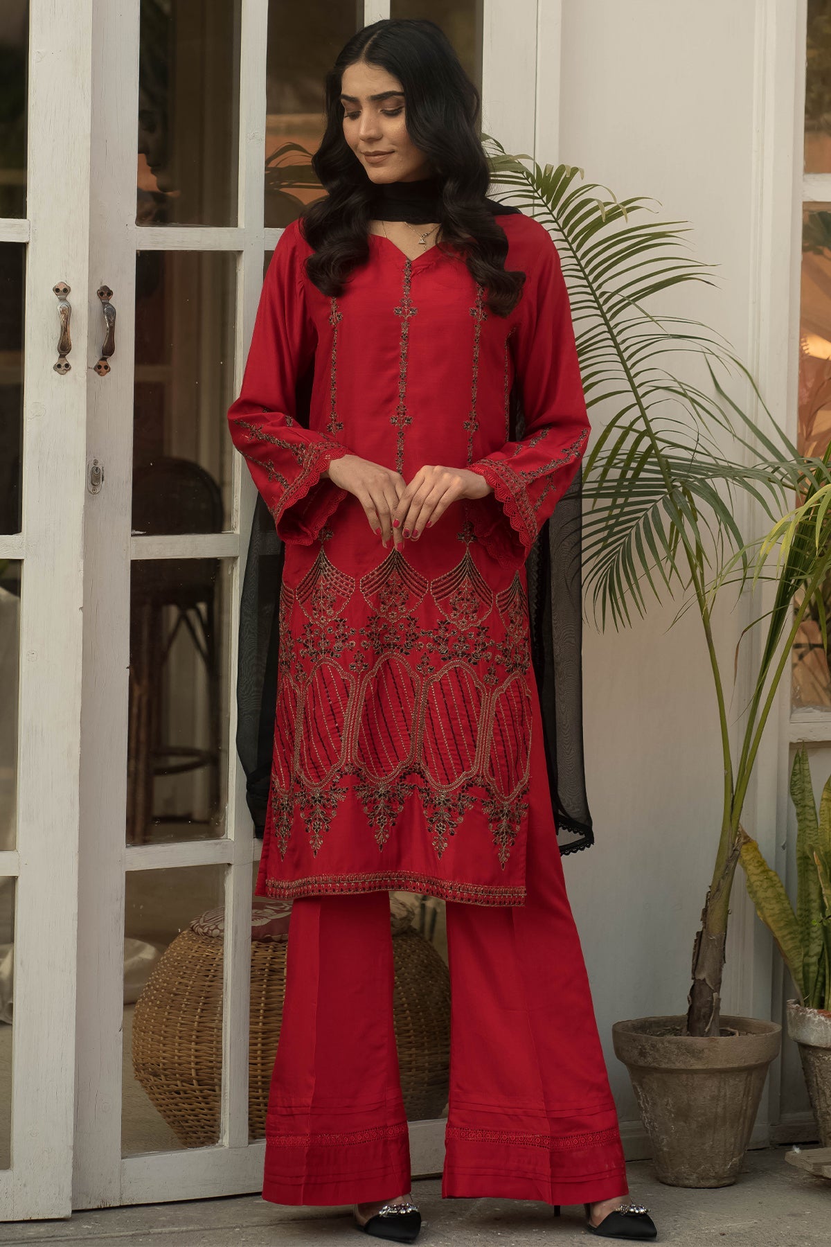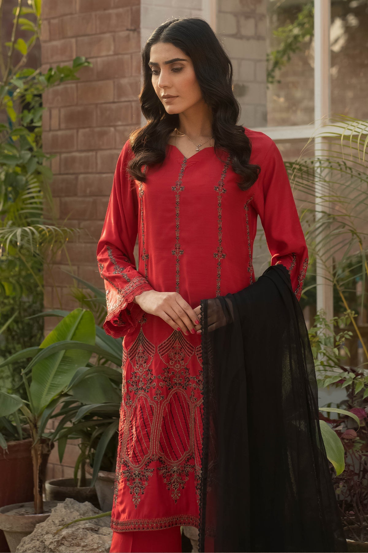 Elevate your style with embroidered front and sleeves on viscose fabric. The bell bottom trouser and chiffon dupatta with laces add an elegant touch. Perfect for any occasion, this outfit exudes confidence and sophistication.