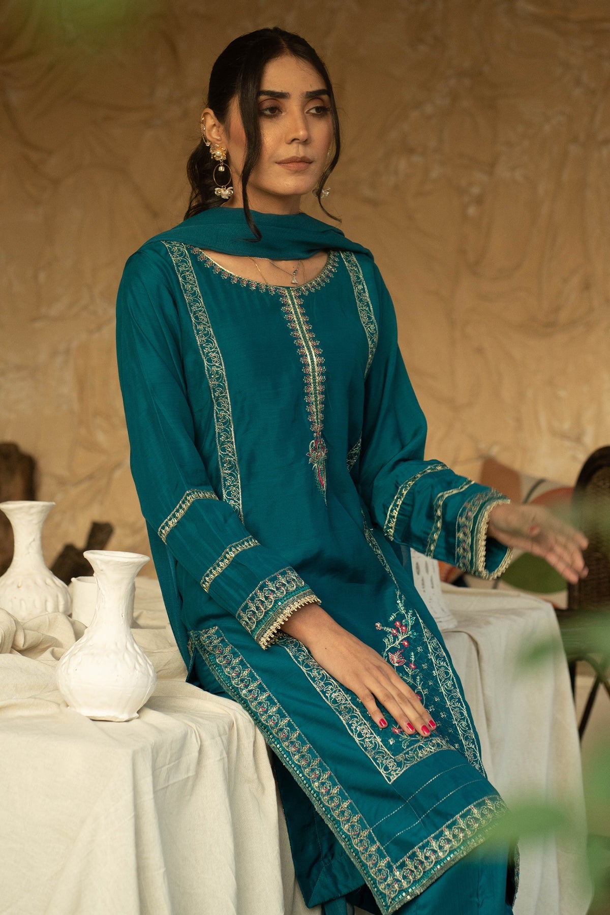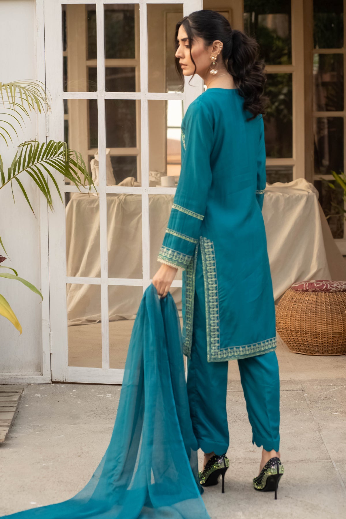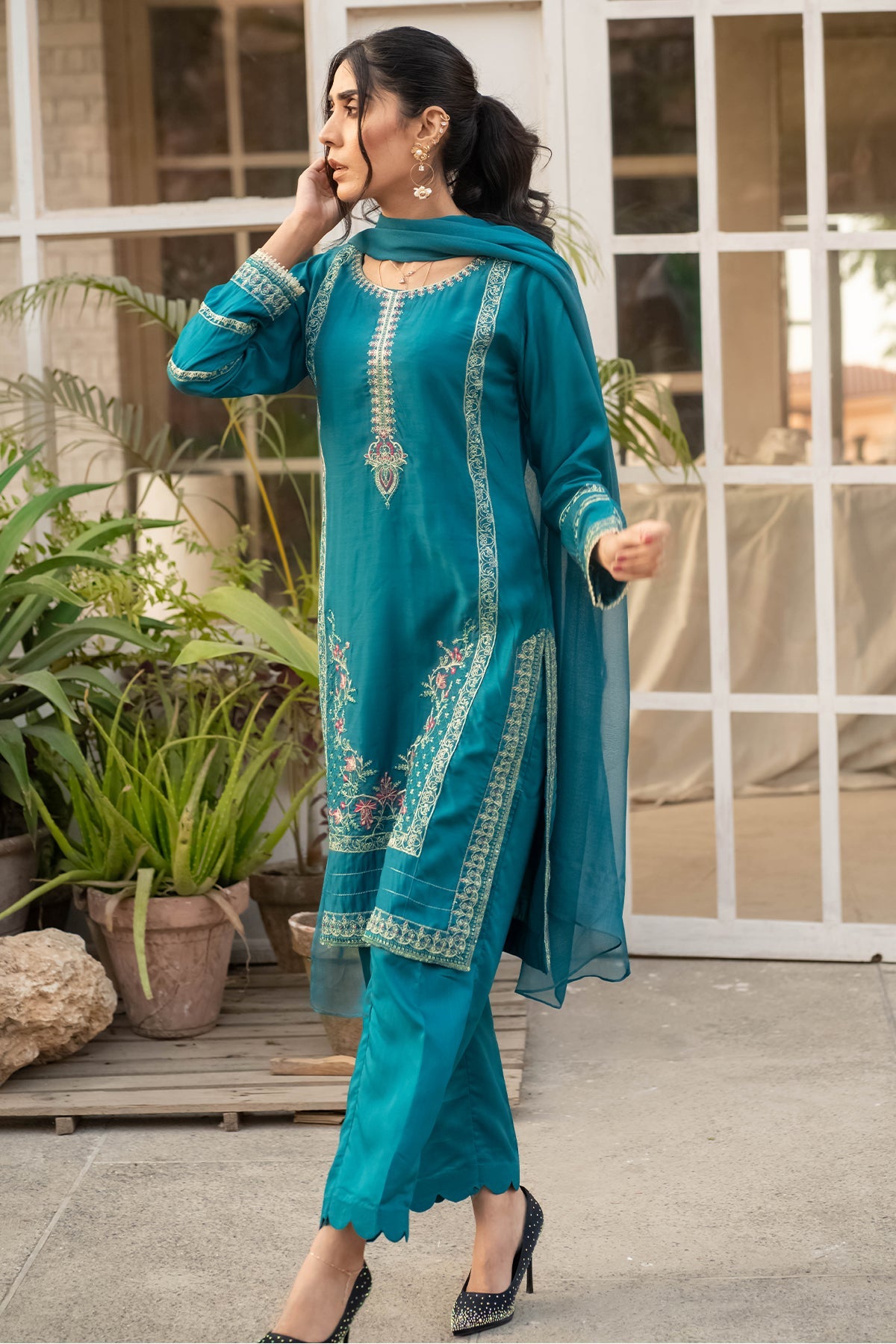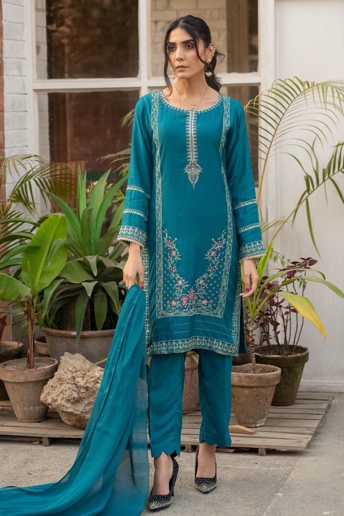 This elegant ensemble features an embroidered front and sleeves on luxurious viscose, along with delicate stitching elements. The plain viscose back and trousers add a touch of sophistication, while the chiffon dupatta adds a hint of femininity. Upgrade your wardrobe.