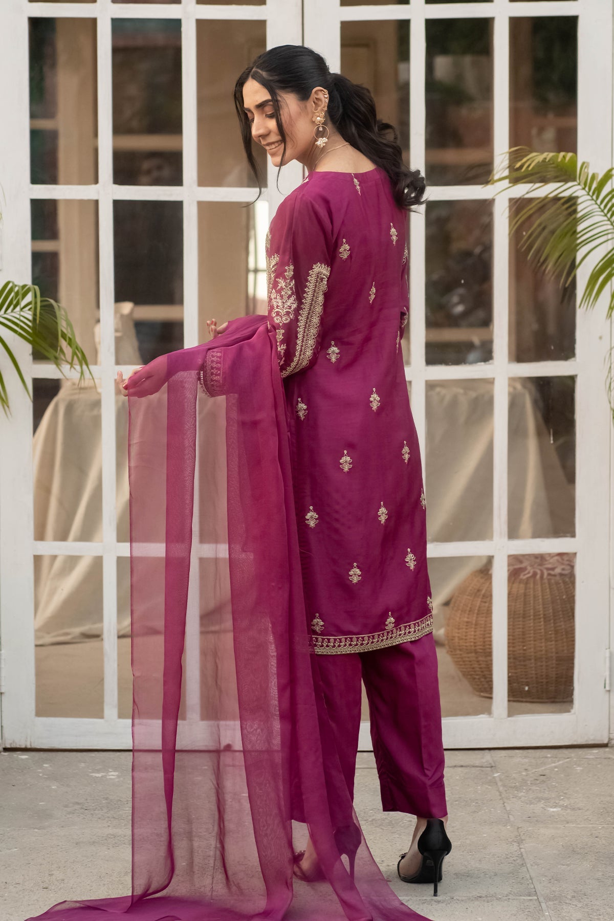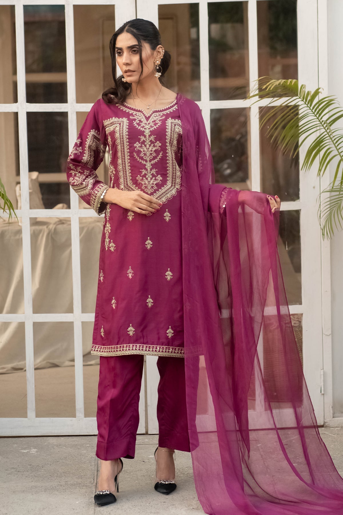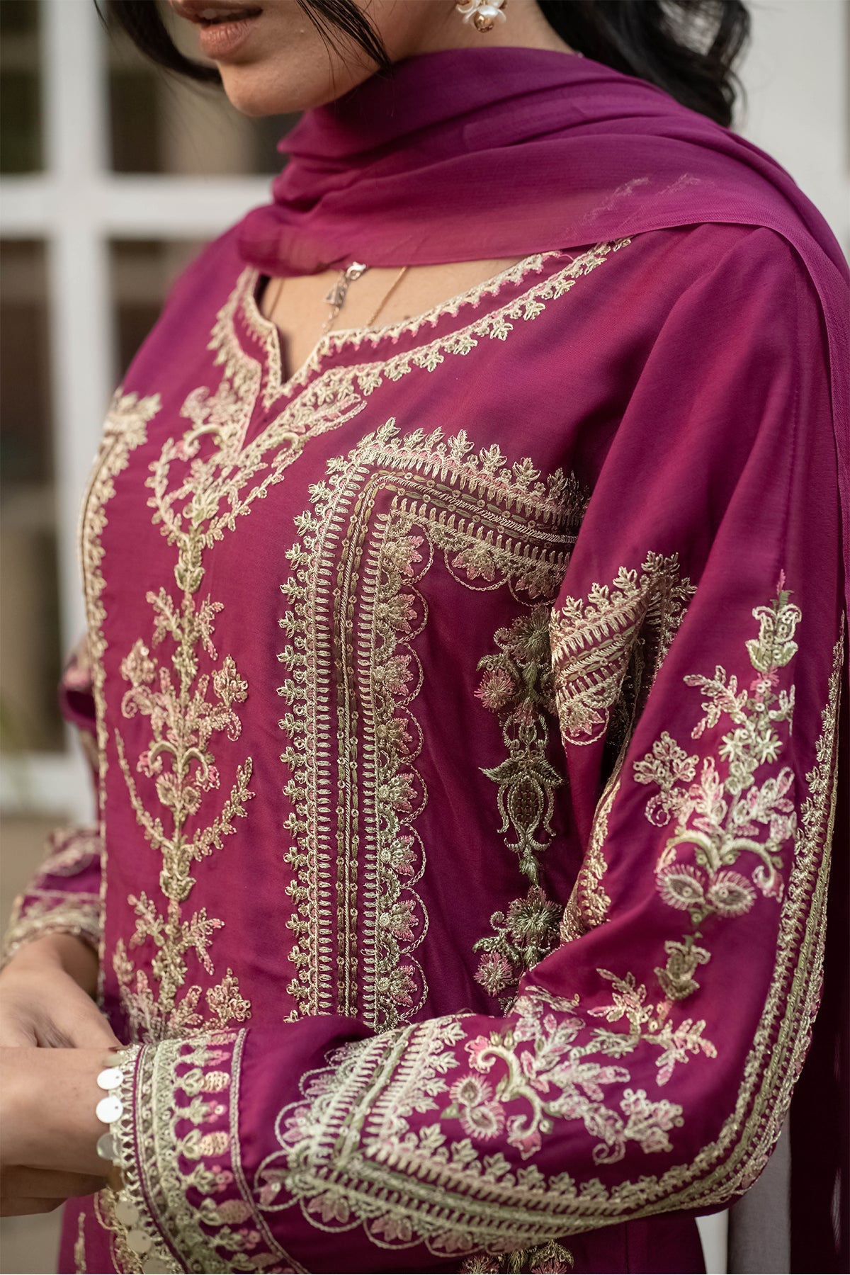 The front, sleeves, and back are all beautifully embroidered on smooth viscose, while a touch of lace adds delicate charm. Its plain chiffon dupatta and viscose trouser complete the look. Upgrade your wardrobe now with this optimistic and sophisticated ensemble.
