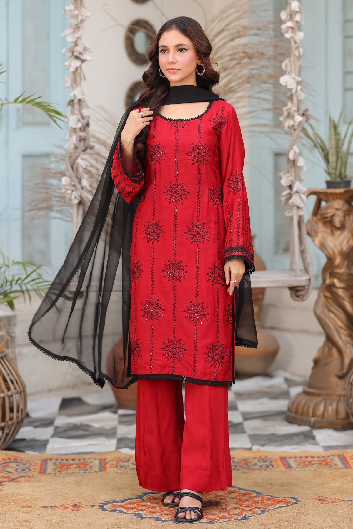 Embroidered front on viscose and a bellbottom viscose trouser for a versatile, ready to wear outfit. Complete with a chiffon dupatta and lace work, this ensemble exudes elegance and ease.