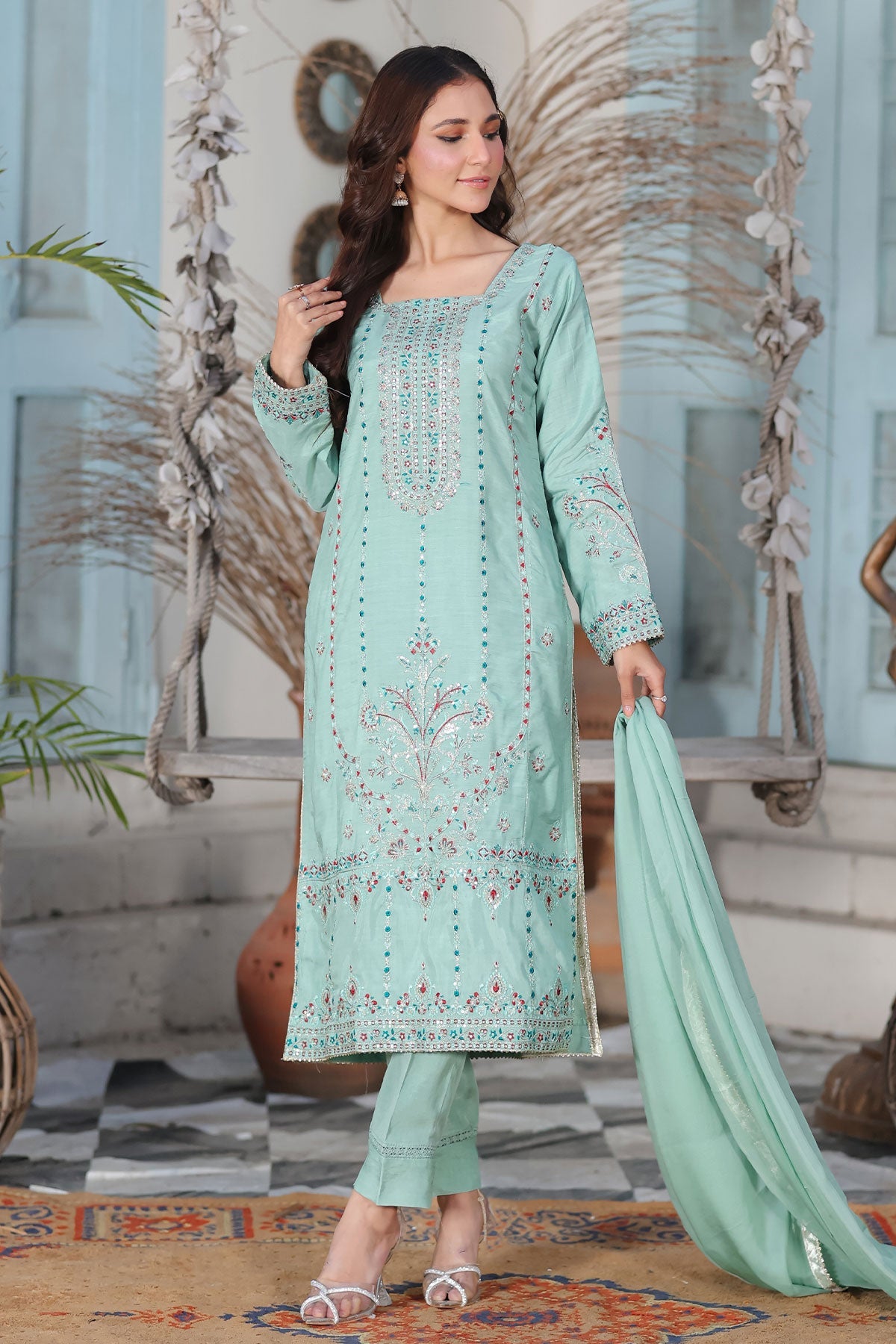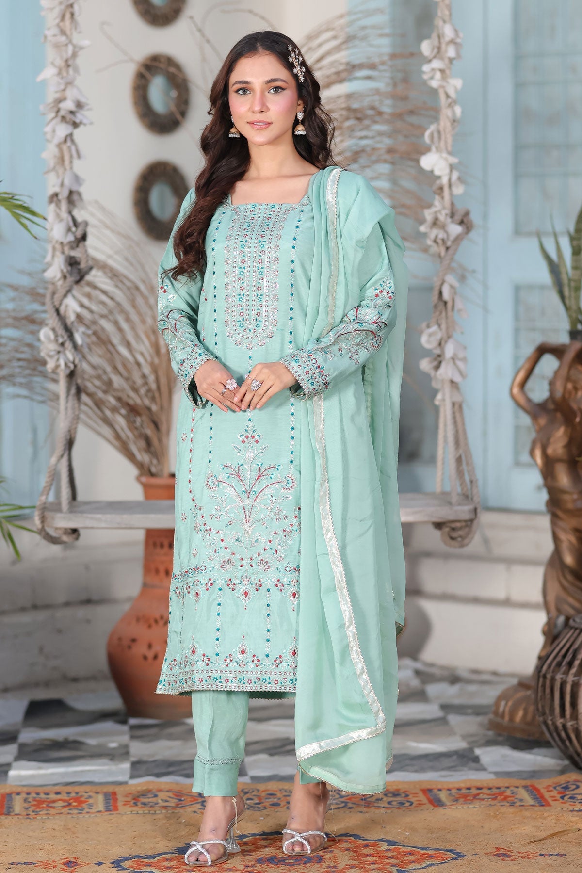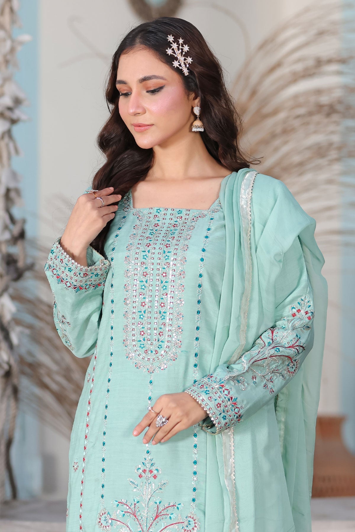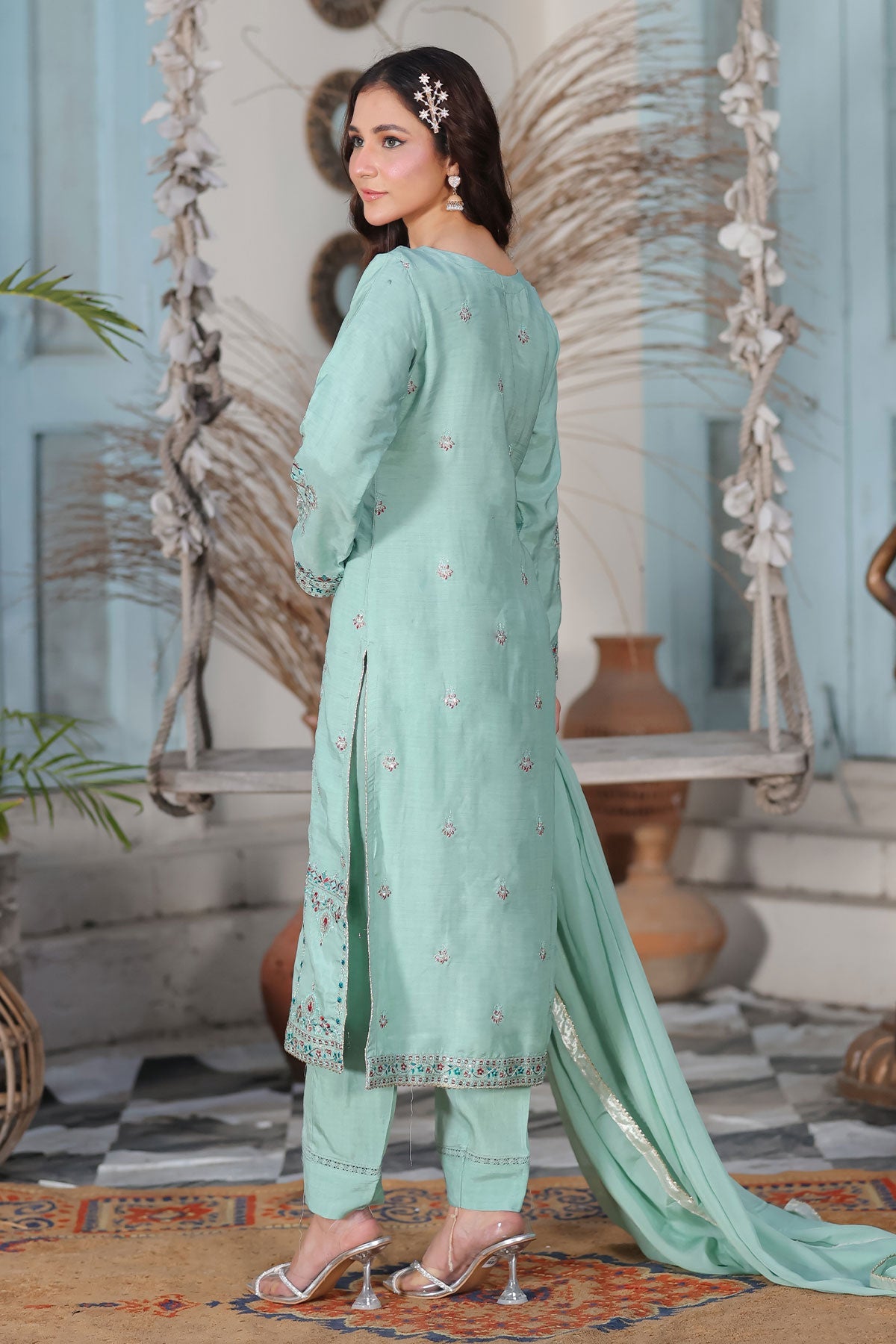 The embroidered front panel, side panels, and sleeves on viscose add elegant details, while the chiffon dupatta with stitching element completes the look. The viscose trouser offers comfort and versatility. Elevate your wardrobe.