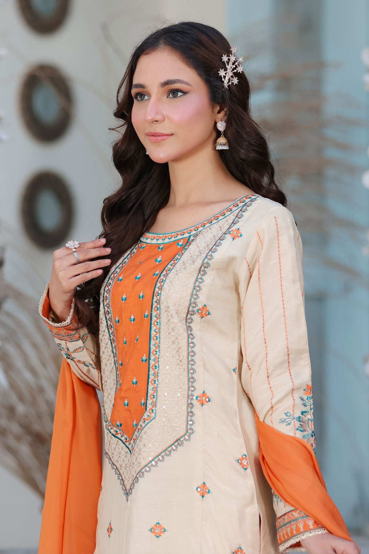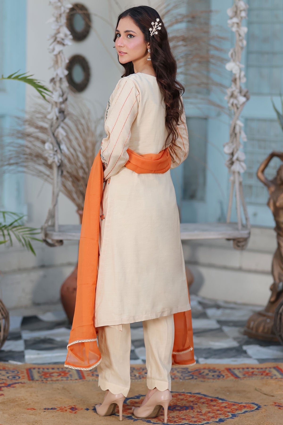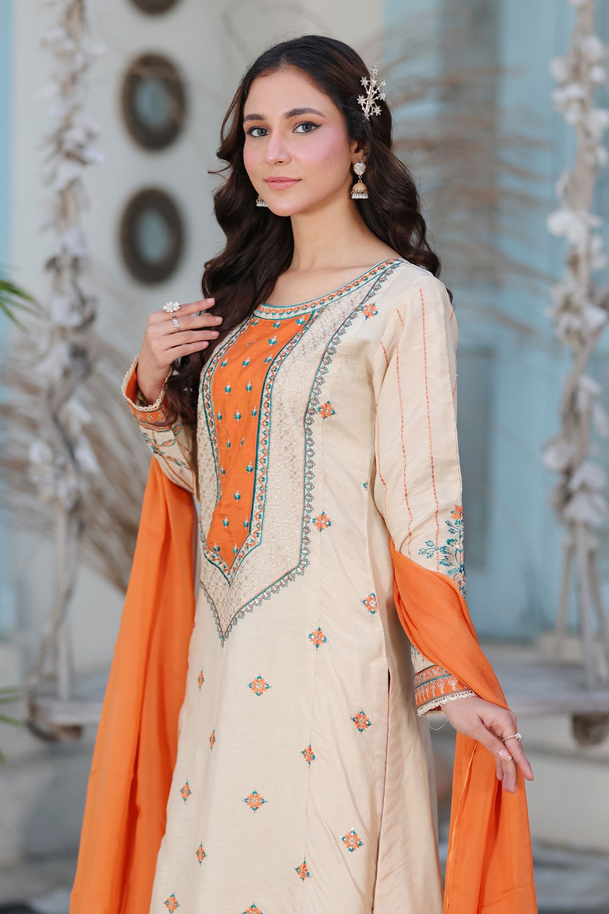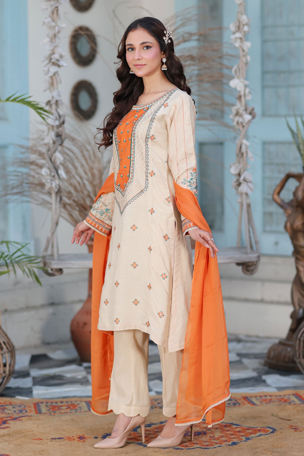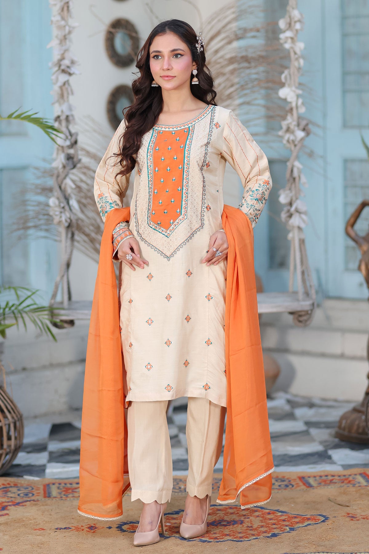 A beautiful ensemble featuring embroidered front, side, and sleeves on soft viscose fabric. Complete the look with a delicate chiffon dupatta and lace detailing. Elevate your style and confidence with this must-have addition to your wardrobe.
