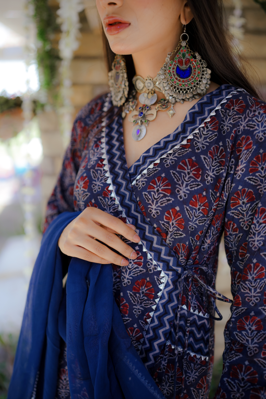 Romi is inspired by mughal heritage Angarkha which is front open with lawn tassels to tie up elegantly detailing of silver gota on sides , sleeves and front panels.