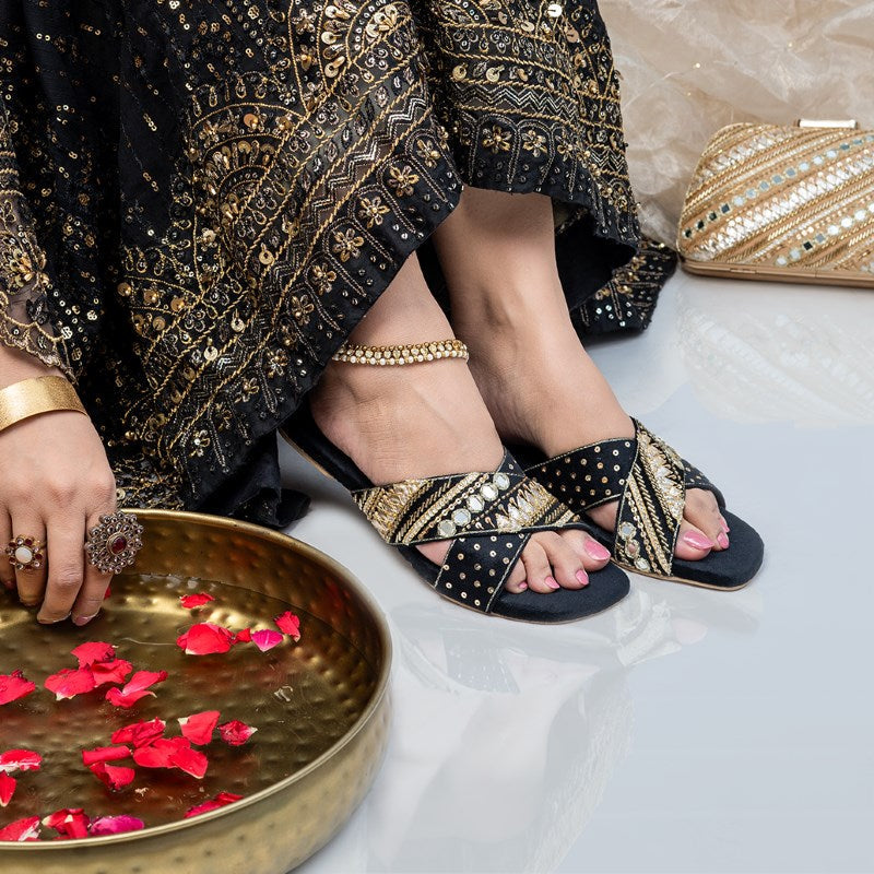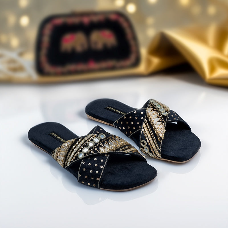 Step into the wedding season with style and celebrate the artistry of hand-crafted footwear with utmost comfort with our Black Ronak slides . Each pair is a testament to the beauty of handwork.