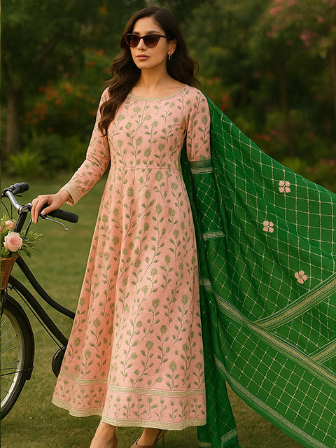 Based on the elegant design of the dress, featuring soft pink floral prints with a vibrant green dupatta.