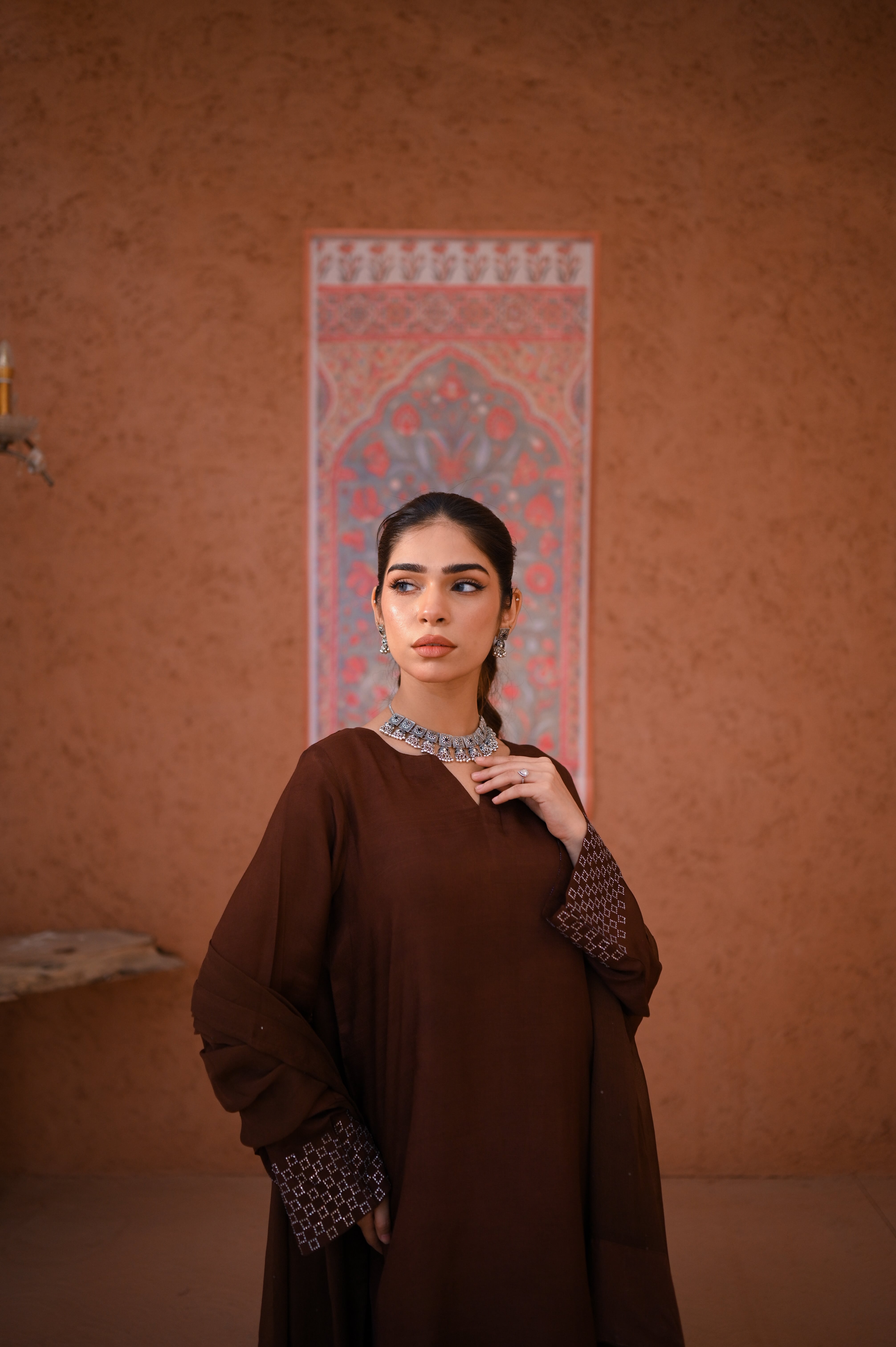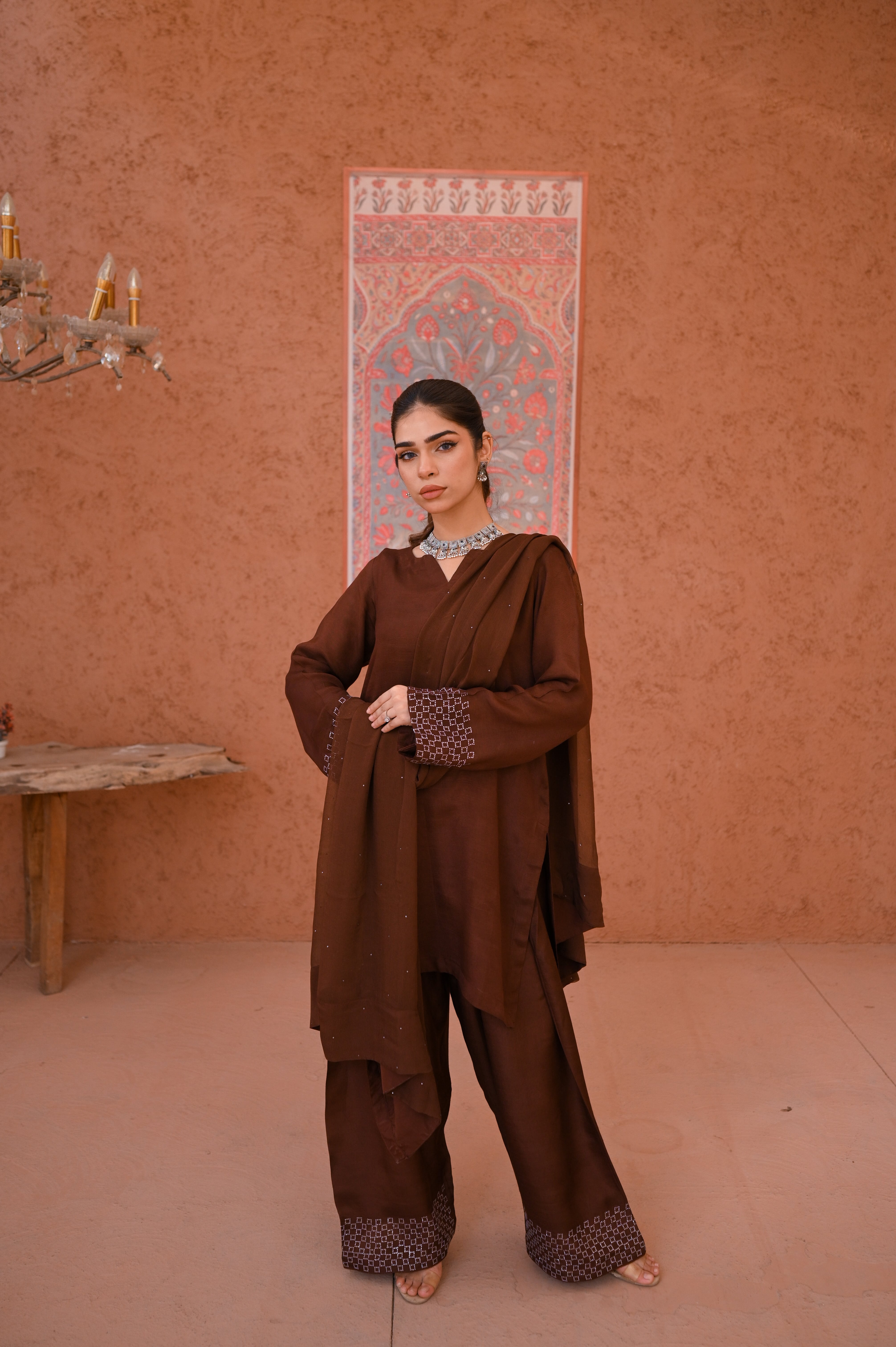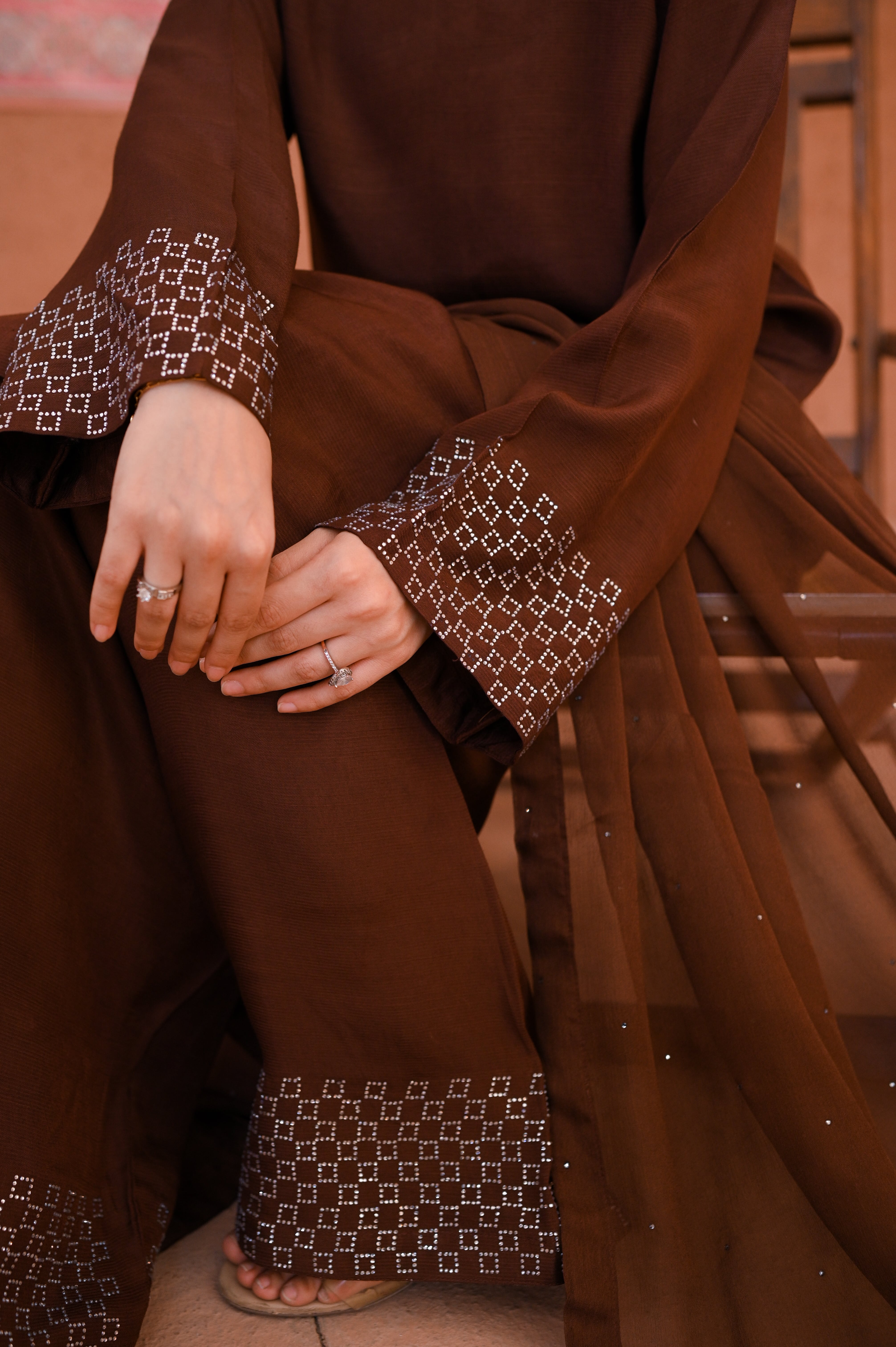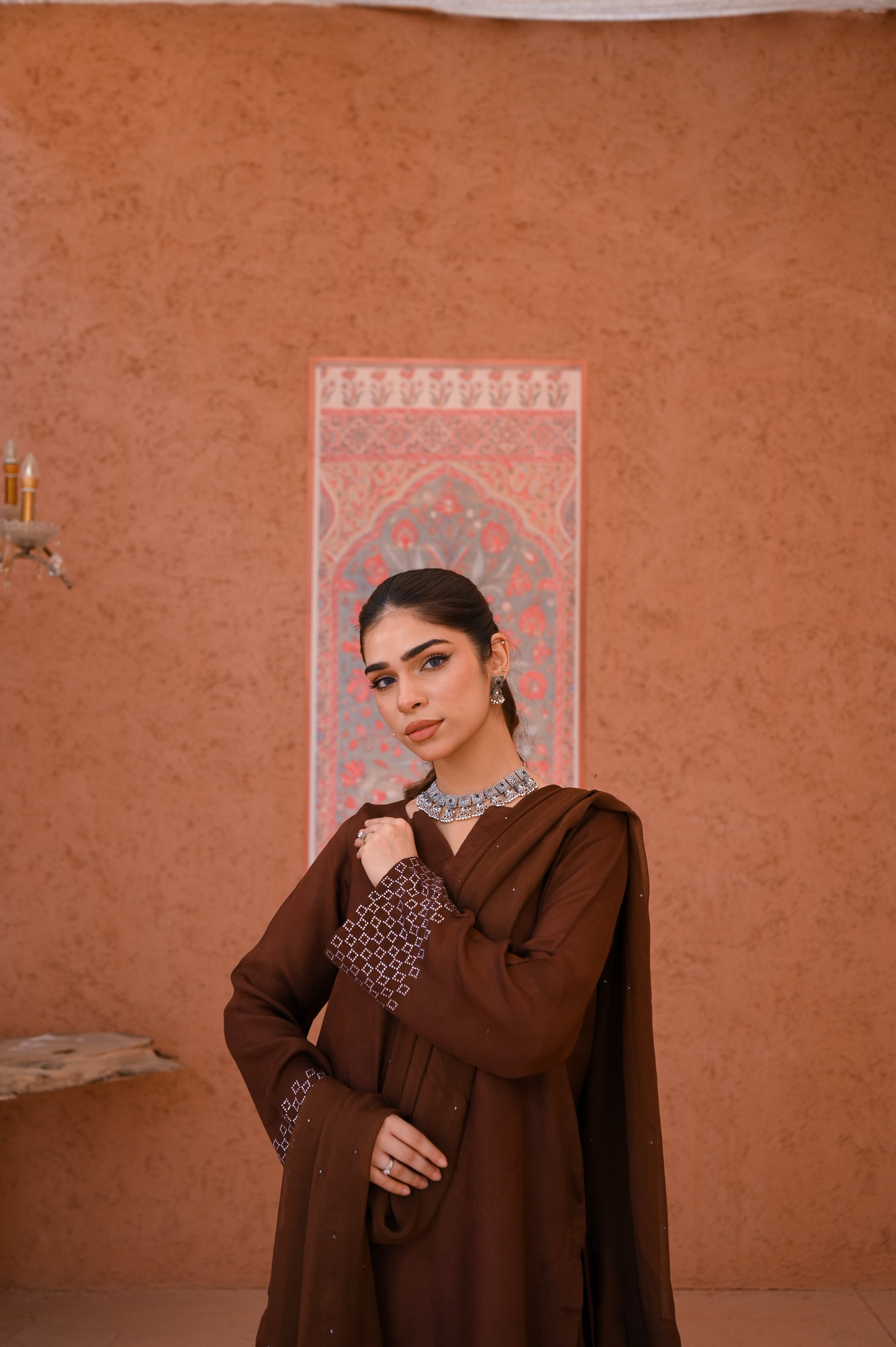 It’s a three piece dress includes a shirt and farshi shalwar along with chiffon dupatta. Embellished with stone details on sleeves, shalwar and dupatta.