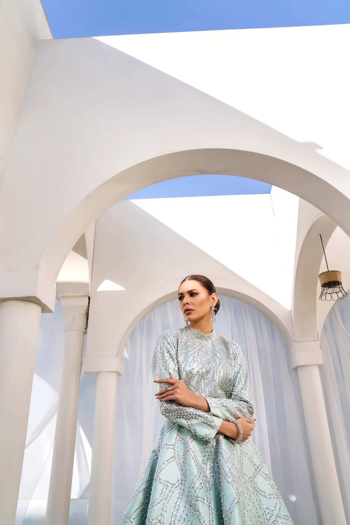 A true modern handmade maxi is this ensemble in sea green. *fabric details * Kataan silk *fusing with lining *kataan silk trouser stimated Shipping Time:2 to 3 Weeks.