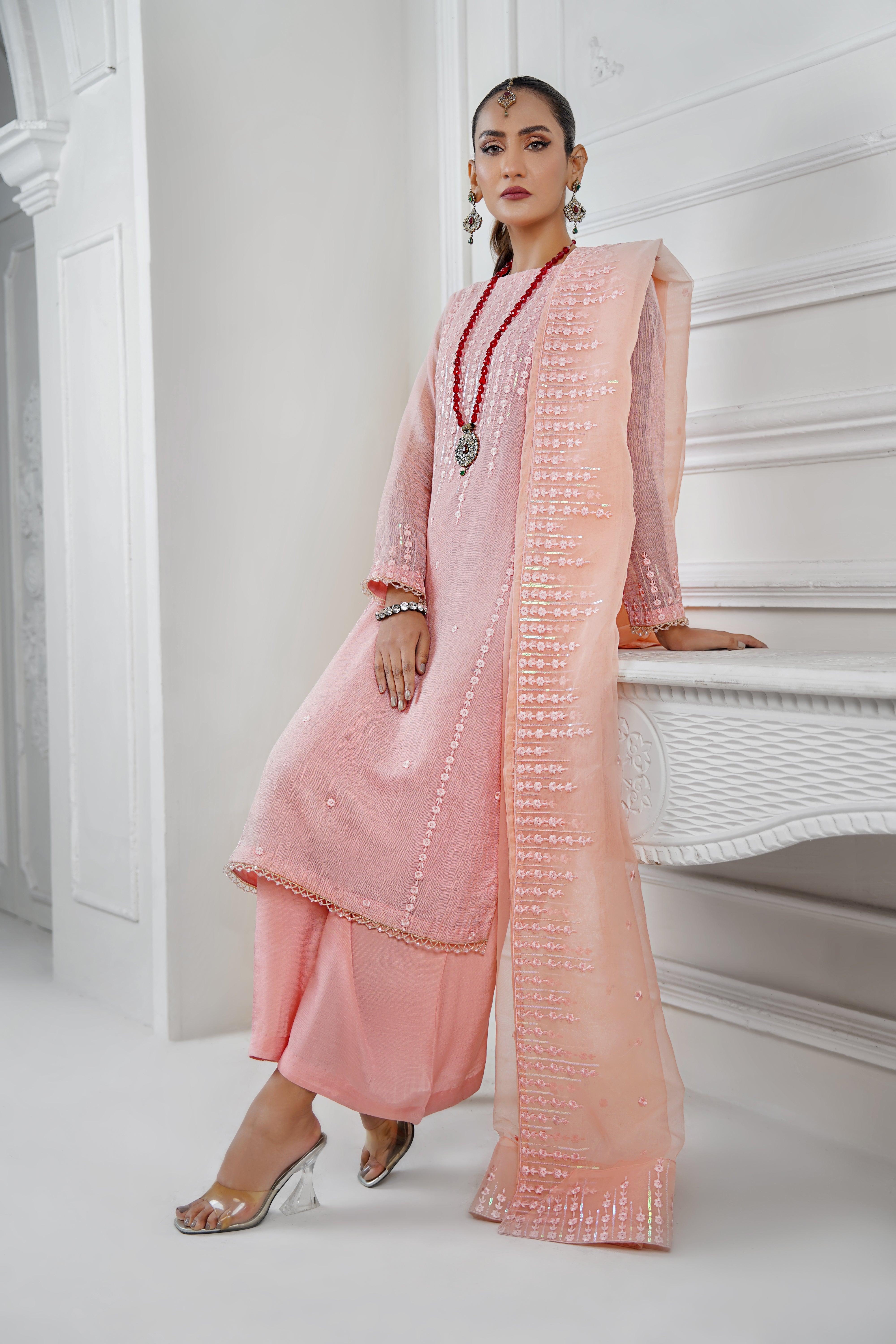 SELIA is embellished with detailed embroidery on the front, back, and sleeves. The trousers maintain a plain design, and the dupatta is adorned with embroidery on all four corners, enhancing the overall charm of the outfit.