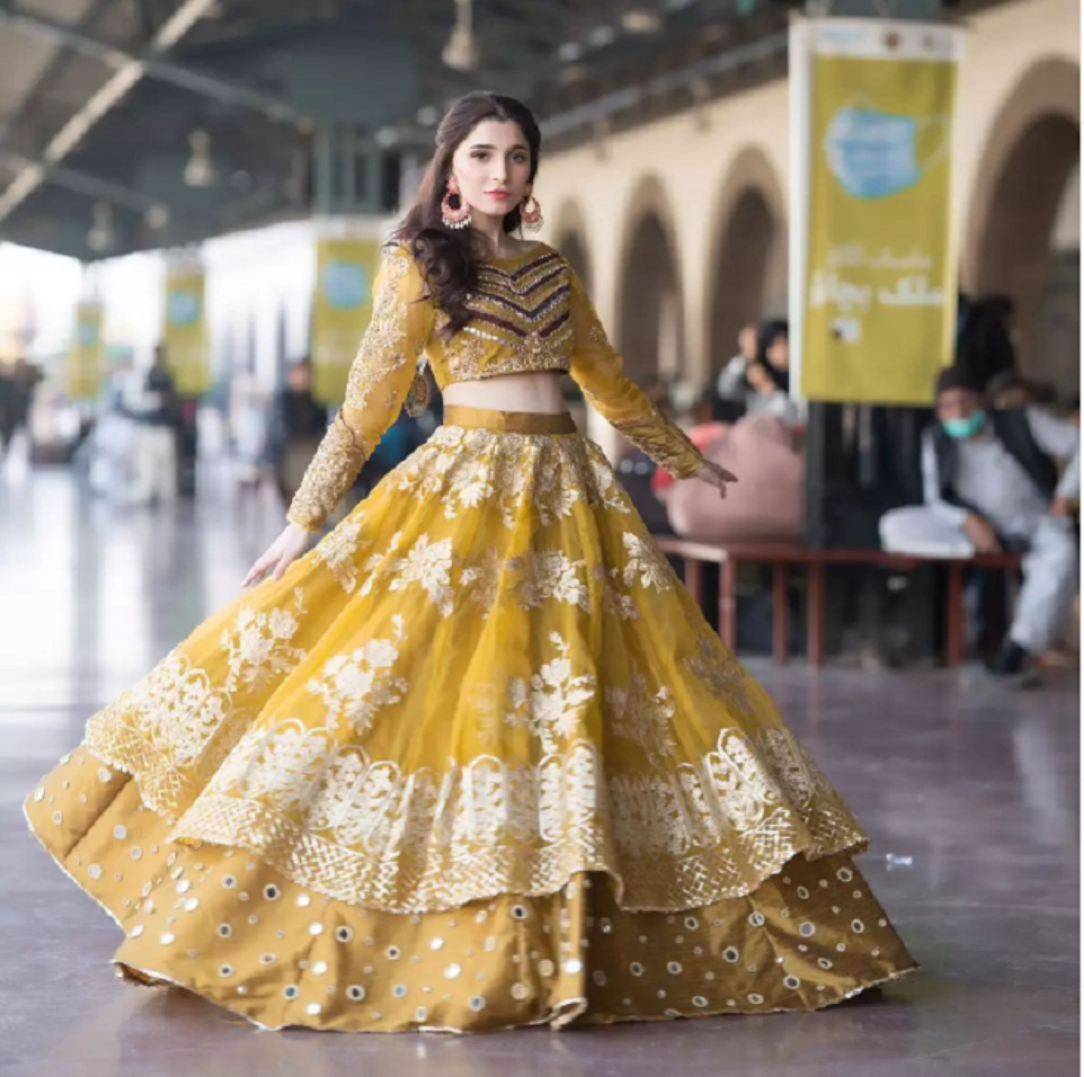 Description: Zardozi work on blouse and sleeves. Embroidery on Lehenga & mirror.