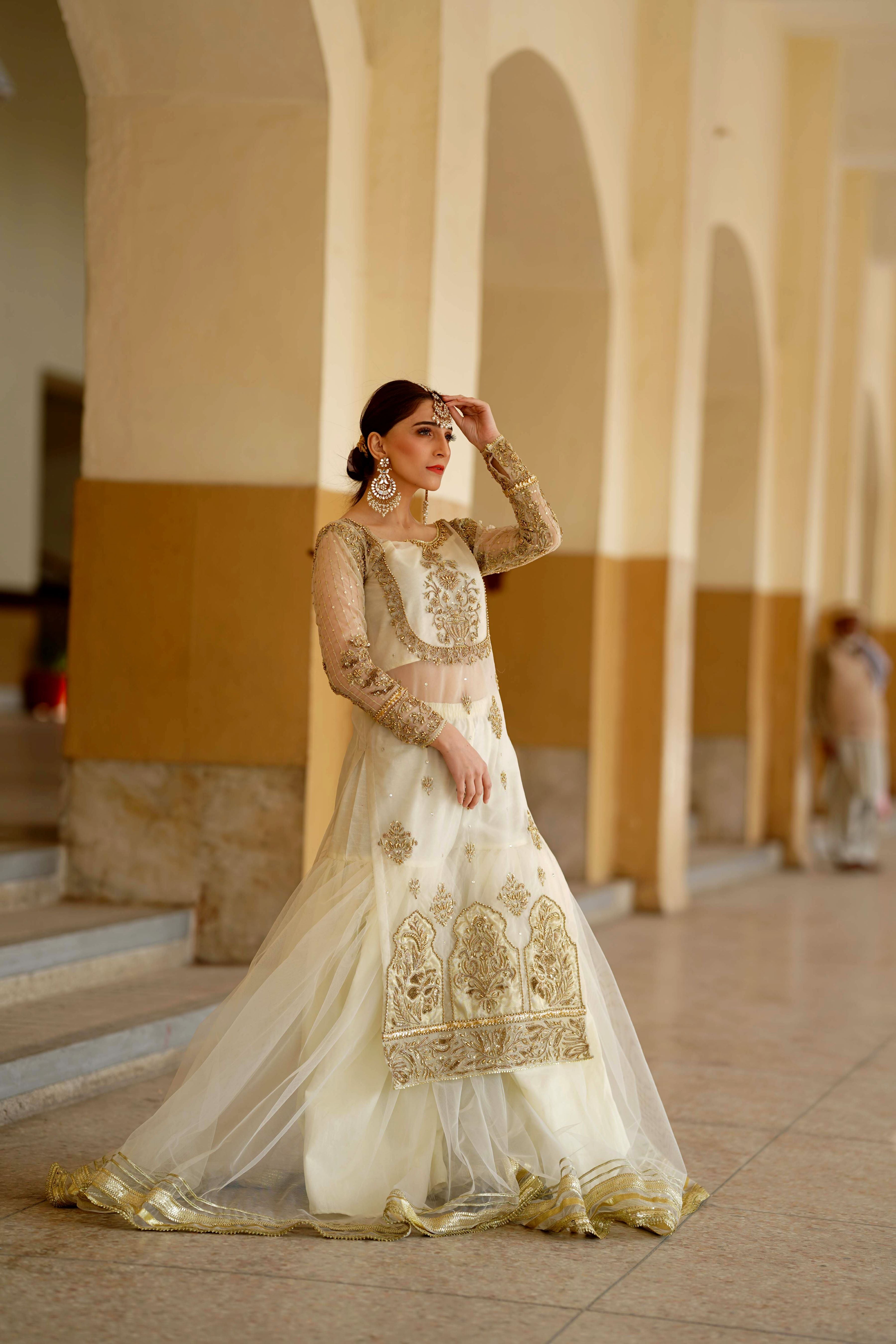 Description: Zardozi work on Shirt. Finishes on Gharara Bottom. Embroidery and Zardozi on Dupatta.