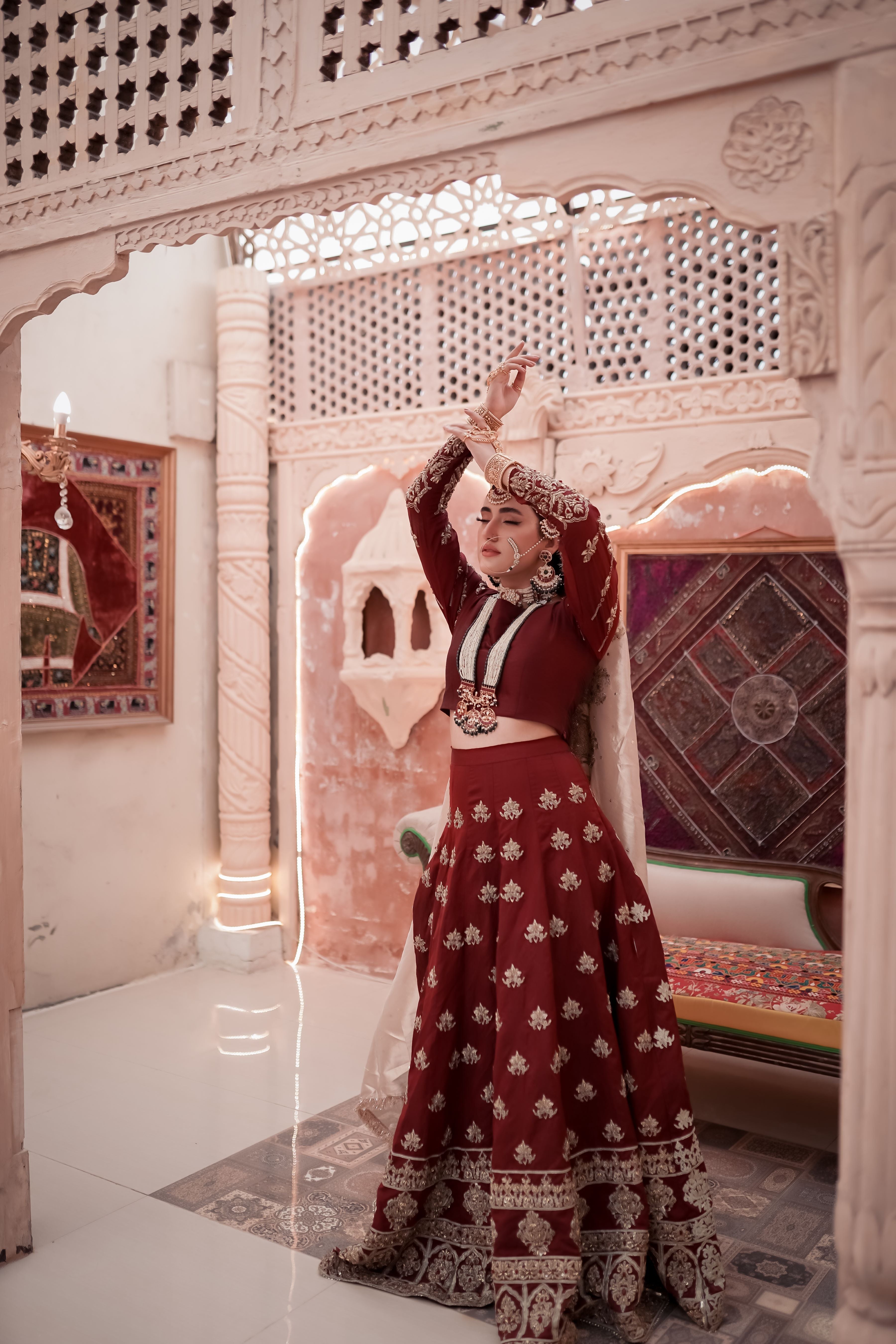 Description: Zardozi work on sleeves and dupatta. Embroidery on front & back. Zardozi work on Front panels of Lehenga.