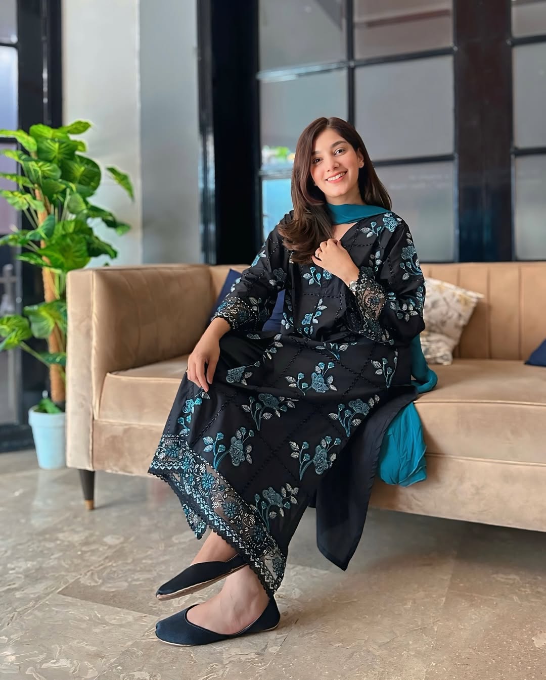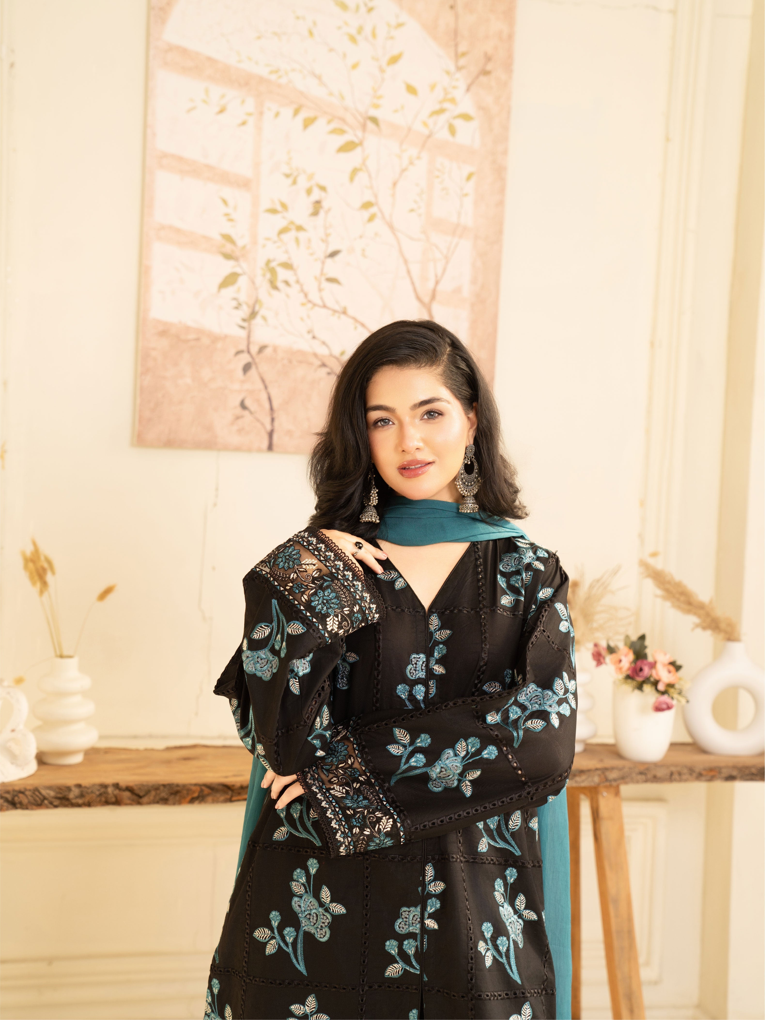 Experience elegance with our exquisite black Sahil ensemble. This outfit features a long A-line shirt with a front slit and delicate embroidery all over the front. It is paired with a plain straight pant and a flowy chiffon dupatta — a perfect blend of grace and simplicity for your festive wardrobe.