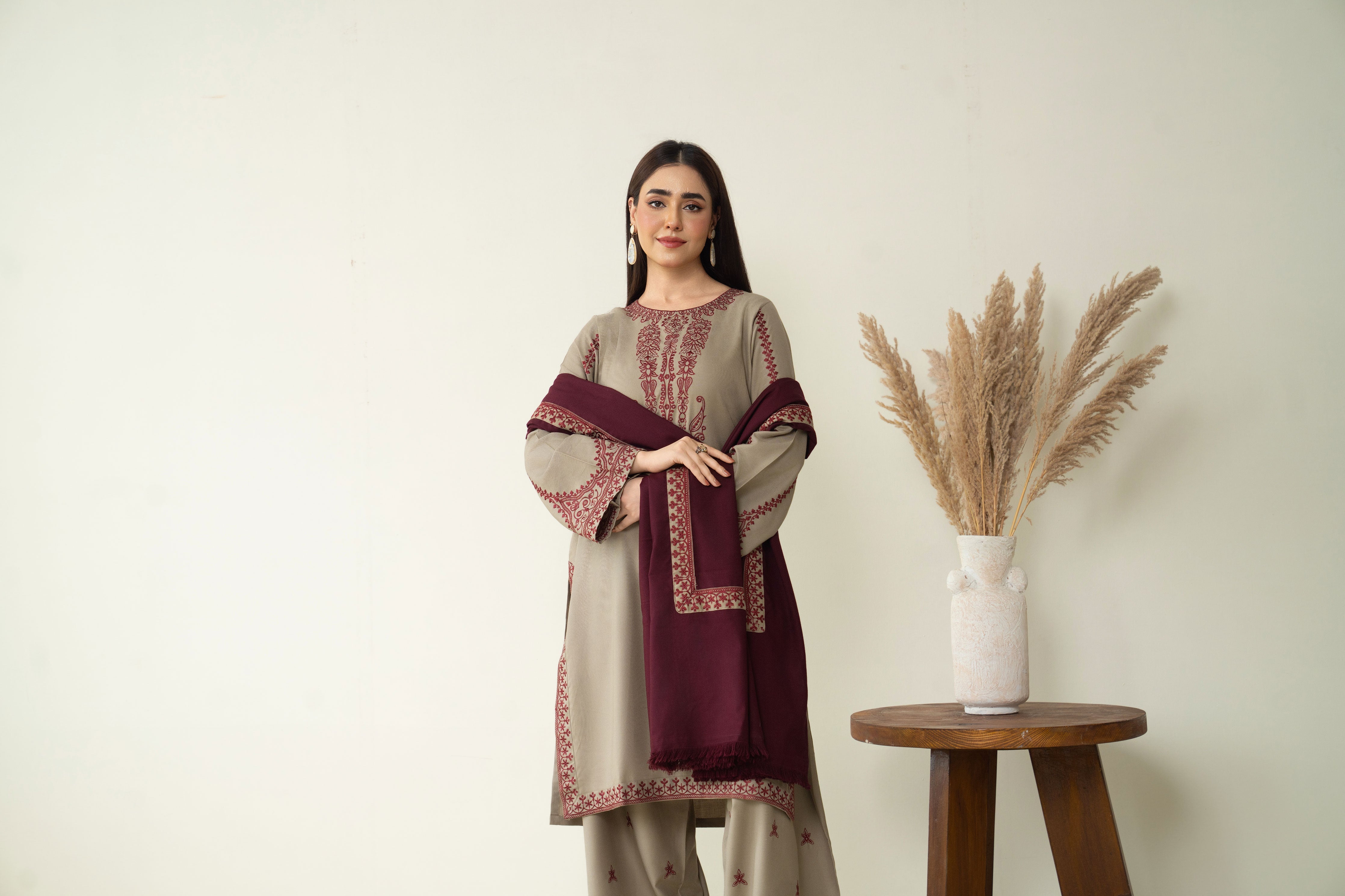 Turn heads with our captivating grey ensemble. Featuring intricate embroidery on the neckline, front and sleeves, paired with embroidered farshi shalwar. The look is elevated with a gracefully embroidered contrast maroon shawl.