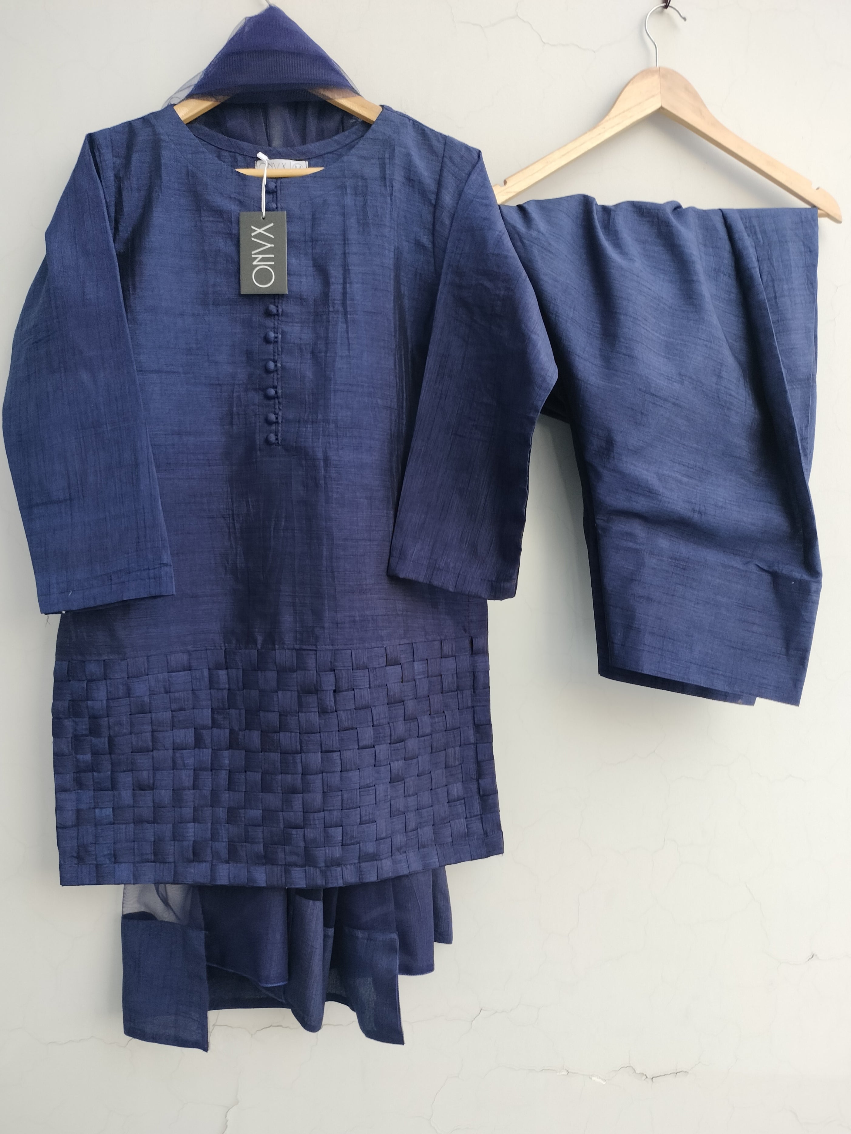 A sky-inspired ensemble featuring a raw silk kameez with a check-patterned daman and buttoned neckline, paired with a farshi shalwar and delicate net dupatta. Blending tradition with modern elegance, it’s perfect for festive occasions. Style with minimal jewelry for timeless charm.