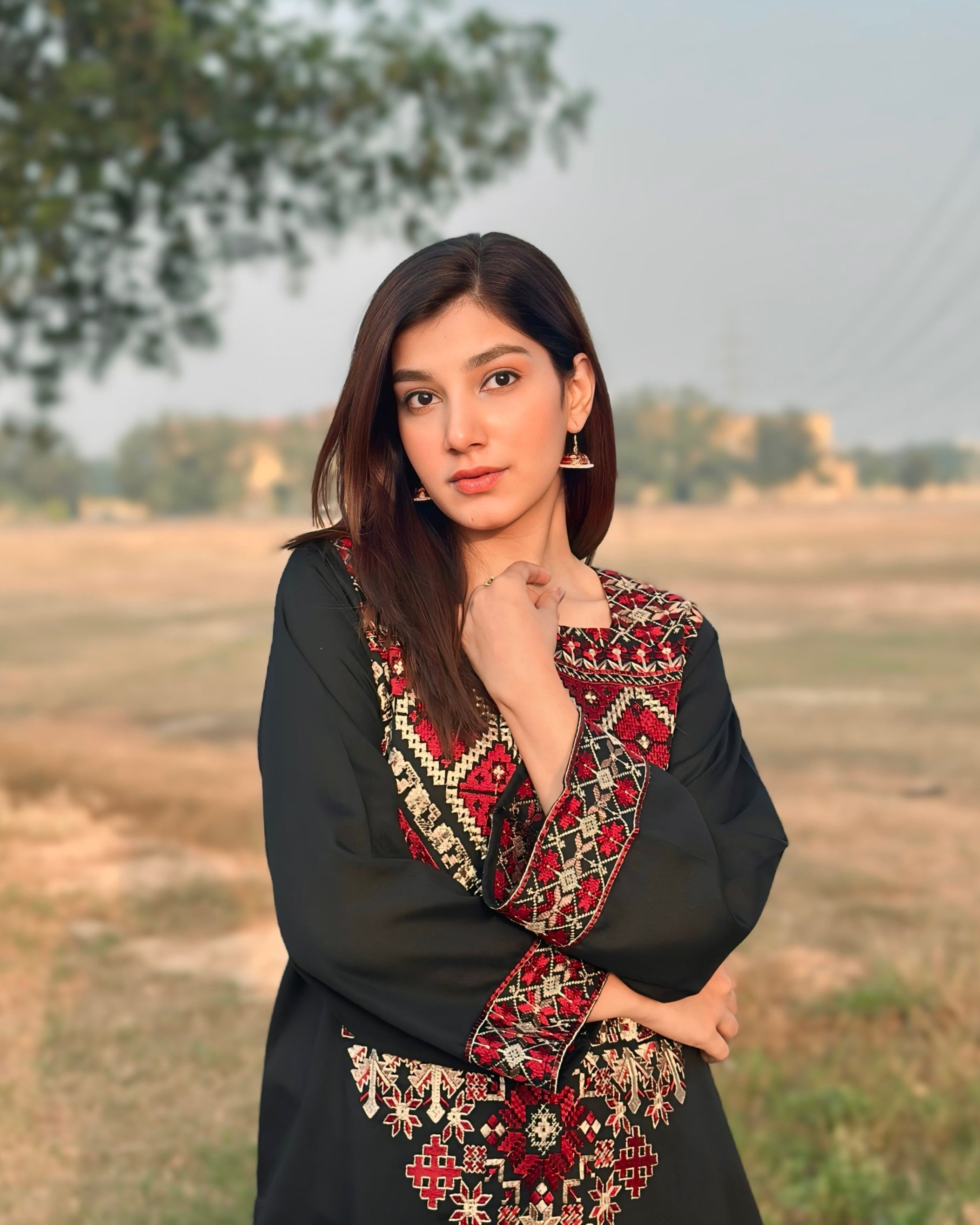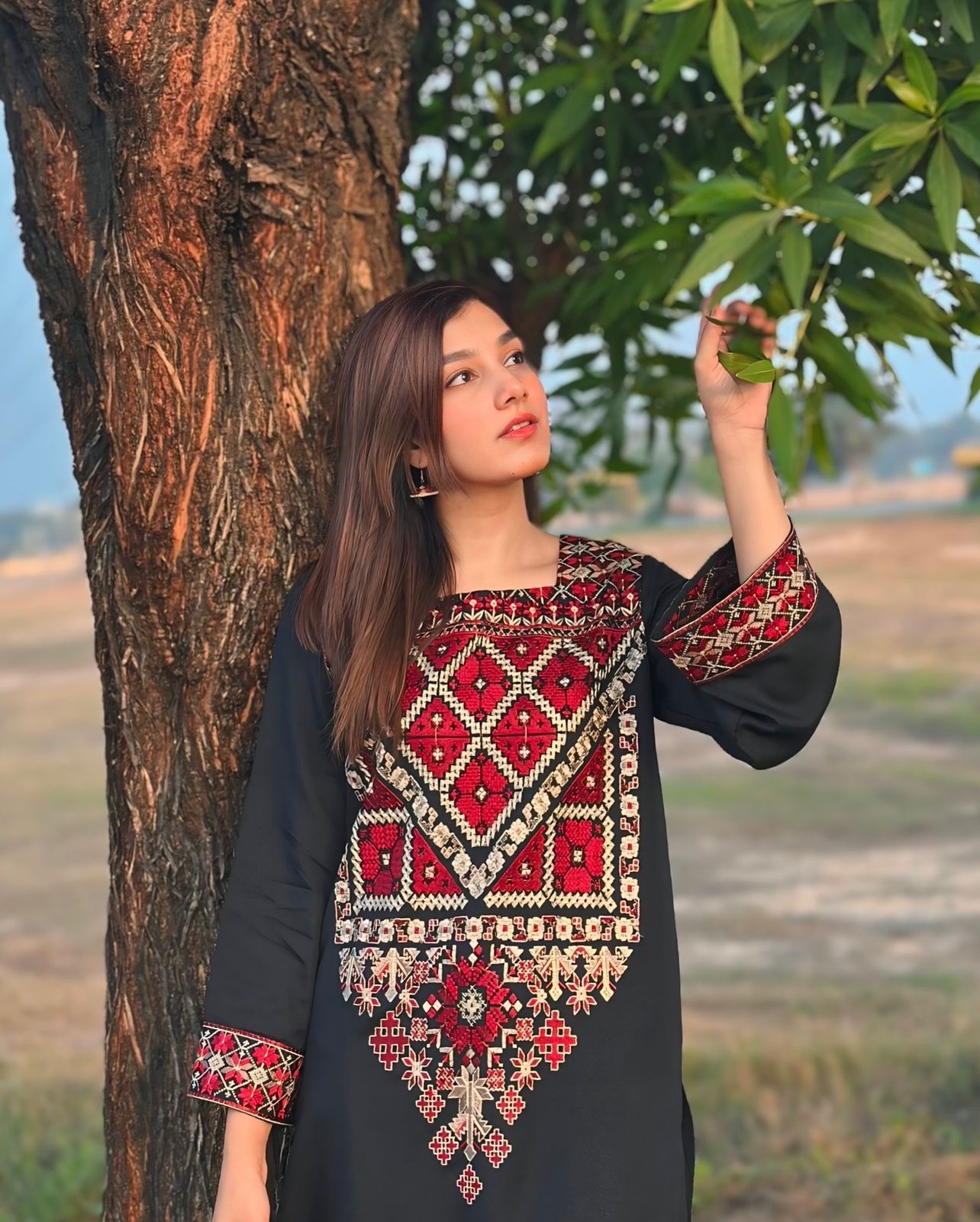 Details: Embroidered long shirt, paired with loose straight trousers