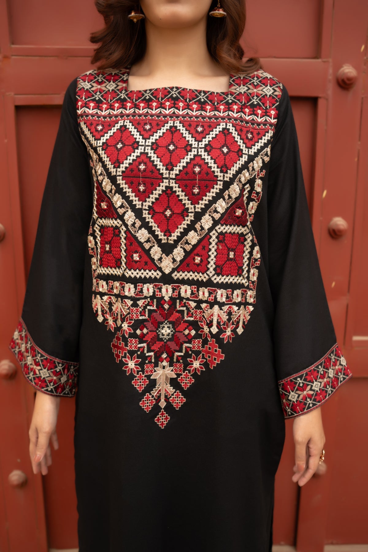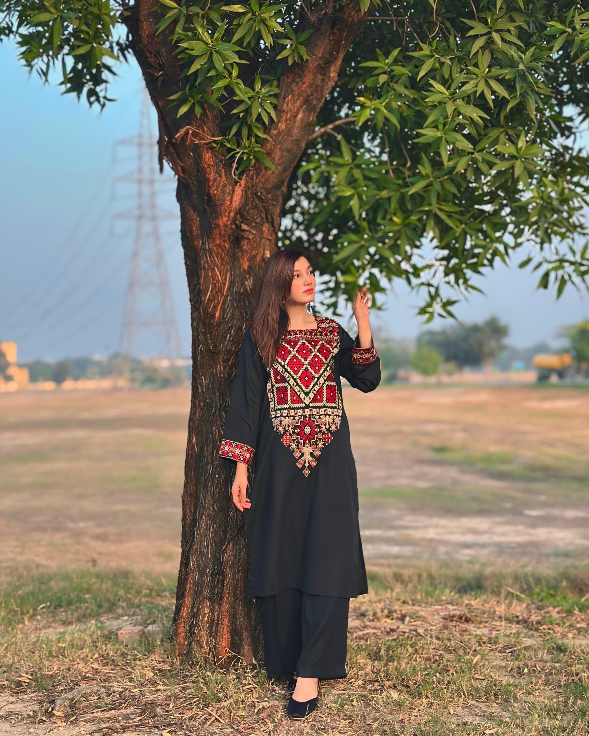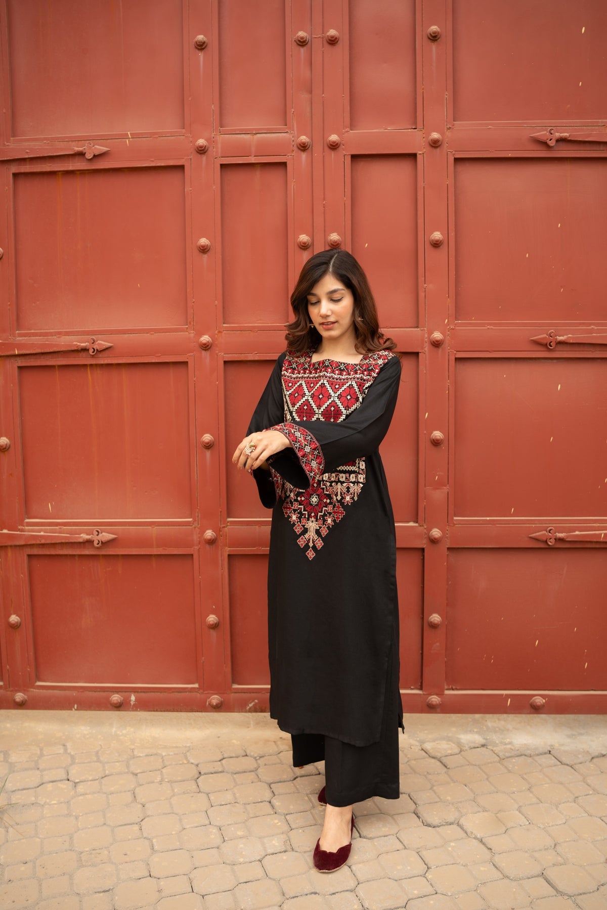 Step into timeless sophistication with this exquisite black two-piece set. Crafted from high-quality Stapple Karandi, the ensemble features an embroidered long shirt that is perfectly paired with loose straight trousers. The delicate embroidery adds depth to the design, making it a striking combination of modern elegance and traditional craftsmanship. Perfect for any formal occasion or evening out, this dress will make you shine.