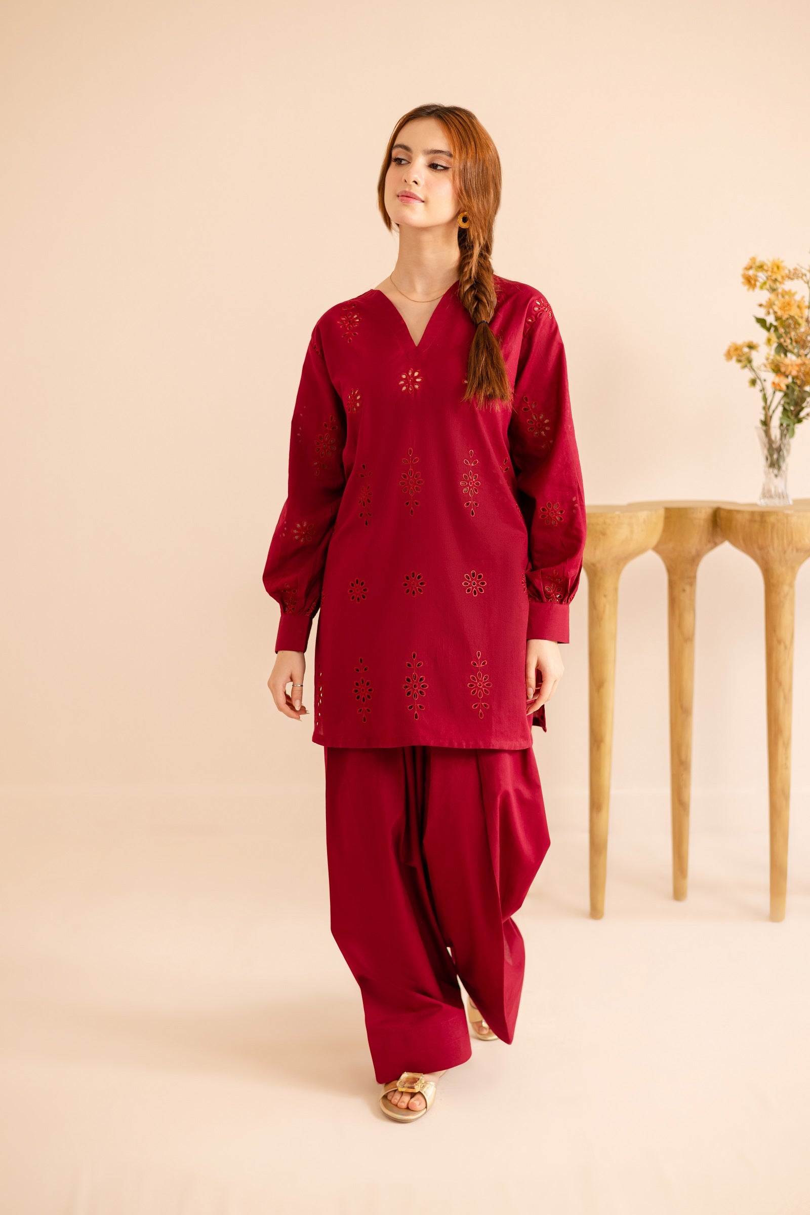 Description: Schiffli Embroidered Shirt and Plain Farshi Shalwar for Summers.