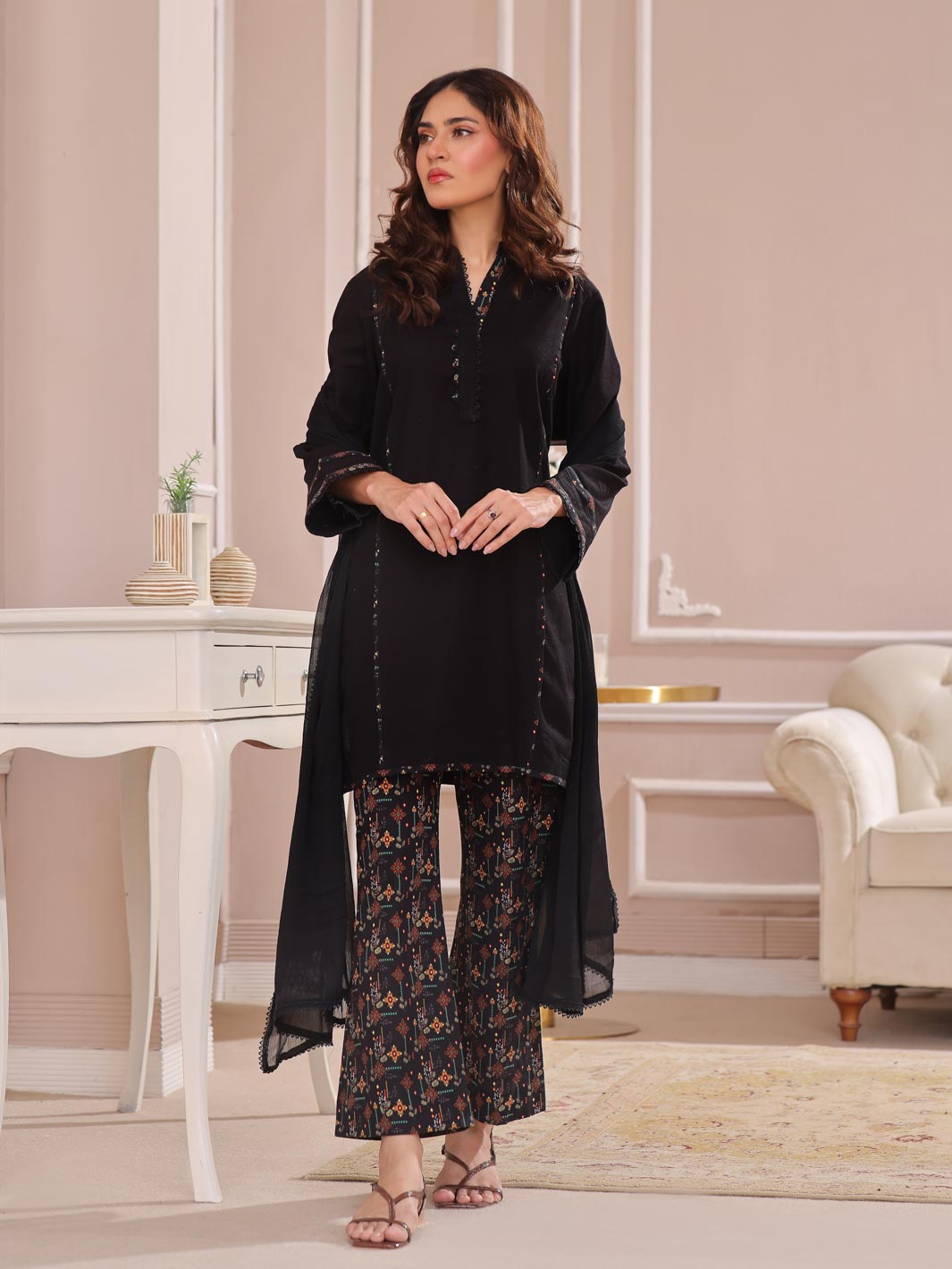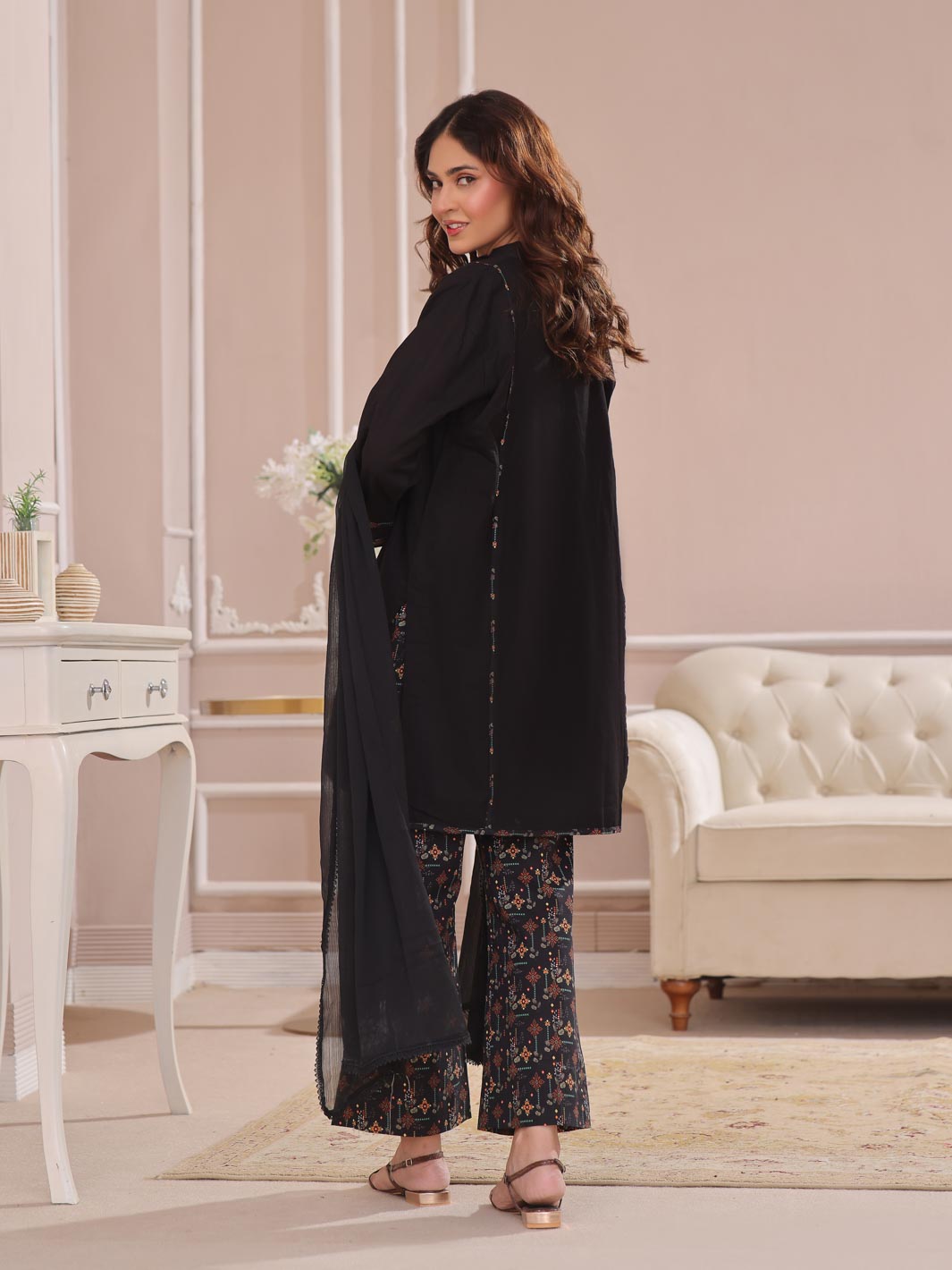 A very beautiful |khaddar| Plain Black Shirt and printed Straight trouser with matching dyed crinkle chiffon dupatta with four sided GPO lace (Dupatta Length : 2.75 mtr)
