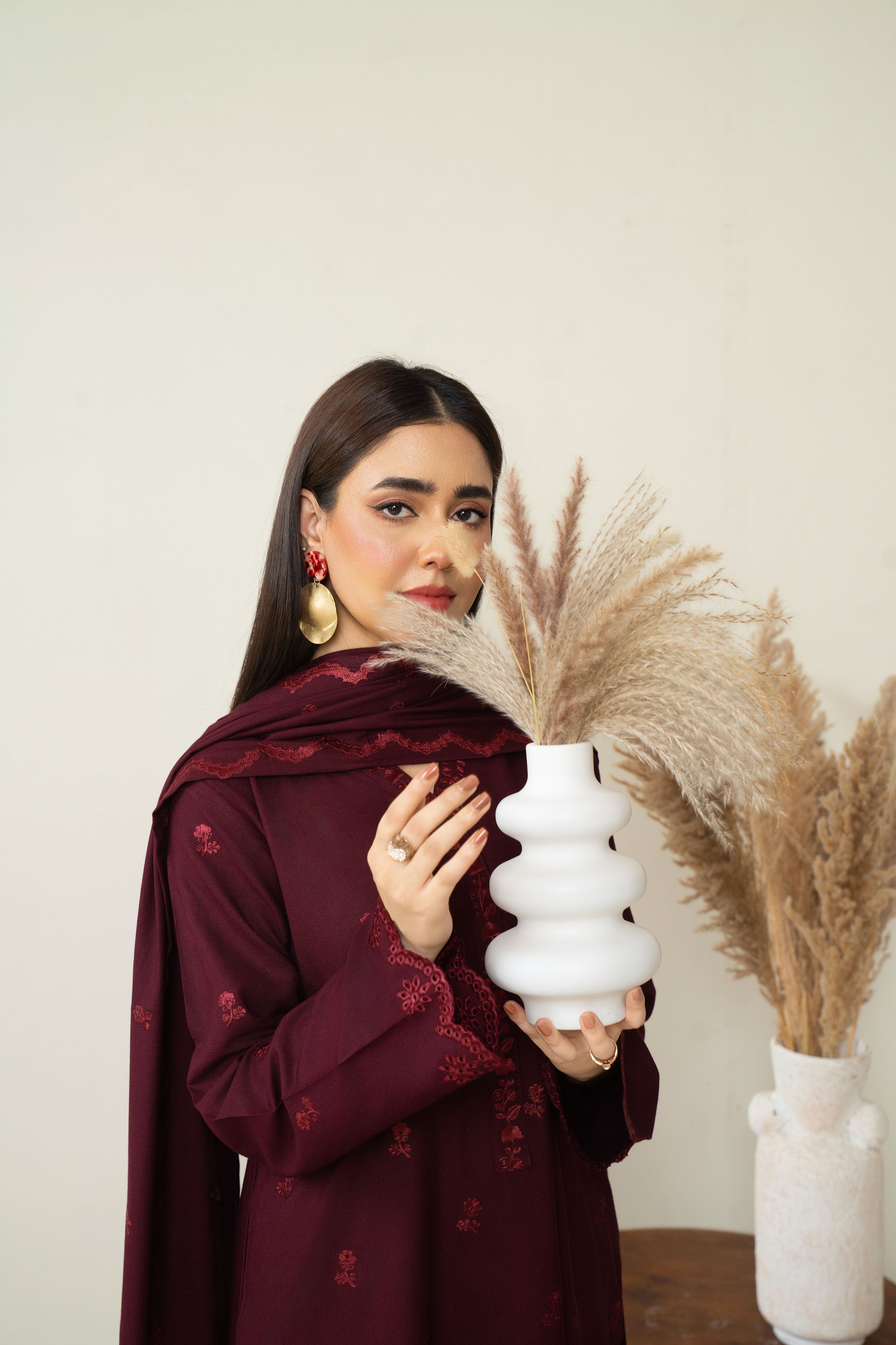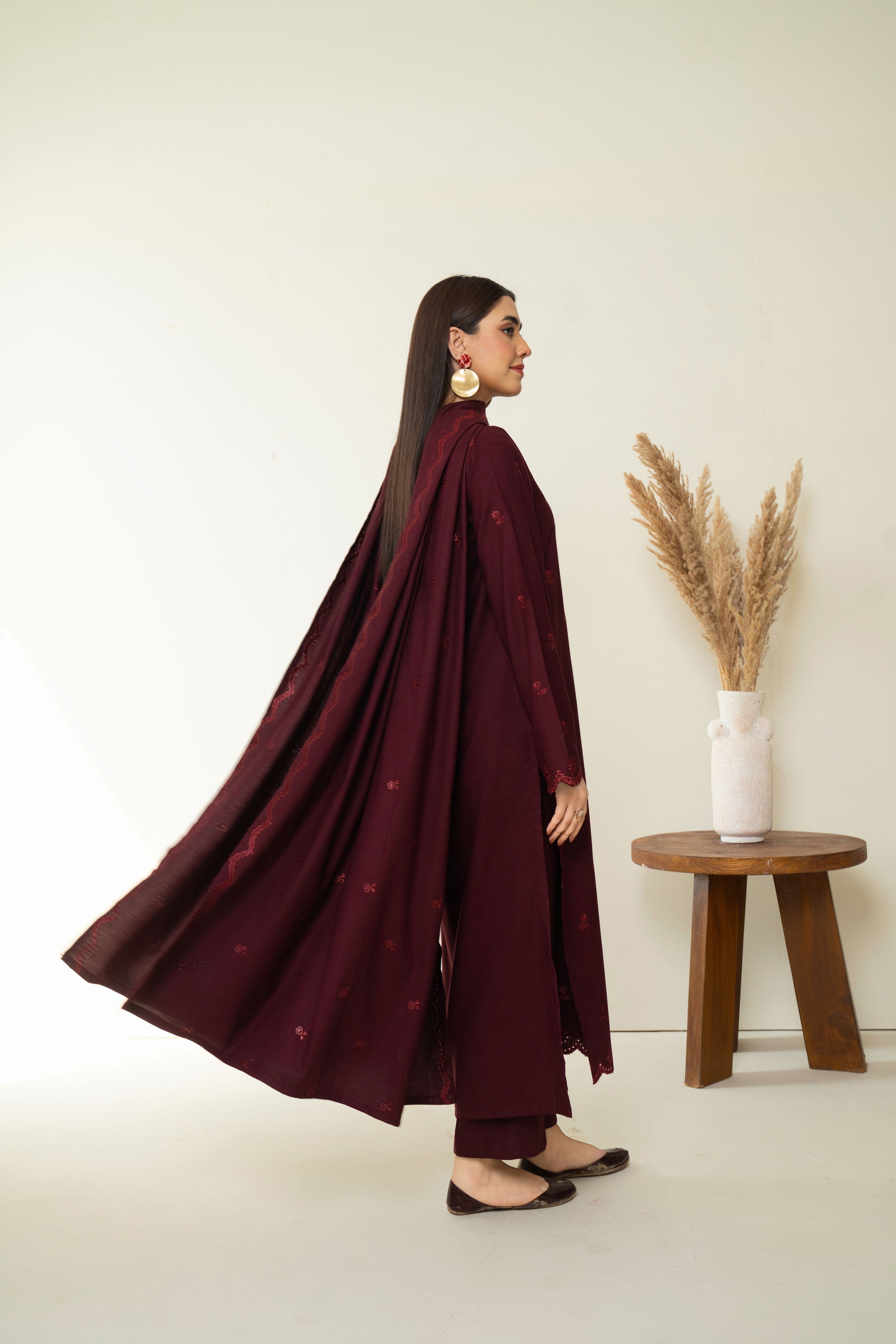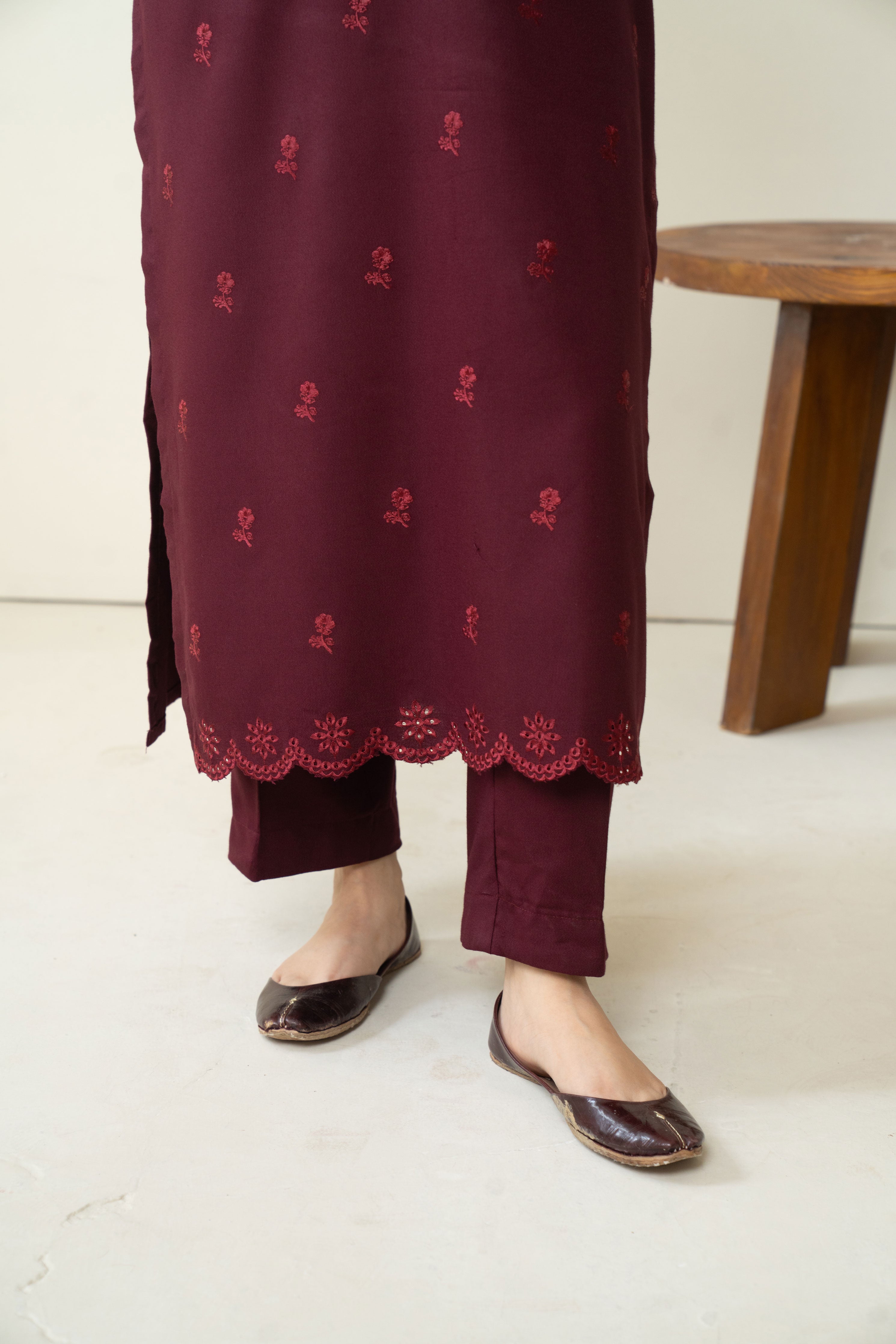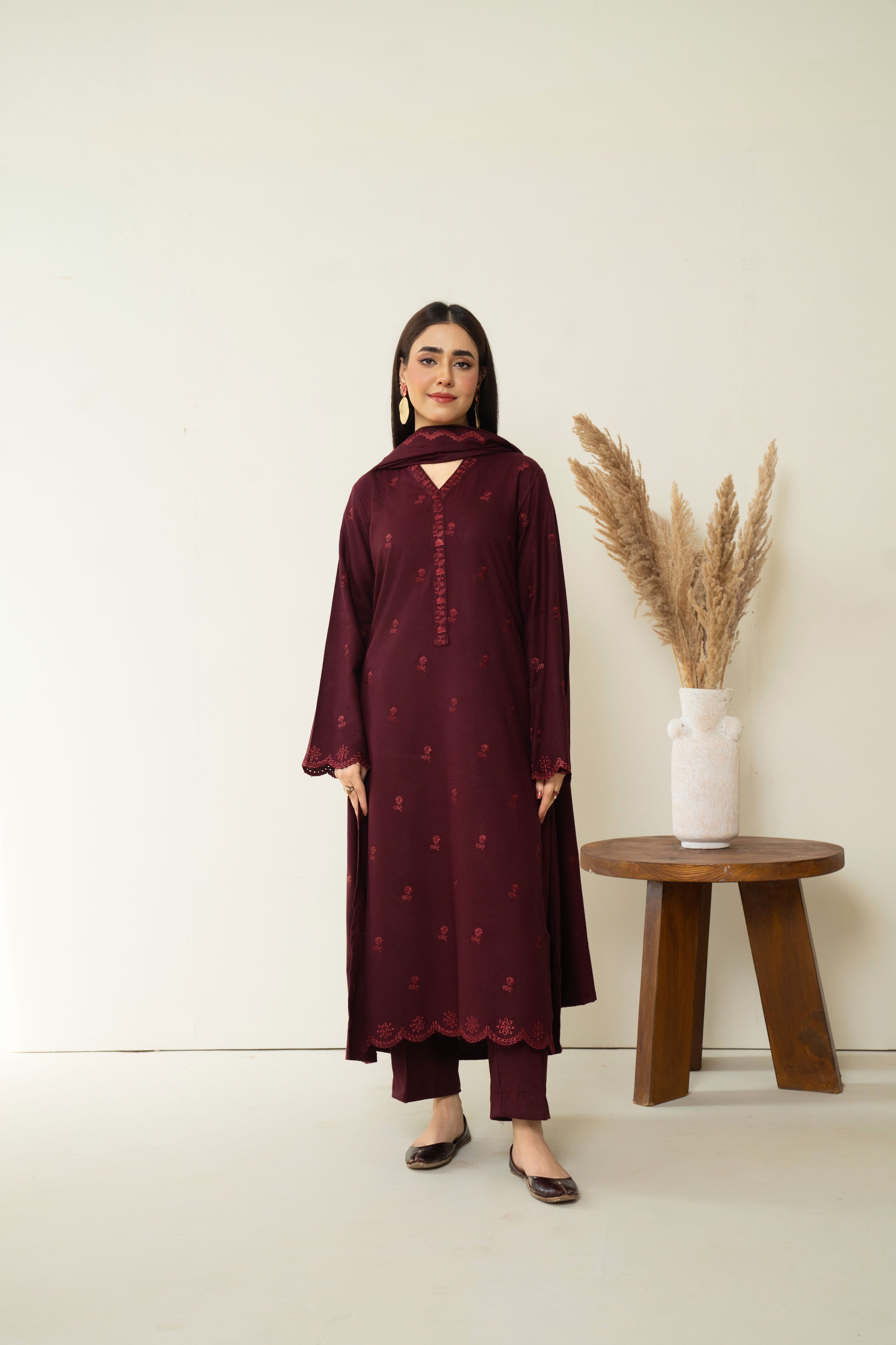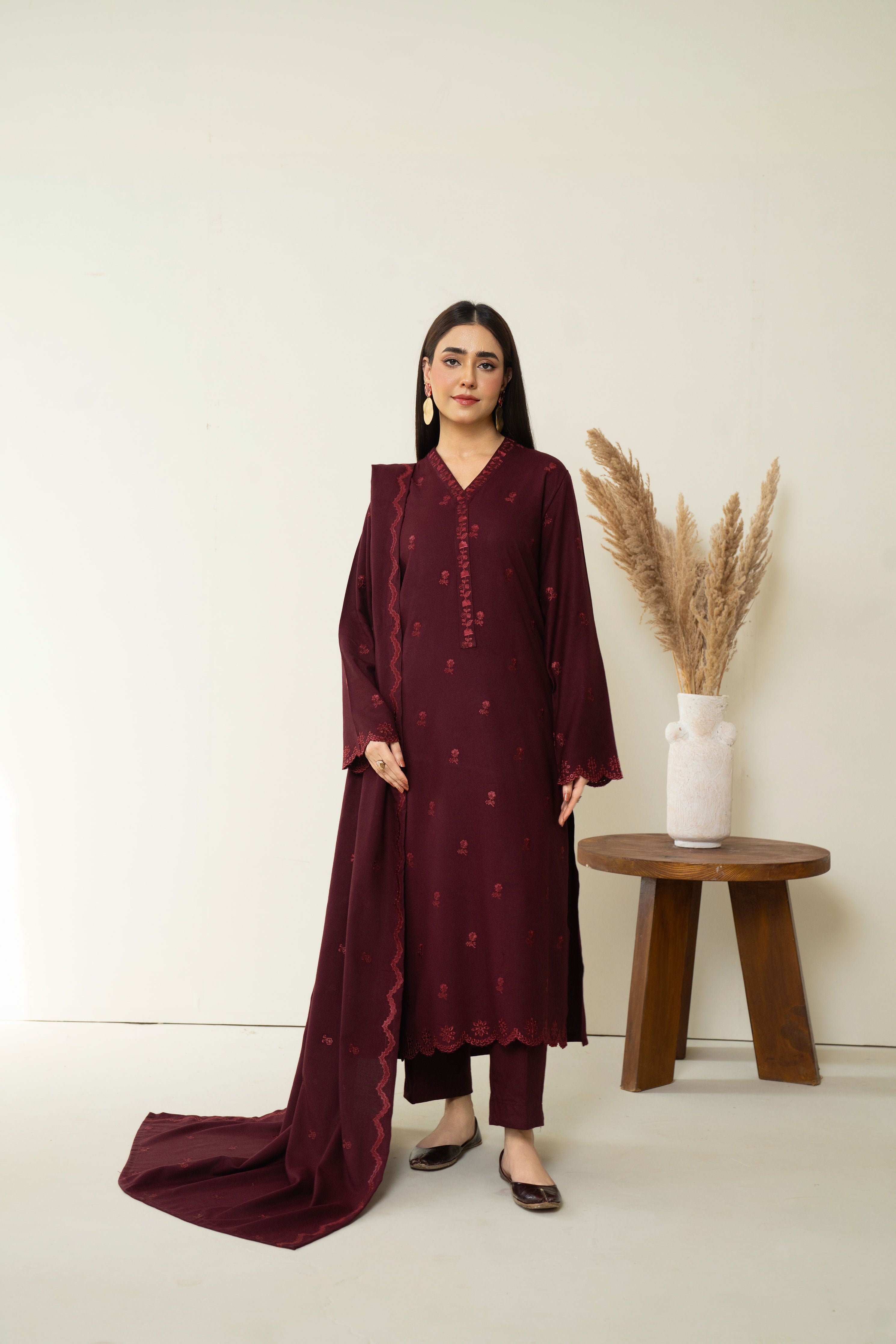 Turn heads with our captivating deep maroon ensemble. Featuring intricate embroidery on the neckline, front and sleeves, this outfit exudes timeless charm. The look is elevated with a gracefully embroidered marina shawl, perfect for any ocassion.