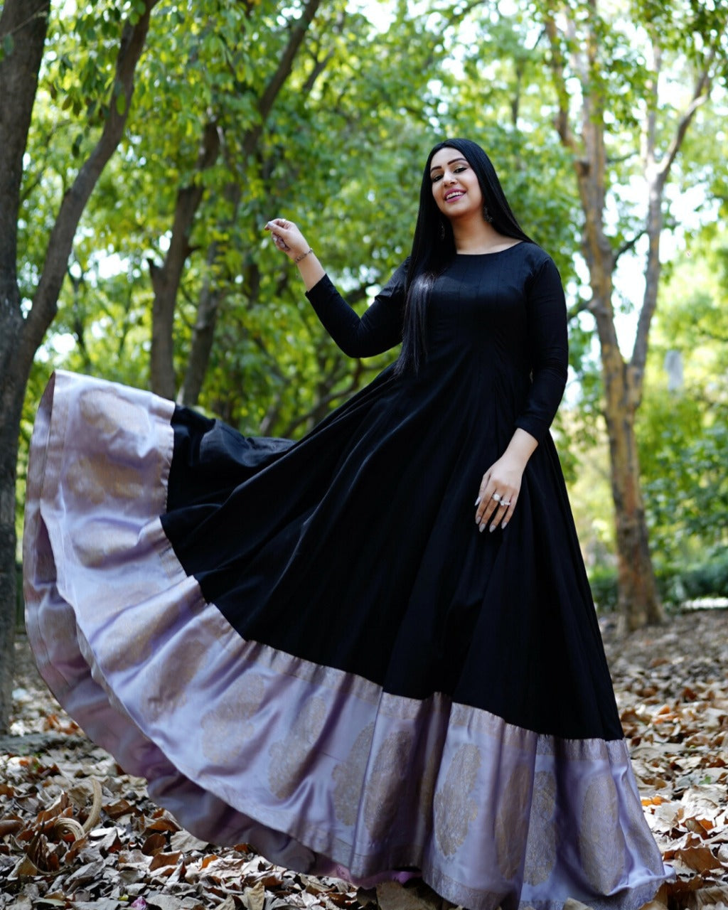 A stylish silk frock enhanced with block print detailing along the ghera, paired with a beautifully sequined chiffon dupatta. Ideal for festive and semi-formal occasions.