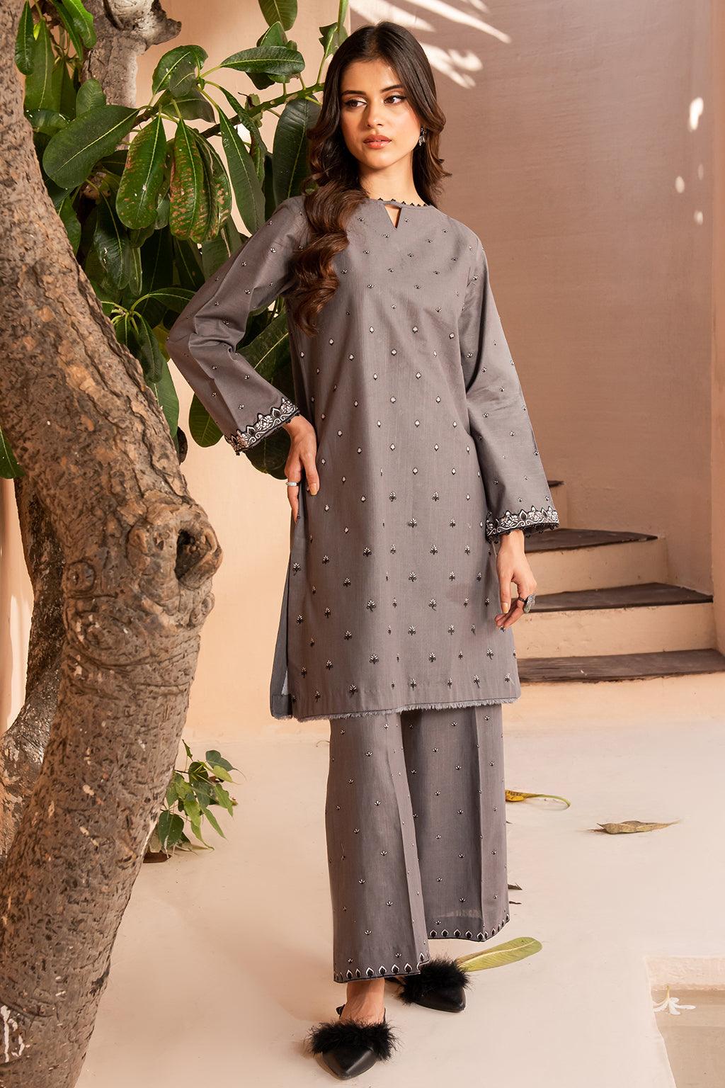 The grey khaddar article features a short shirt and relaxed fit trousers. The ensemble is adorned with intricate embroidery in subtle family tones, combining comfort with elegant detailing for a sophisticated look.