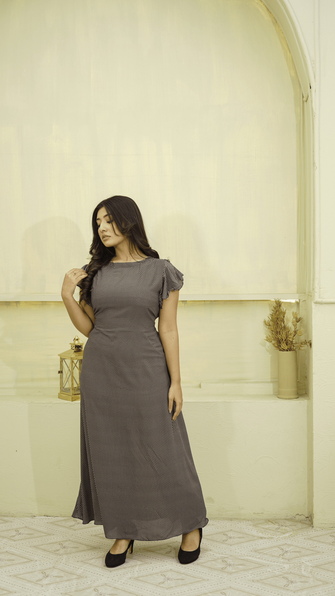 A chic gown featuring layered ruffle sleeves, a round neckline, and delicate small dot patterns. It has an attached belt for a defined waist and a flowy, elegant silhouette, perfect for special occasions.