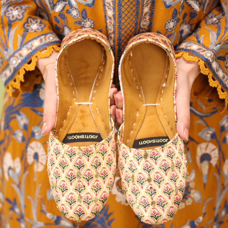 Experience the vibrant artistry of Pakistan with our "Sundus" Nawabi Khussas. Order yours today and step into handcrafted sunshine!
