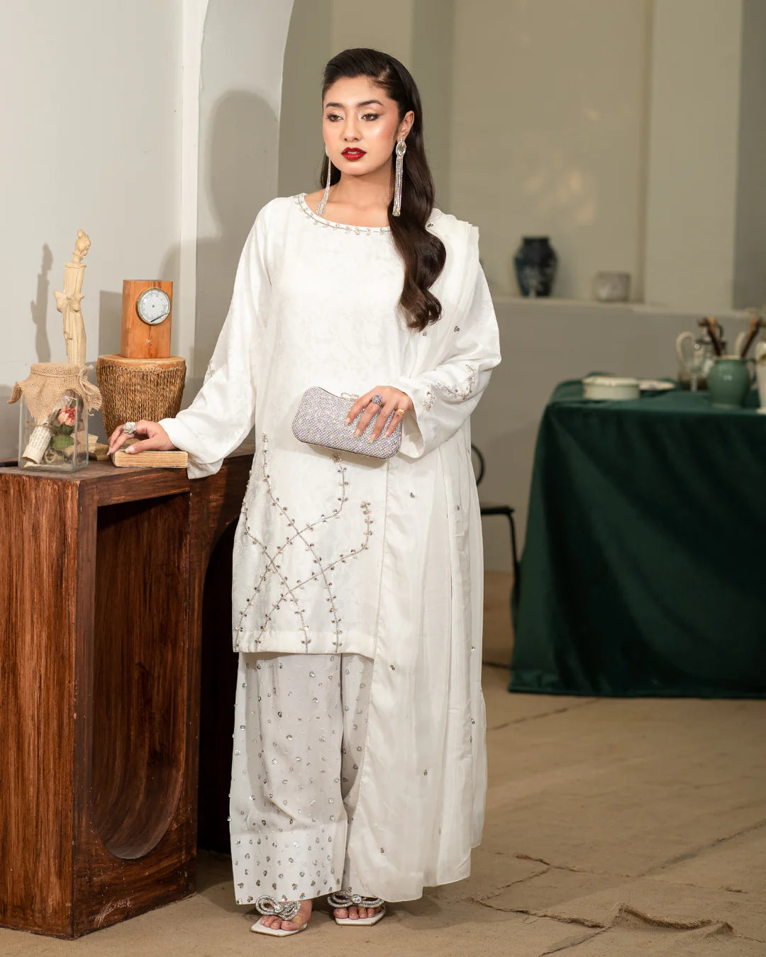 Crafted from luxurious pearl white silk with an intricate self-design texture, Swan features a refined short shirt adorned with delicate hand adda embroidery. The floral motifs on the daman and sleeves, paired with a beautifully embellished round neckline featuring pearls, Swarovski crystals, and leaf-shaped diamonds, create a shimmering effect that radiates understated luxury.
