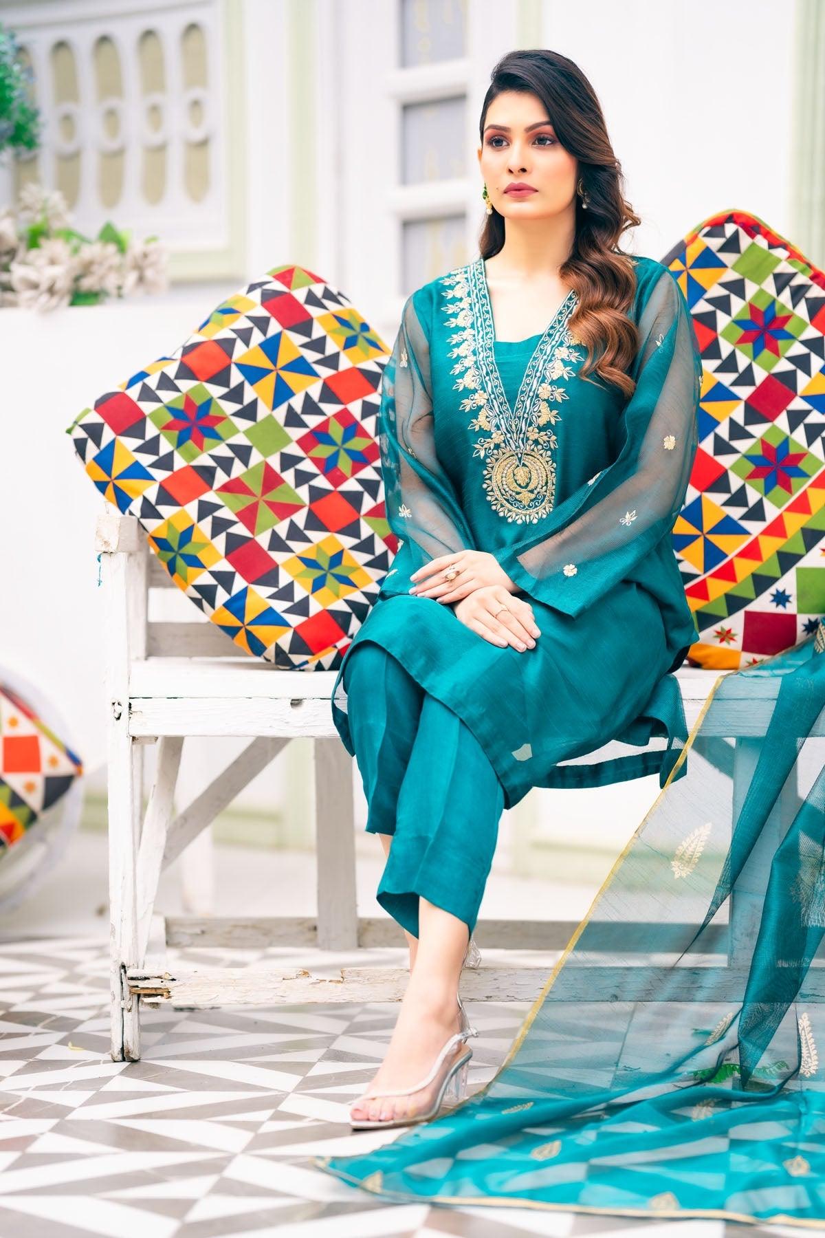 Indulge in the ethereal allure of our Teal Tempest , where classic sophistication meets a touch of modern mystique. This ensemble is a canvas of elegance and allure, featuring a straight-cut silhouette adorned with intricate piping and an enchanting blend of 3D mashed gotti and double-shaded tilla work on the shirt.
