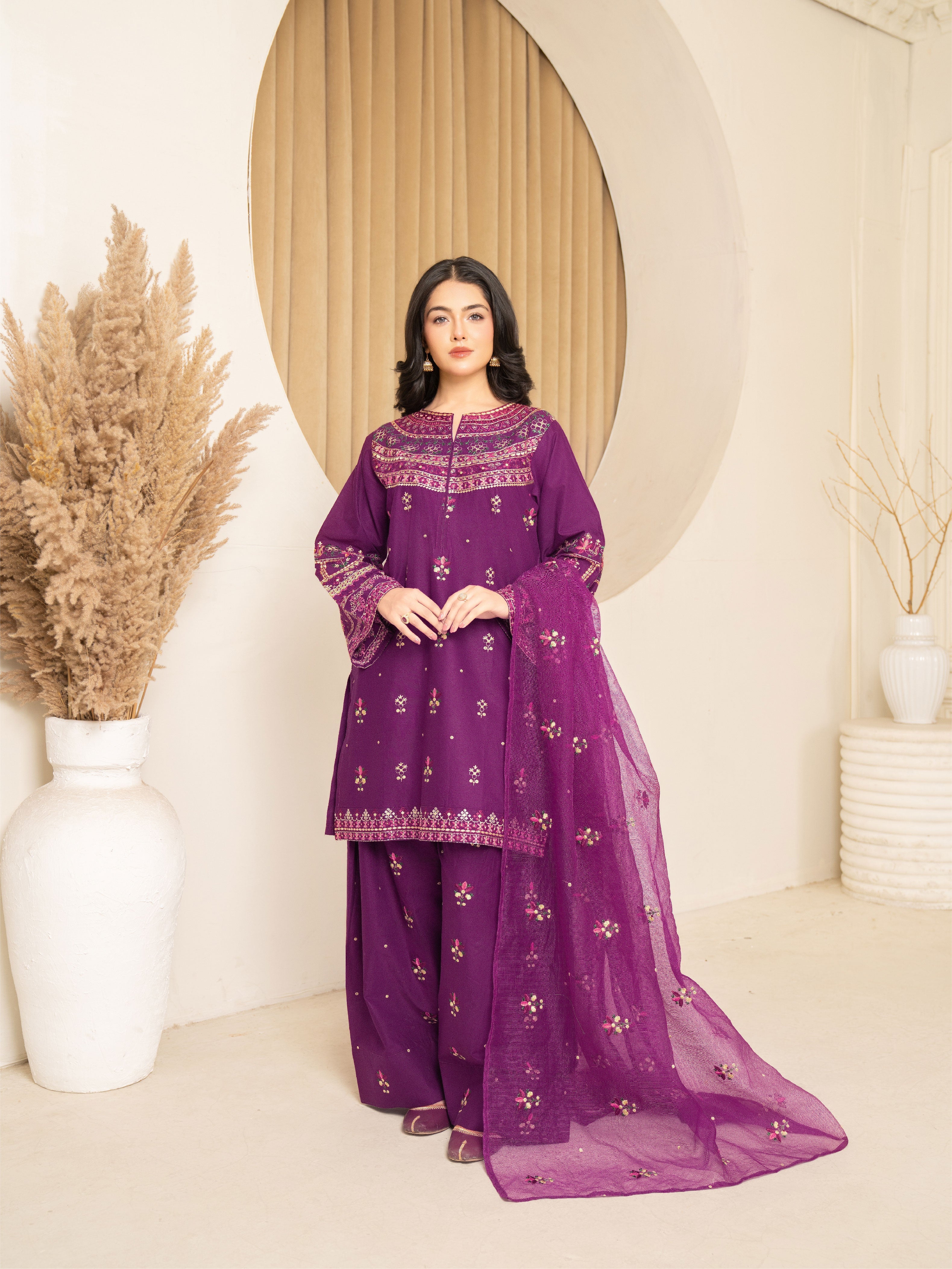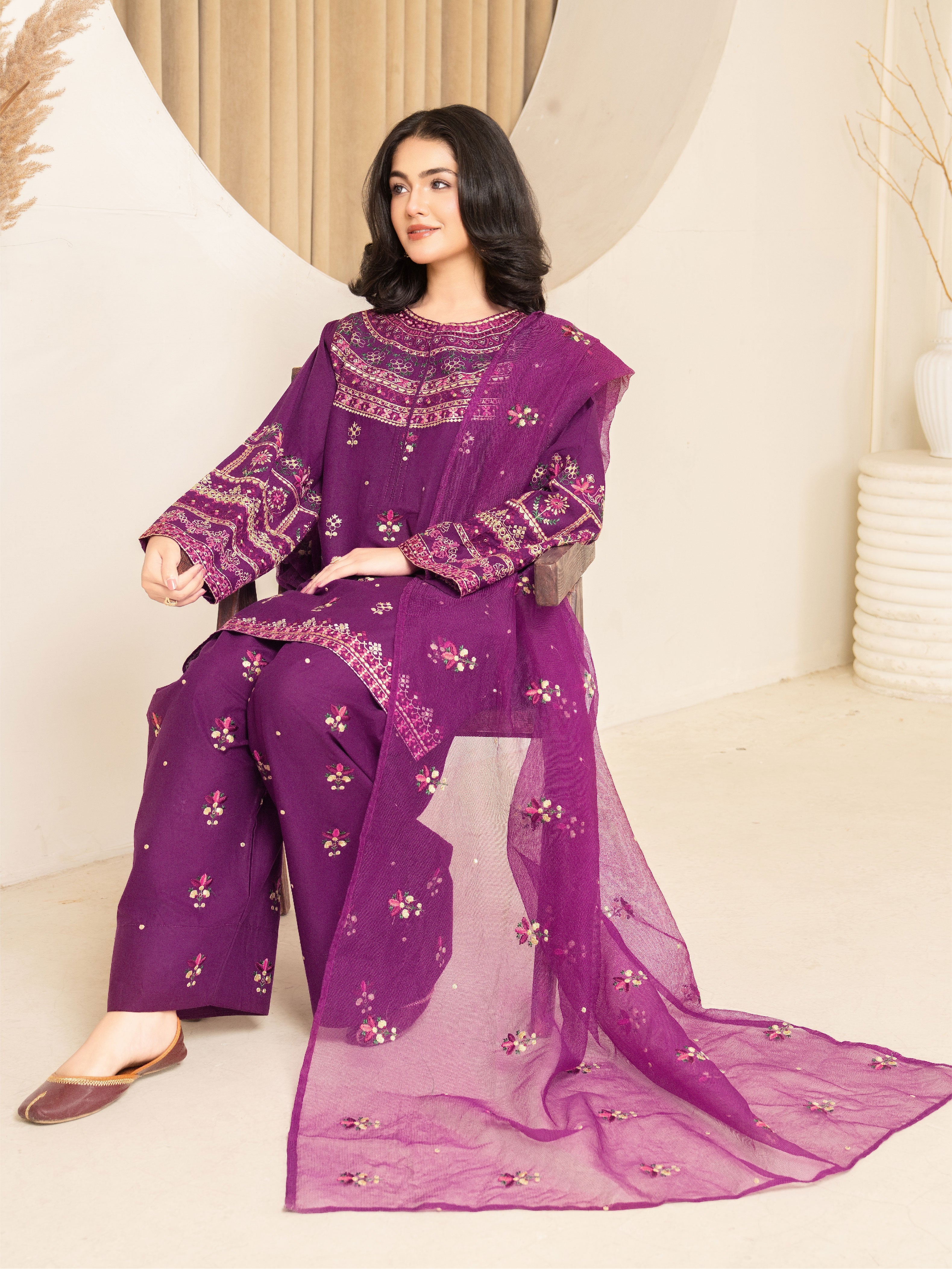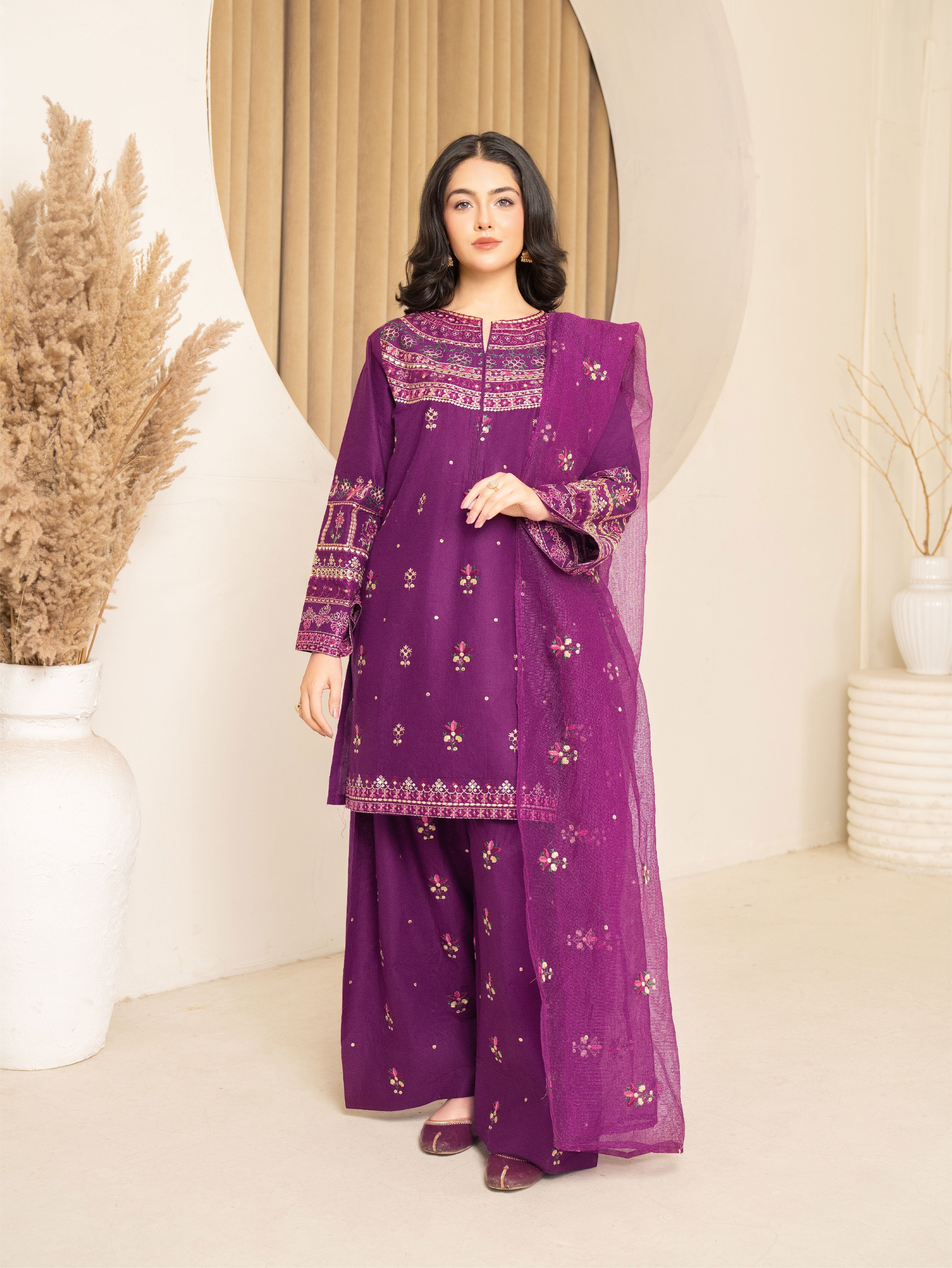 Experience elegance with our exquisite purple Ufaq ensemble. This article features a embroidered short shirt with a embroidered farshi shalwar along with a embroidered cotton net dupatta.