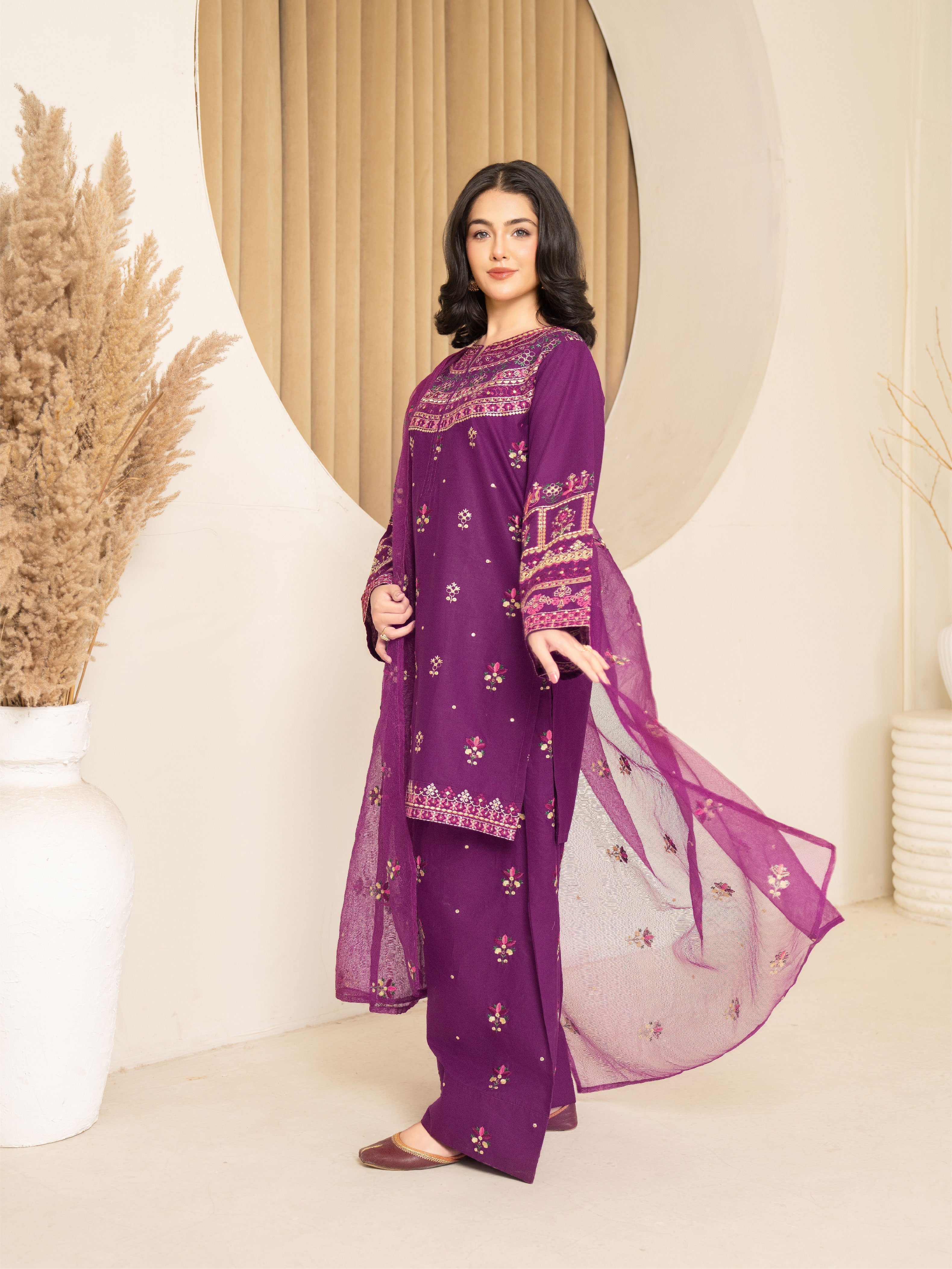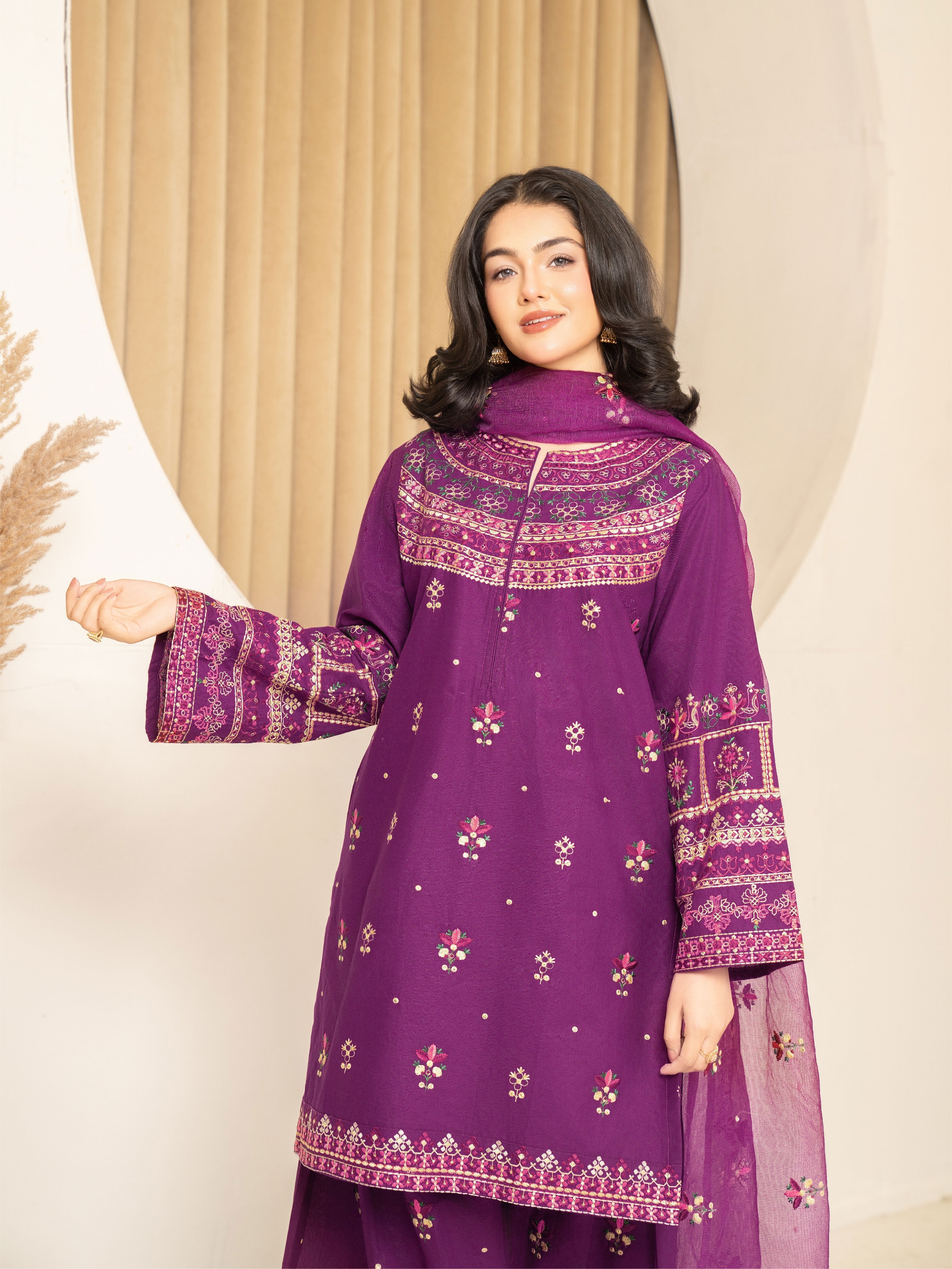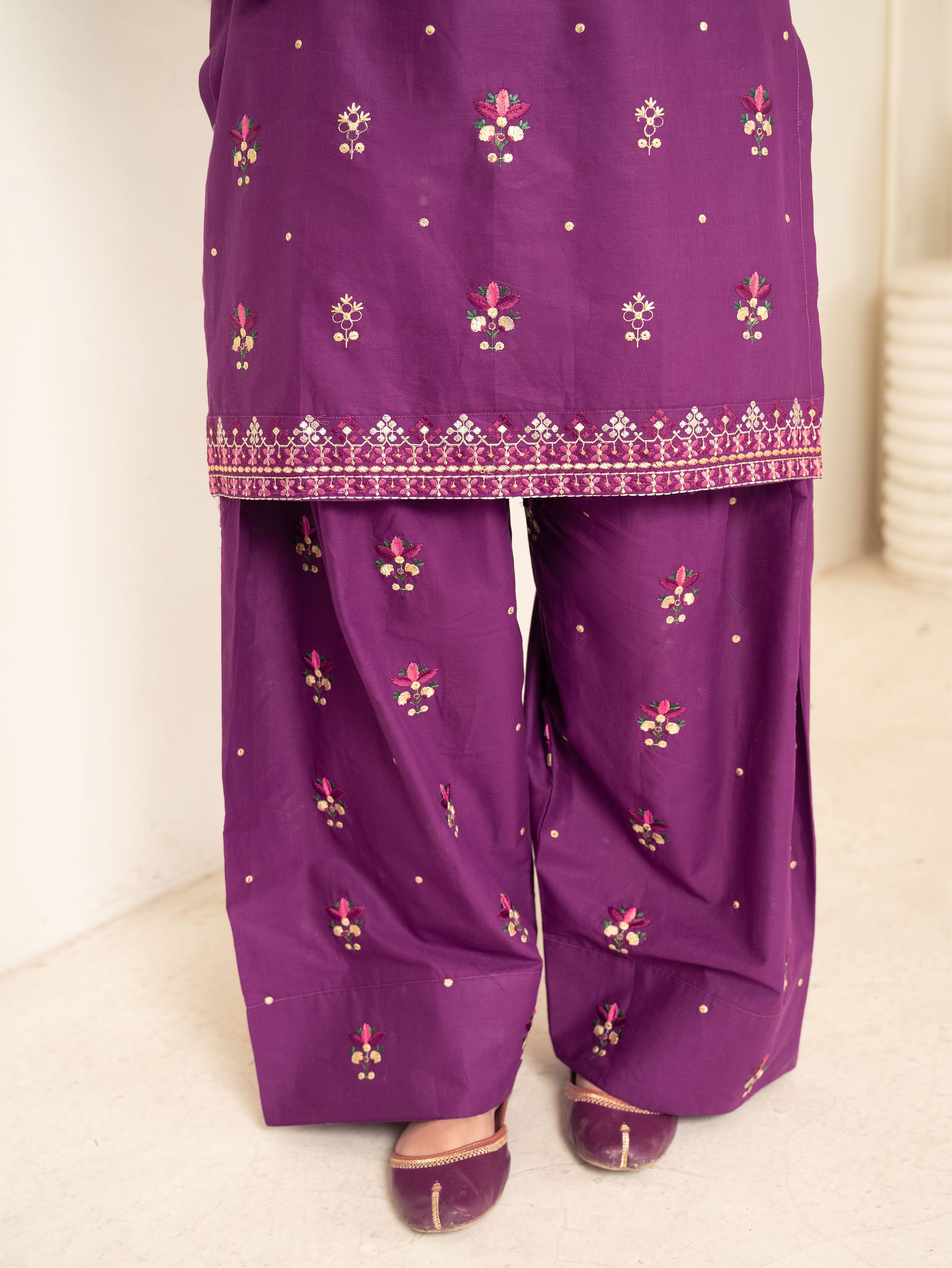 Experience elegance with our exquisite purple Ufaq ensemble. This article features a embroidered short shirt with a embroidered farshi shalwar along with a embroidered cotton net dupatta.