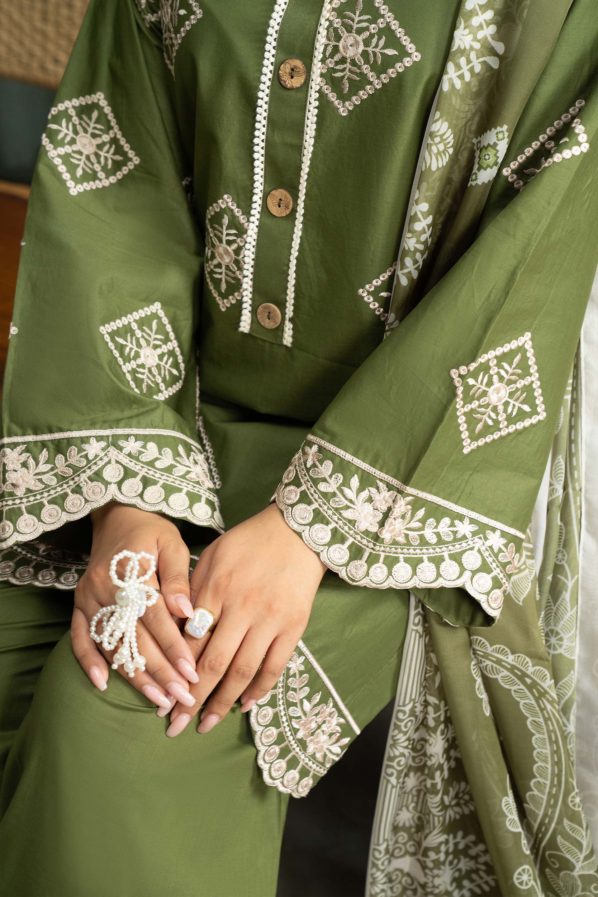 The Vana Lawn Embroidered 3 Piece Stitched set in vibrant green features a soft cotton lawn shirt with detailed embroidery, combining elegance and comfort. It pairs with matching cotton lawn stylish bell bottoms that offer a graceful and contemporary silhouette. The silk printed dupatta adds a refined, luxurious touch, completing this sophisticated ensemble perfect for various occasions.