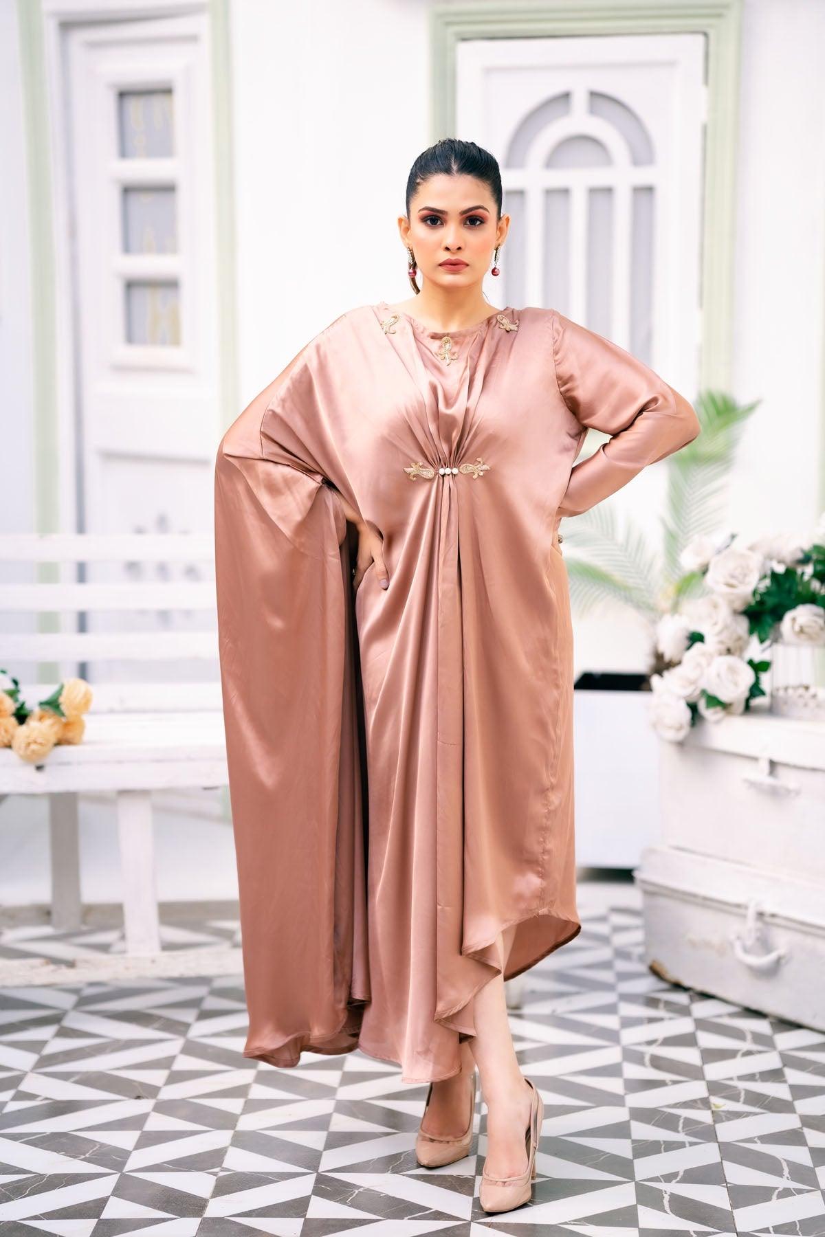 Step into an opulent dreamland with our breathtaking Rose Gold Kaftan, a dazzling masterpiece that embodies sheer glamour and timeless elegance. Crafted from the finest silk, this caftan envelops you in an ethereal embrace, draping you in luxurious comfort while radiating an air of sophistication.
