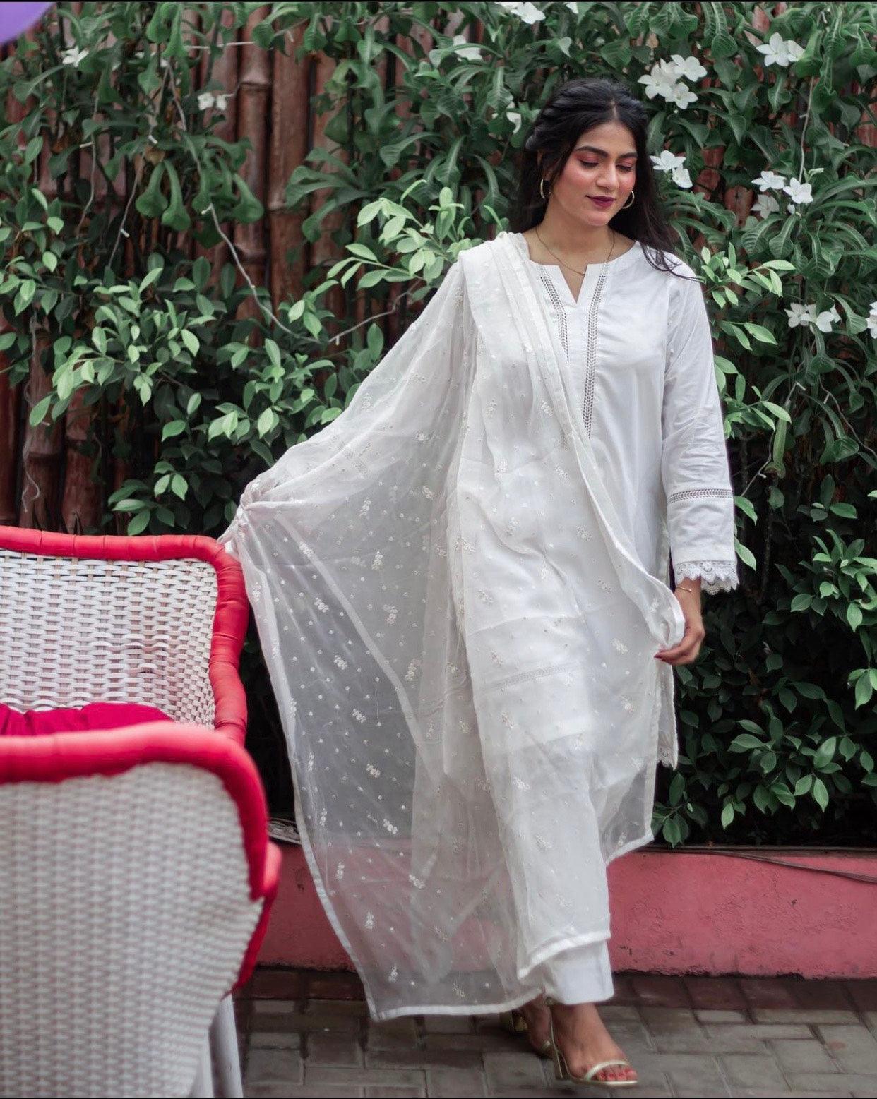 It’s a white cotton three piece dress with lace detailing on neck, sleeves and daman along with embroidered chiffon dupatta.