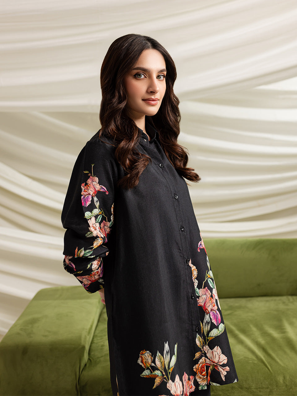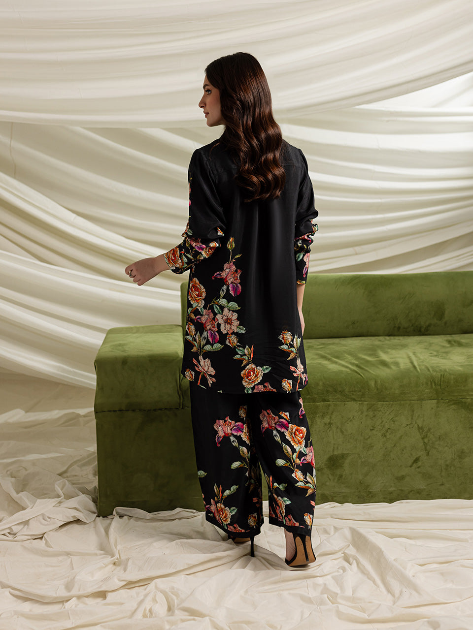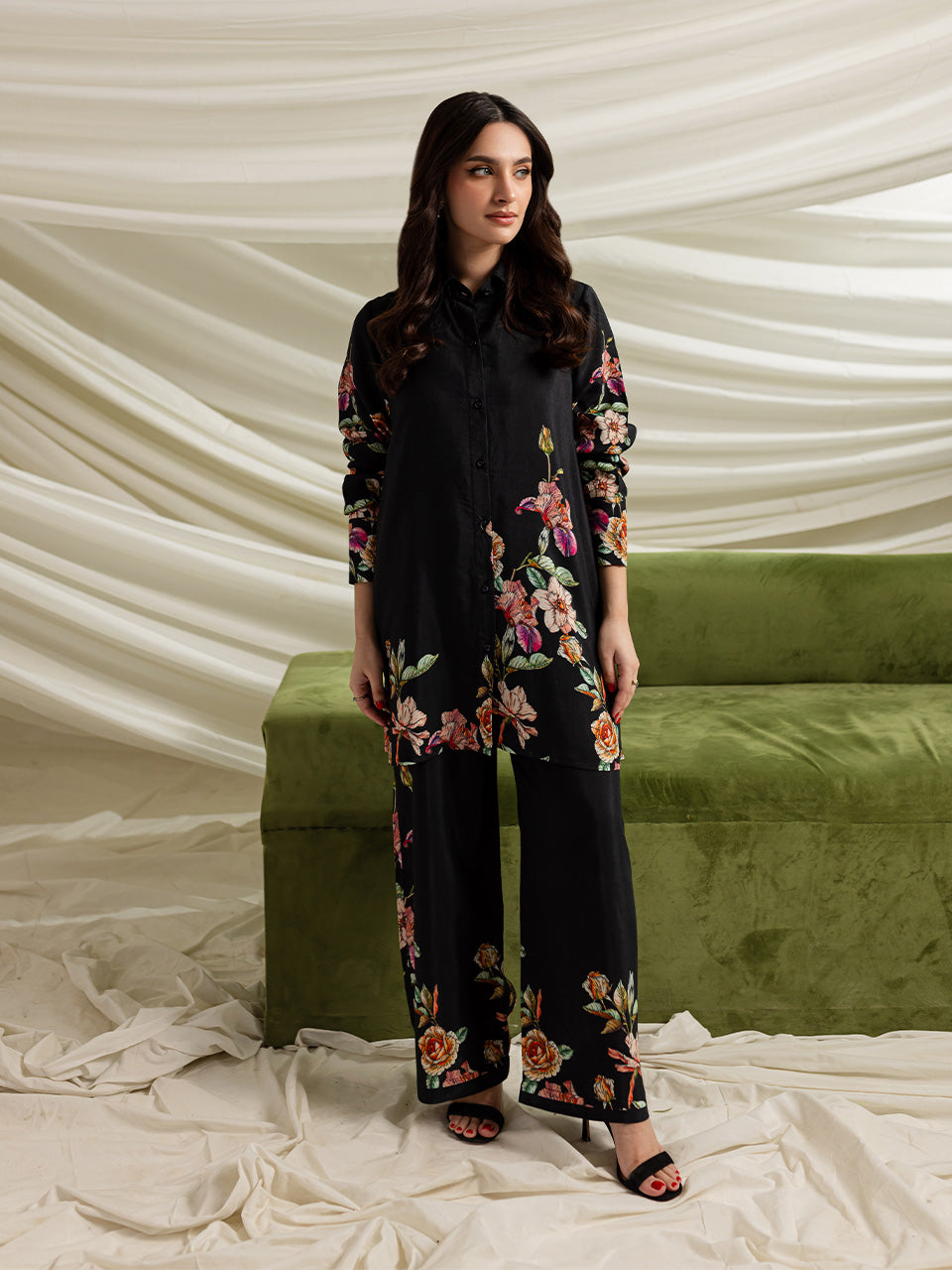 Description: This deep black cotton silk ensemble features vibrant floral patterns on a tunic and wide-legged pants. With a relaxed fit and elegant button-down front, it combines traditional elegance with modern flair, making it perfect for formal occasions.