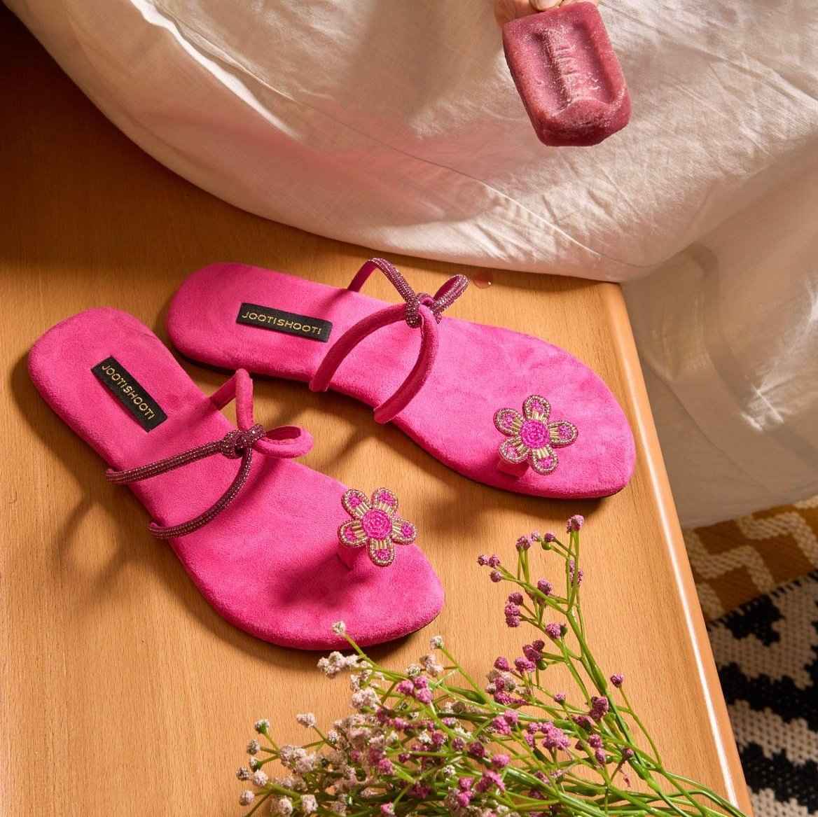 Designed with a rich fuchsia suede base and embellished straps these slides are adorned with an intricate fuchsia and gold embroidered and embellished floral motif, these slides are the perfect pop of color for your summer outfits. Ideal for those breezy days, they’re a must-have addition to your wardrobe.