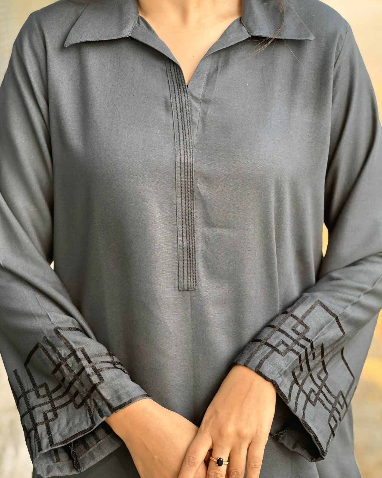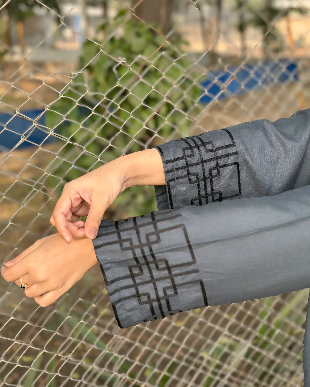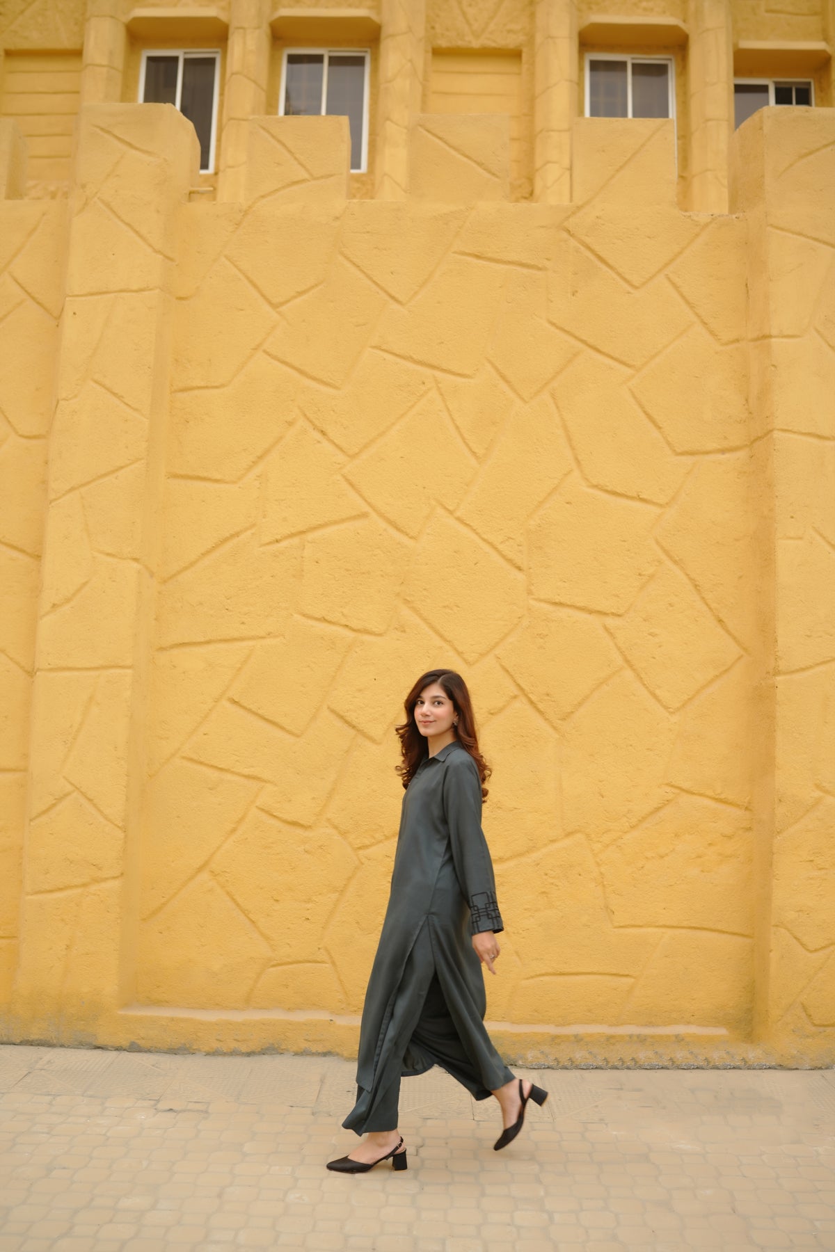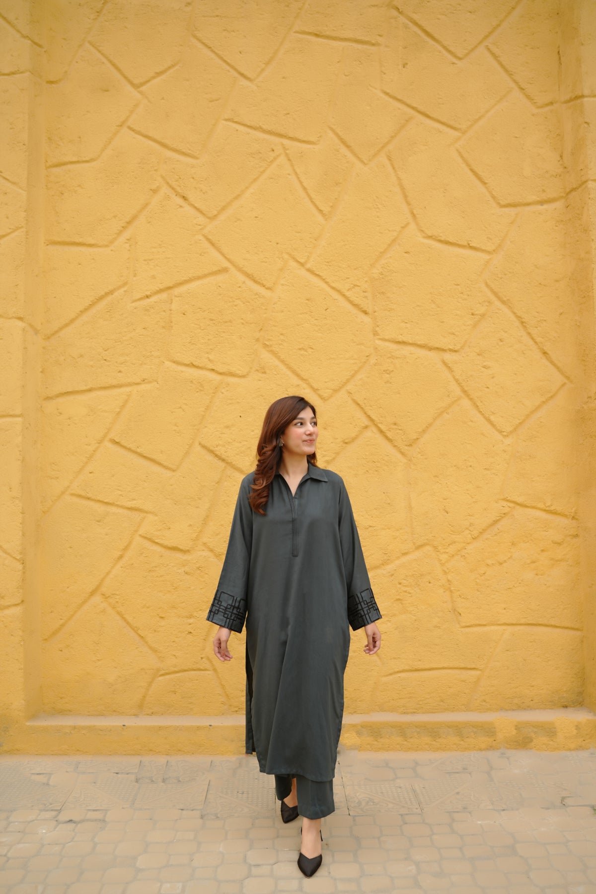Graceful and elegant, the grey ensemble in Stapple Karandi captures both simplicity and style. The long A-line shirt offers a flattering fit, complemented by the loose trousers for ultimate comfort. The soft grey color makes it perfect for both casual and more formal occasions, providing a versatile addition to your wardrobe.