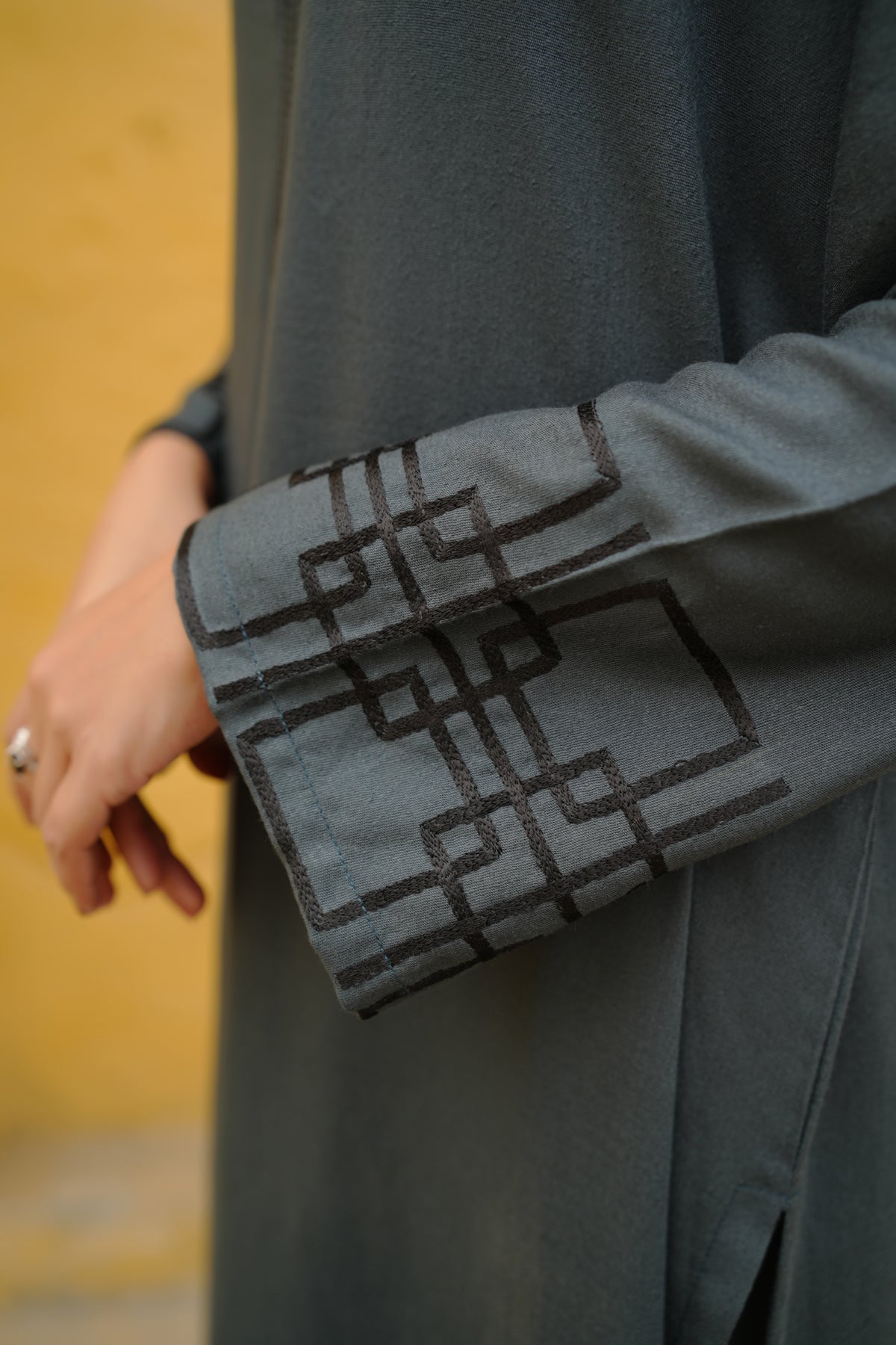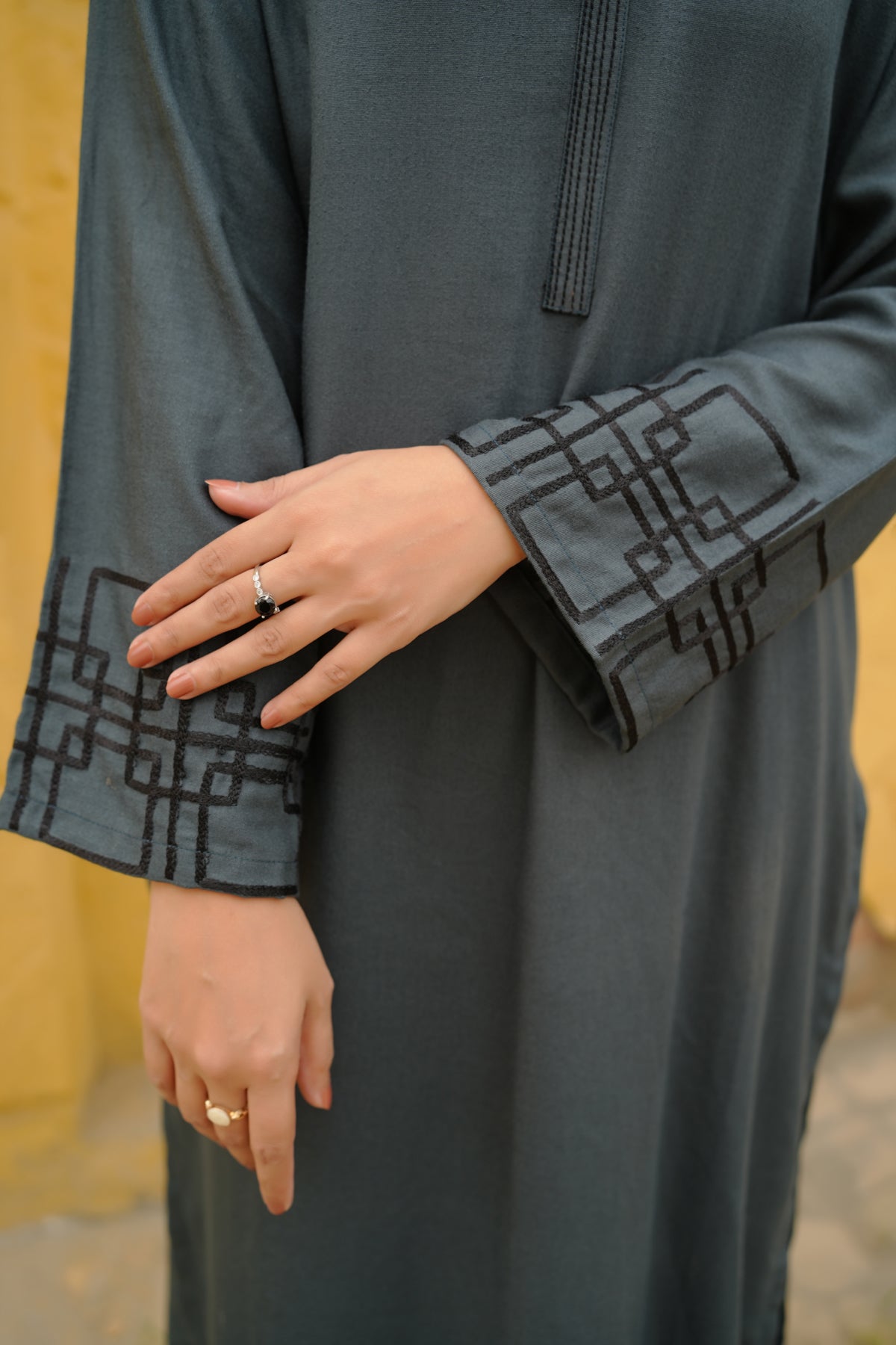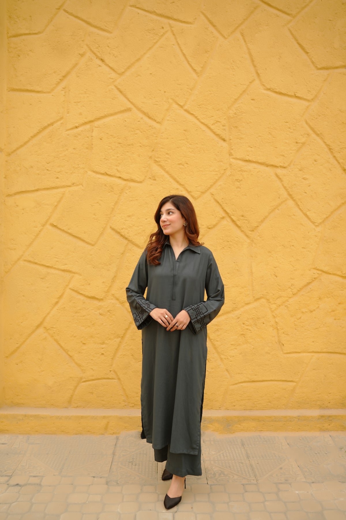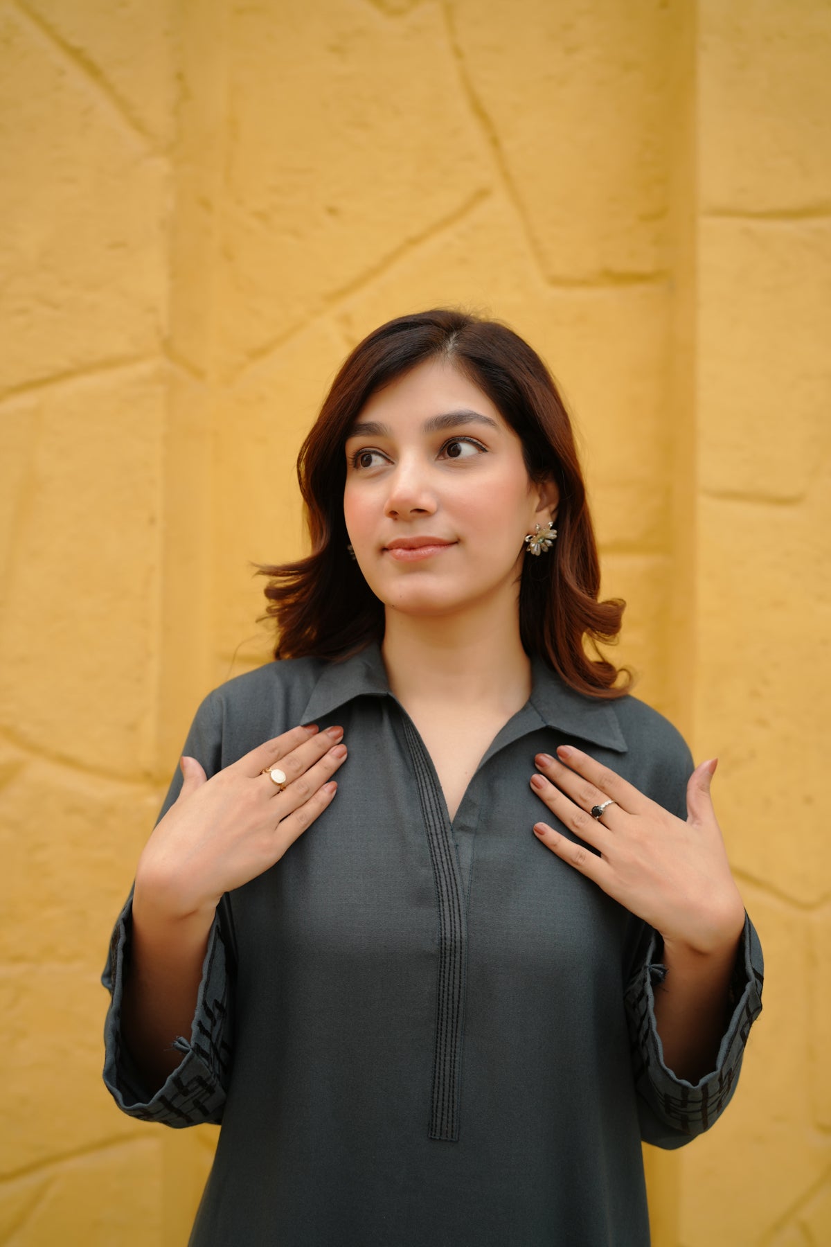 Graceful and elegant, the grey ensemble in Stapple Karandi captures both simplicity and style. The long A-line shirt offers a flattering fit, complemented by the loose trousers for ultimate comfort. The soft grey color makes it perfect for both casual and more formal occasions, providing a versatile addition to your wardrobe.