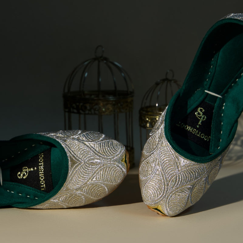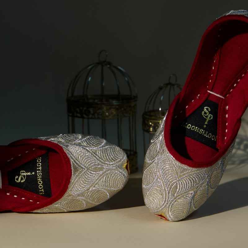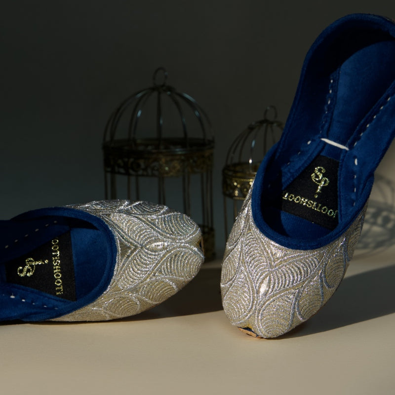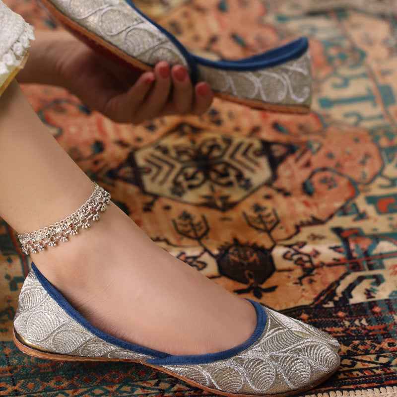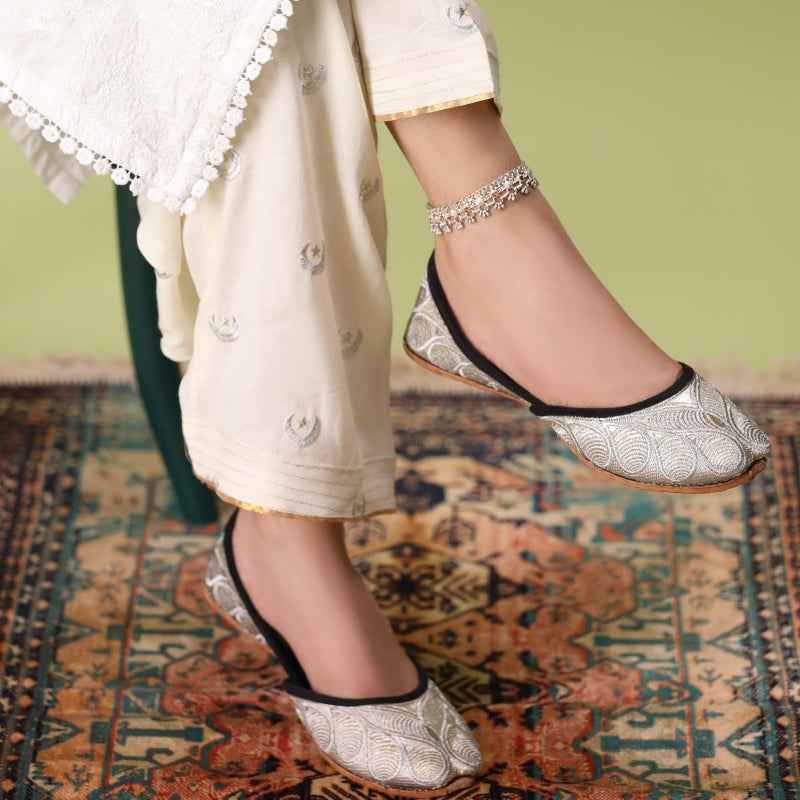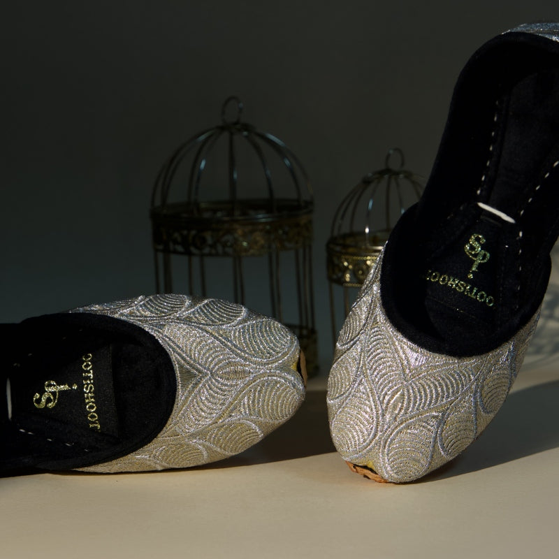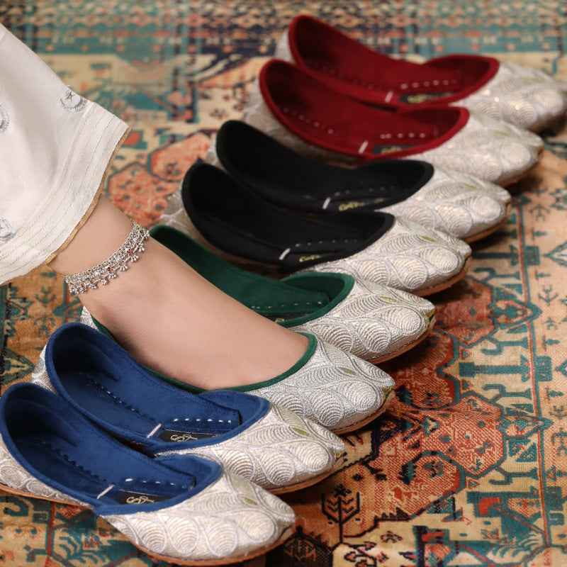 Our Zari Zewar Khussas features intricate metallic-zari embroidery woven across a gold shimmery base, edged with velvet piping and finished with a soft velvet insole for luxurious comfort. As each pair is entirely handcrafted, subtle variations in thread density and pattern placement make yours uniquely exquisite. Style them with a jewel-toned sharara set and statement oxidized jewelry for festive occasions, or pair with slim trousers and a flowing silk kurta for evening elegance. To preserve the delicate zari work, gently blot away any dirt with a soft, dry cloth and store in a cool, dry place—preferably in a dust bag—away from direct sunlight.