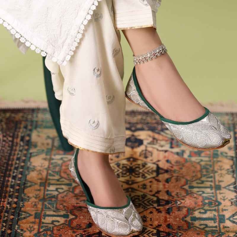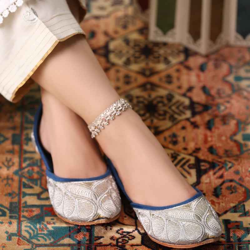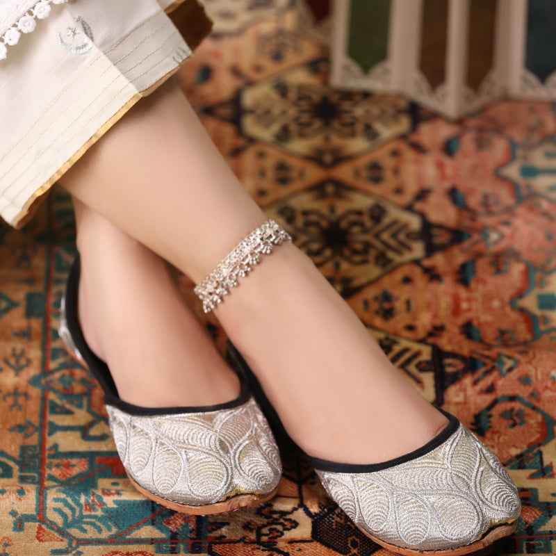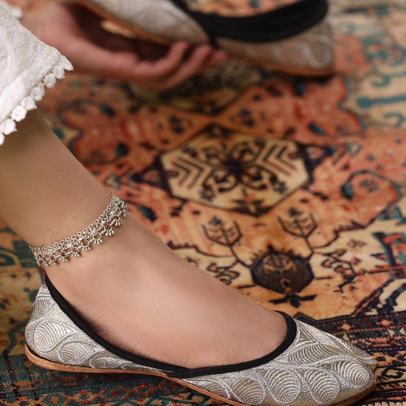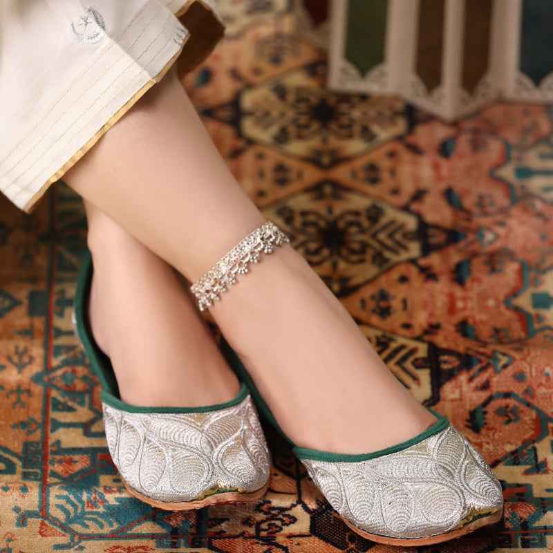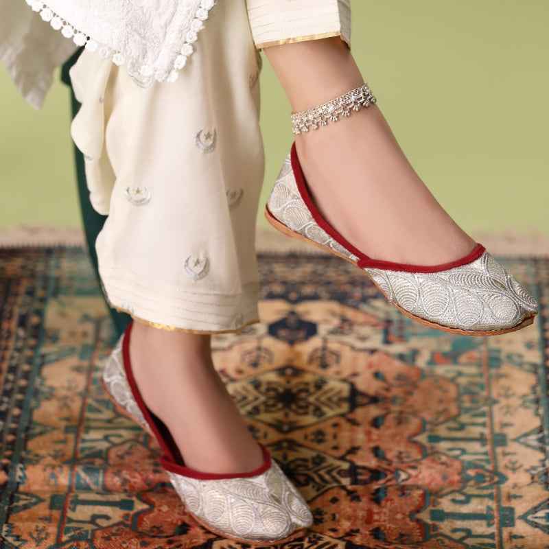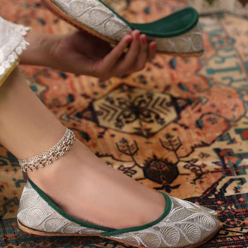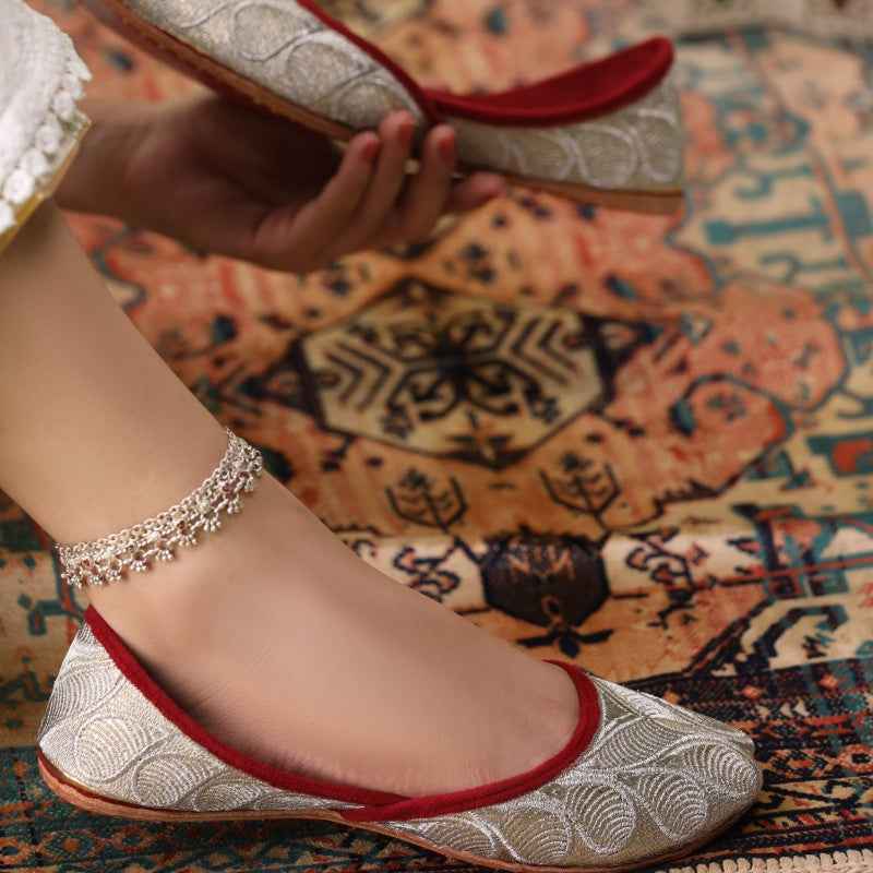 Our Zari Zewar Khussas features intricate metallic-zari embroidery woven across a gold shimmery base, edged with velvet piping and finished with a soft velvet insole for luxurious comfort. As each pair is entirely handcrafted, subtle variations in thread density and pattern placement make yours uniquely exquisite. Style them with a jewel-toned sharara set and statement oxidized jewelry for festive occasions, or pair with slim trousers and a flowing silk kurta for evening elegance. To preserve the delicate zari work, gently blot away any dirt with a soft, dry cloth and store in a cool, dry place—preferably in a dust bag—away from direct sunlight.