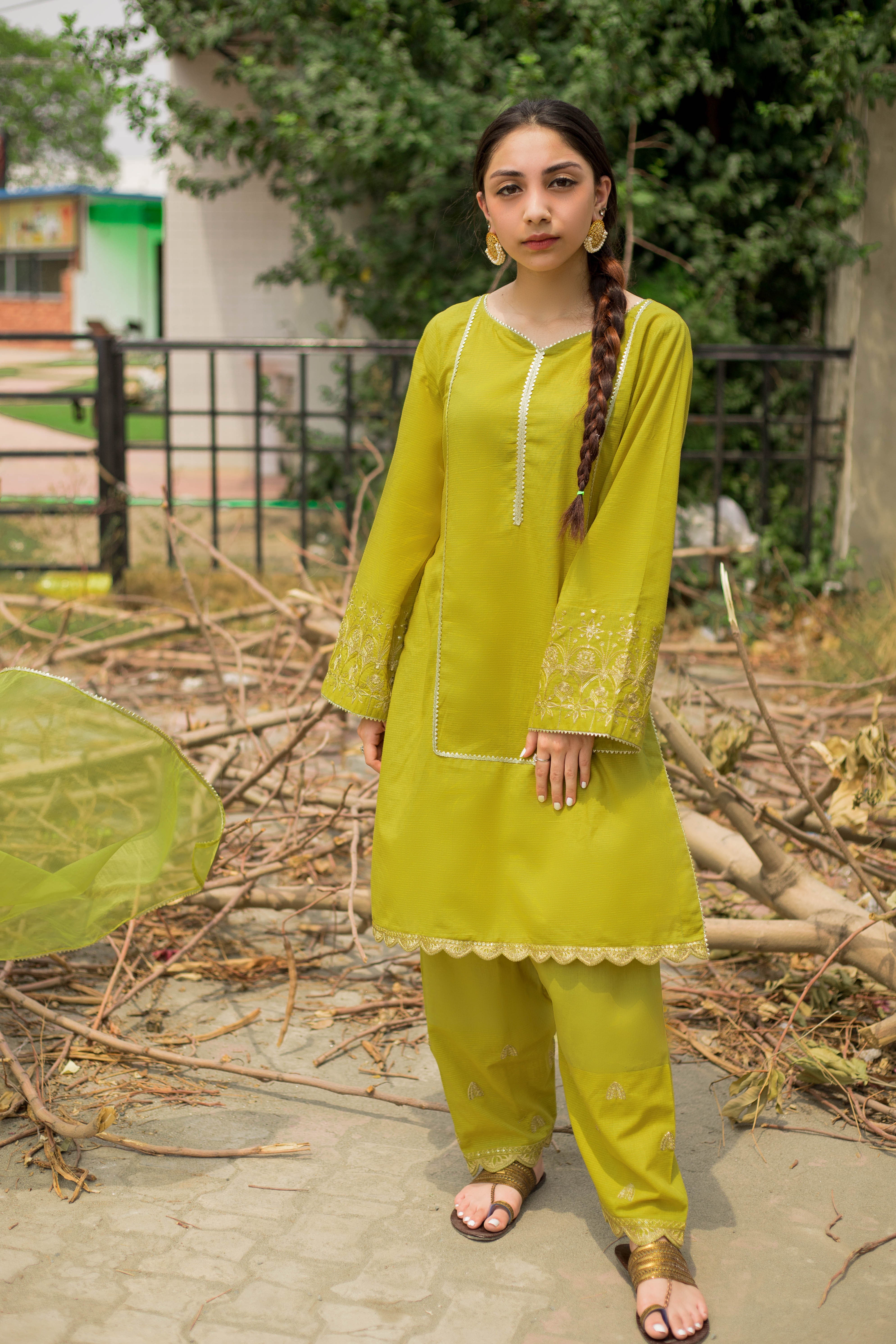 Regular length shirt with shalwar and organza dupatta shirt is self cotton embellished with embroidery and sequins, stitched in a stylized way, finished with lace.Shalwar is plain cotton embellished with embroidery and sequins, stitched in a stylized way. Dupatta is organza finished with lace.