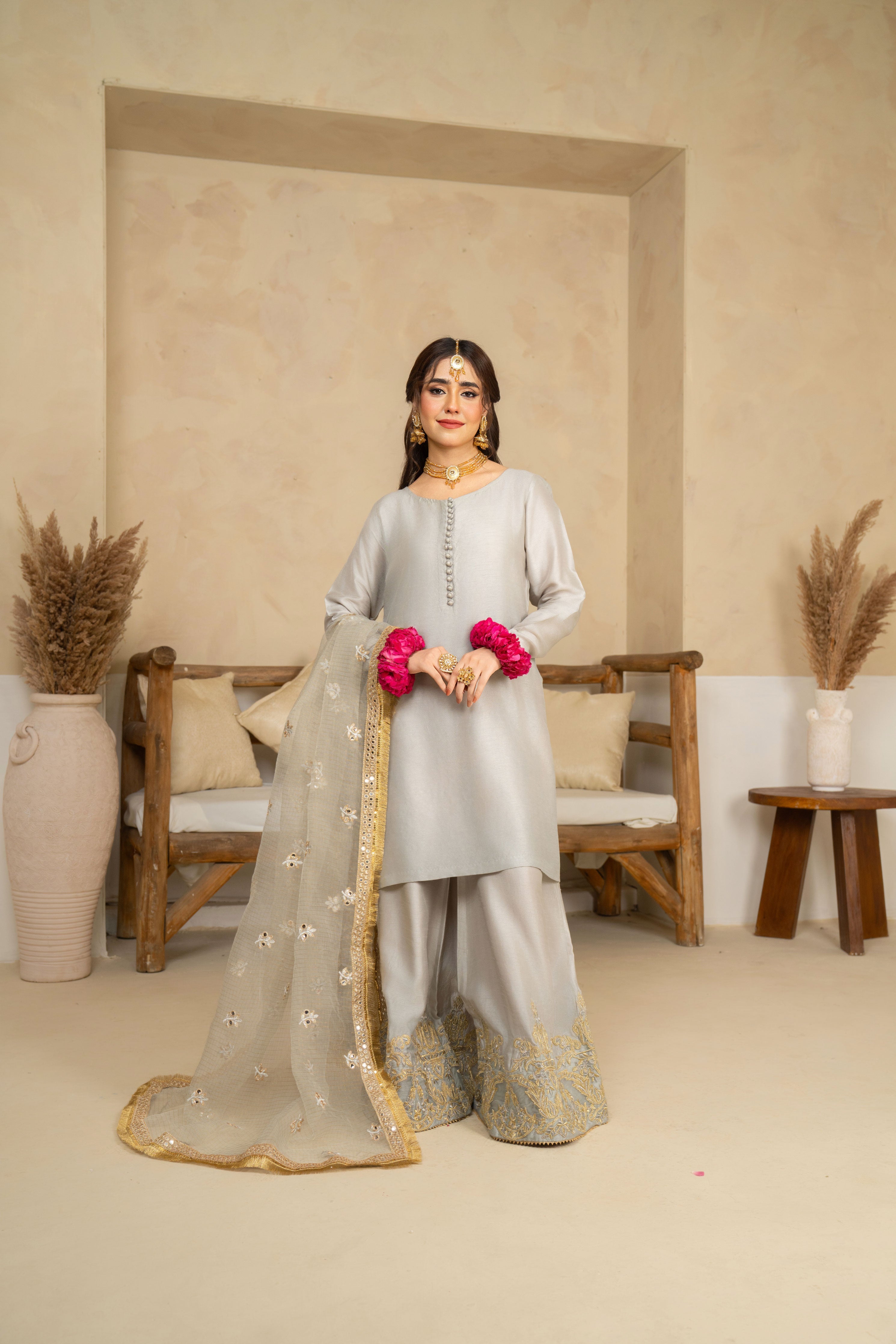 A statement of timeless luxury, this grey ensemble, crafted from premium quality Korean silk, features a chic short shirt adorned with elegant loop-hole buttons. It is paired with beautifully embroidered flared pants, creating a graceful silhouette. The look is completed with an all-over embroidered dupatta, embellished with delicate lace and shimmering kiran detailing, adding the perfect festive charm.