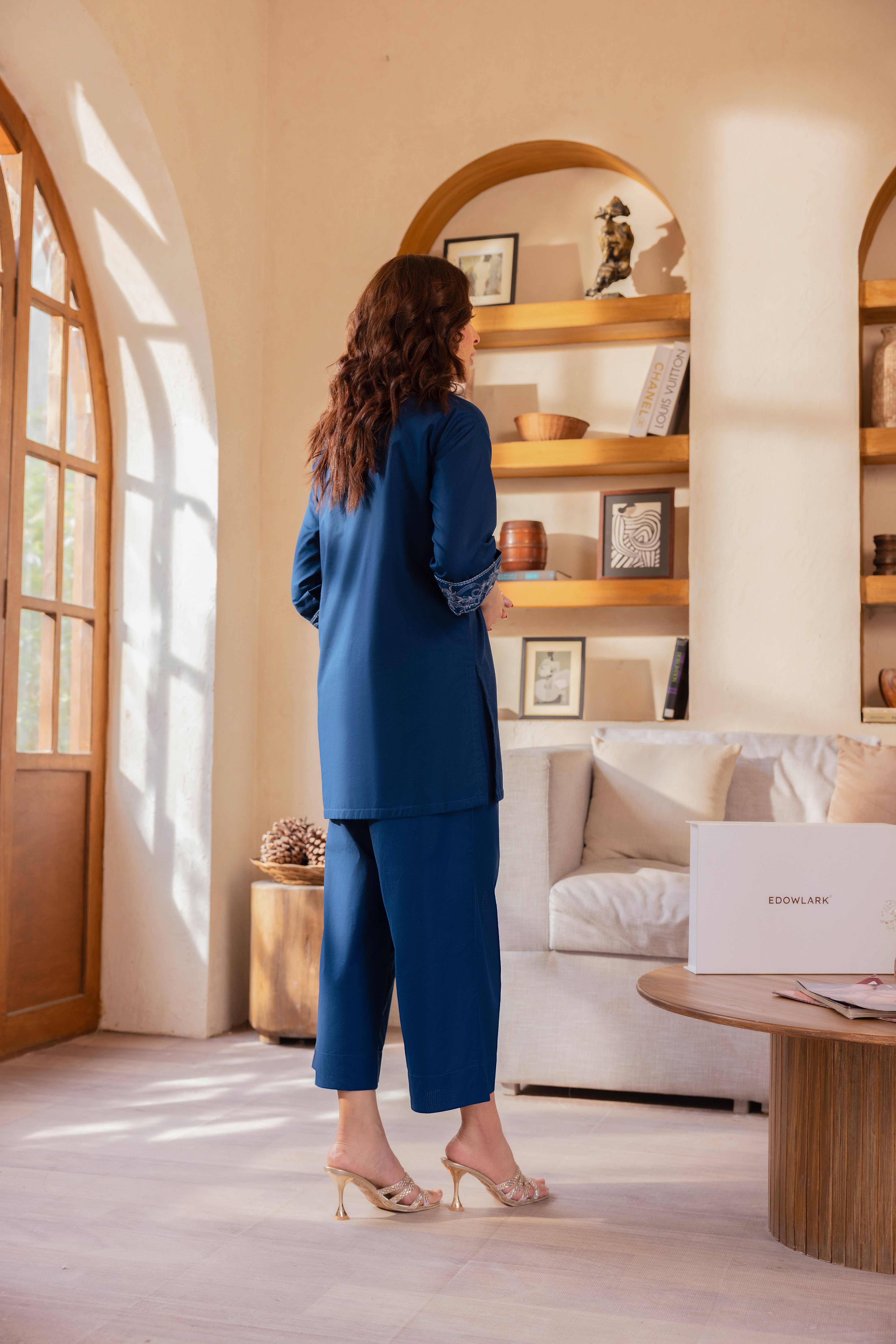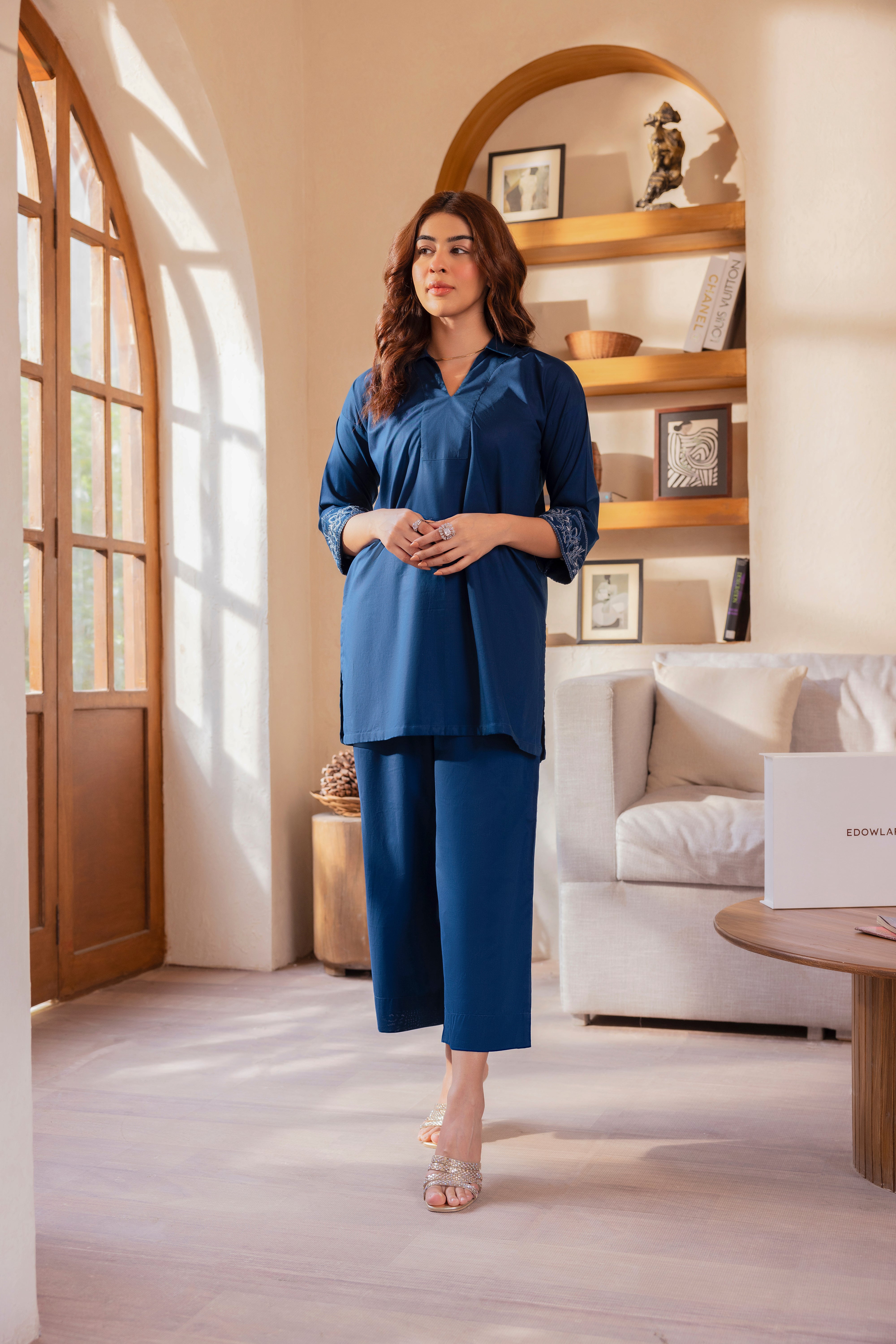 Zinc matching set with a V-neck collar shirt, oversized-shoulder cutline and folded embroidered cuffs with culottes’ pants offers a modern twist on classic sophistication, perfect for versatile styling.